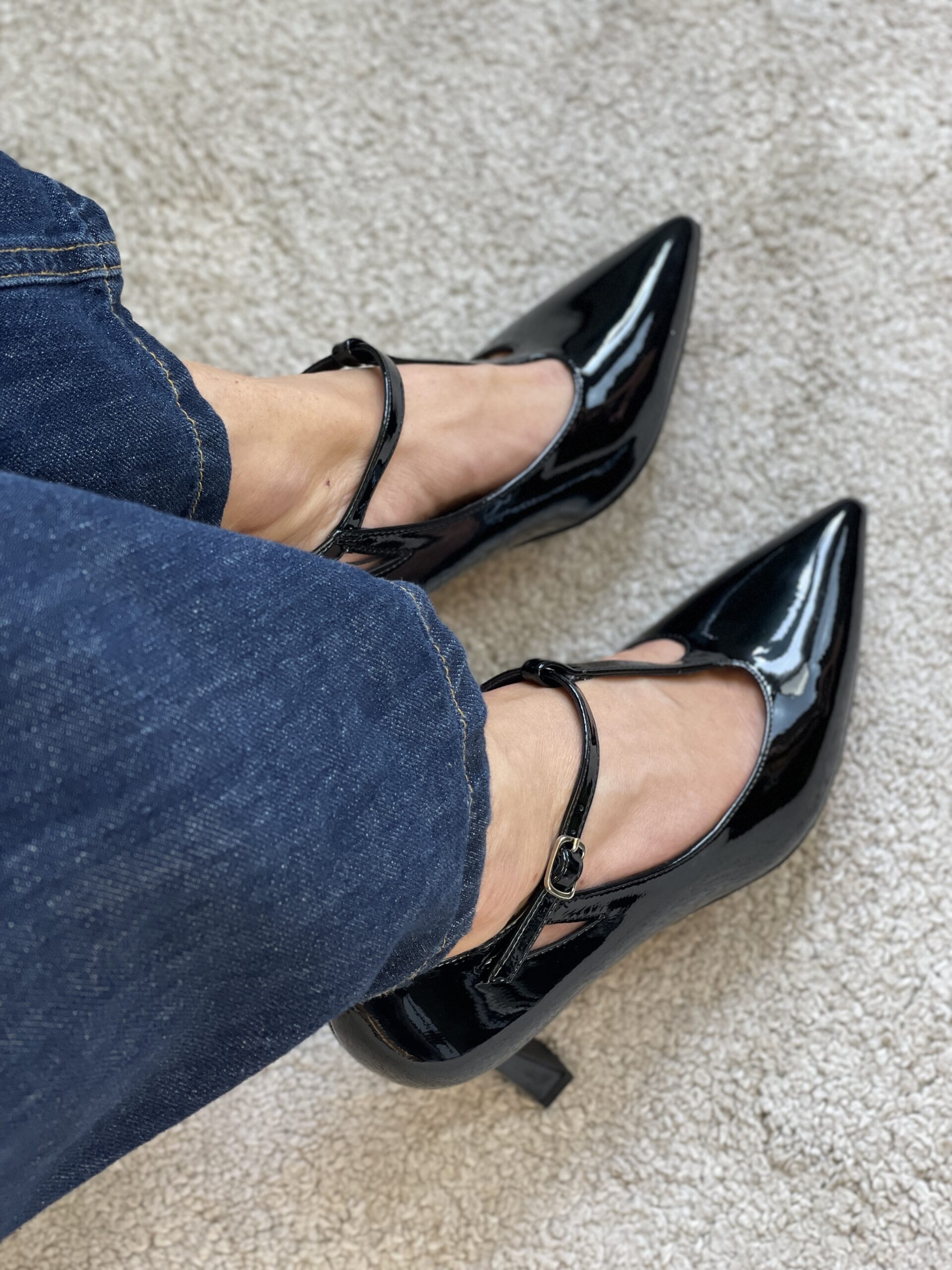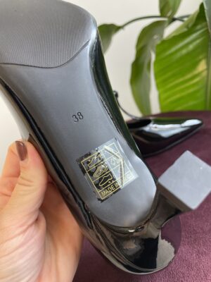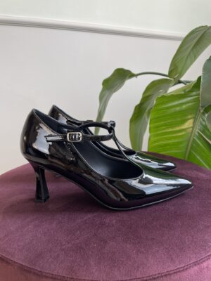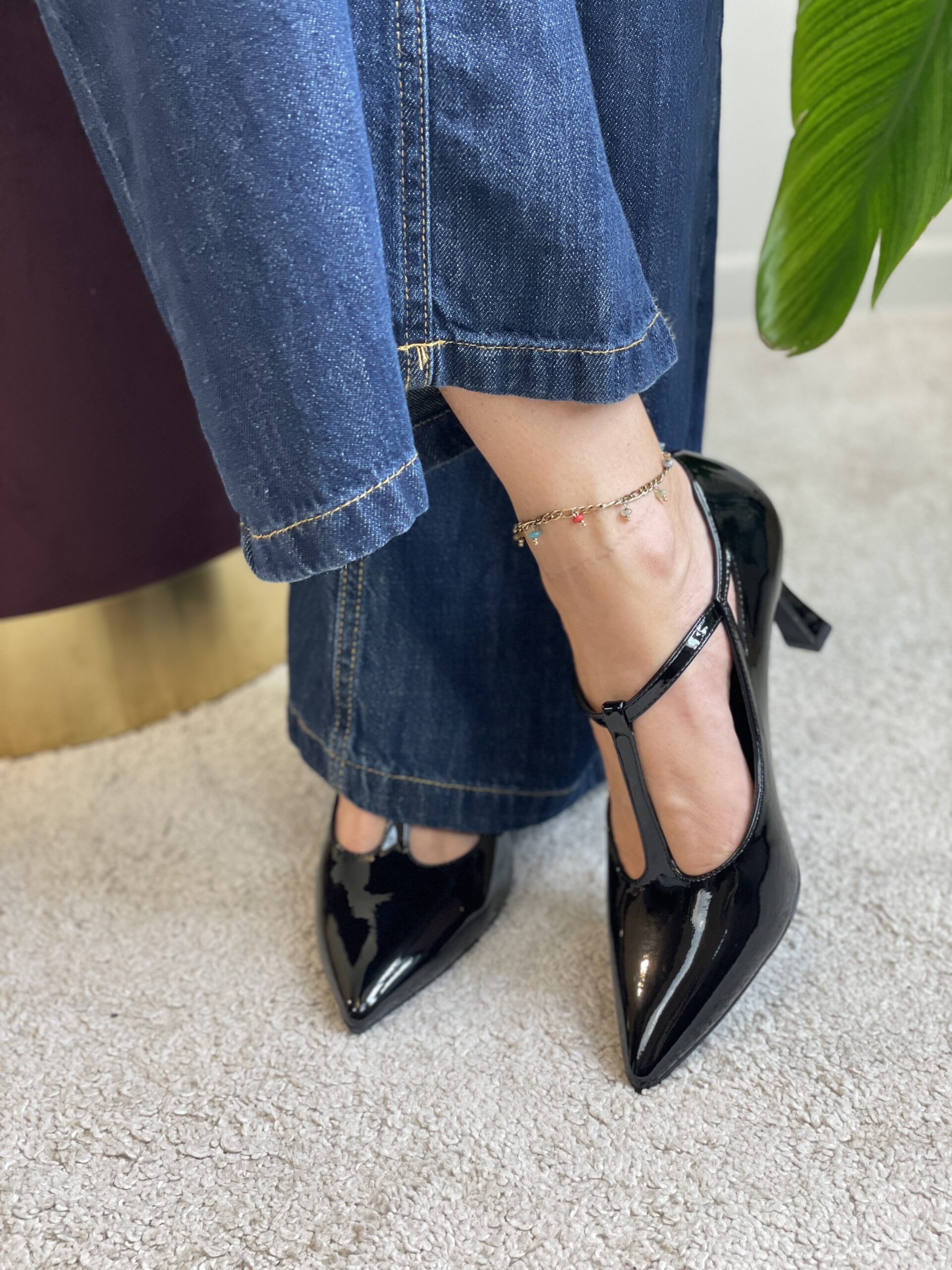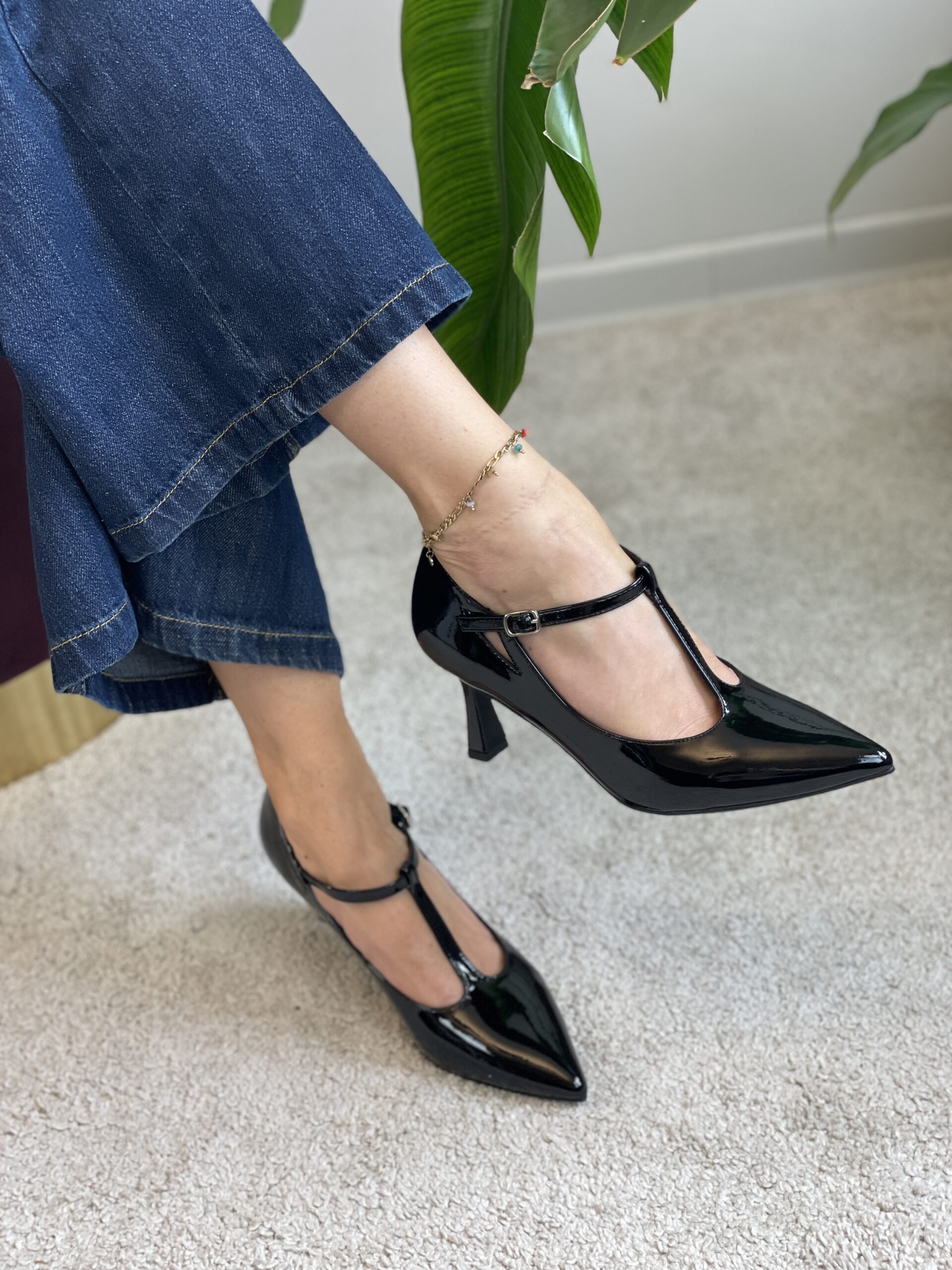 Décolleté in vernice a punta con cinturino sul collo del piede a T. Sottopiede in pelle leggermente imbottito.