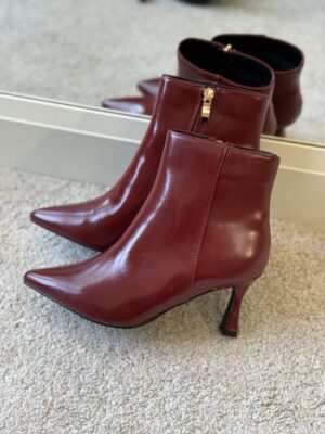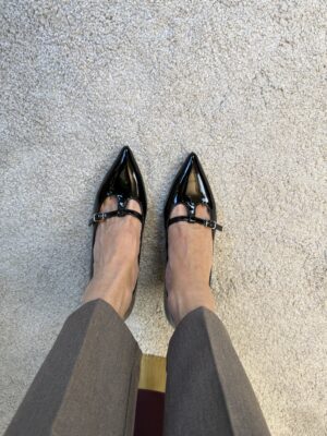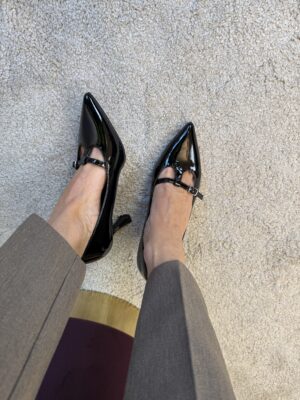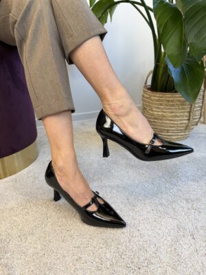 Décolleté in vernice a punta con occhielli sul davanti. Sottopiede in pelle leggermente imbottito.
