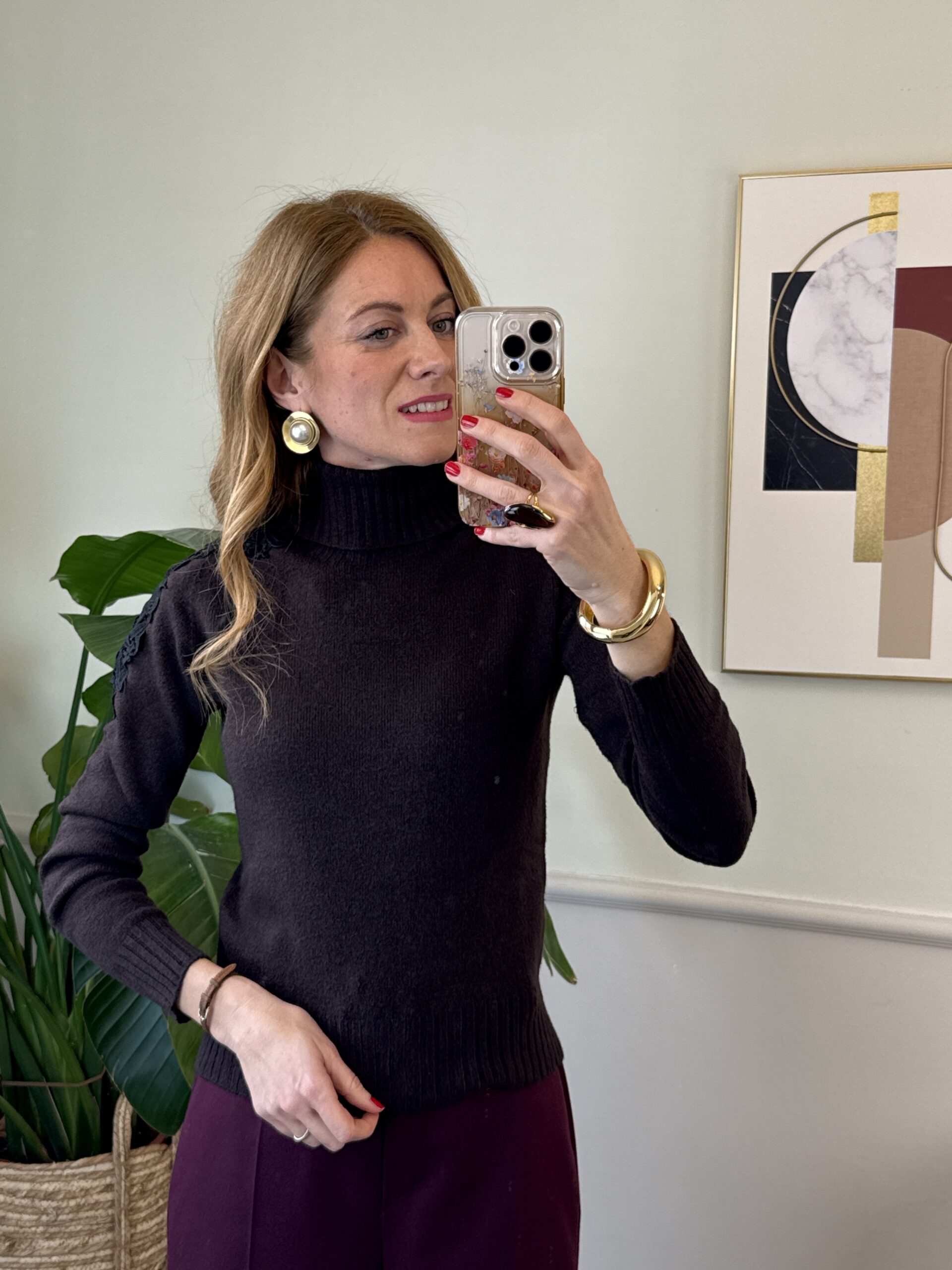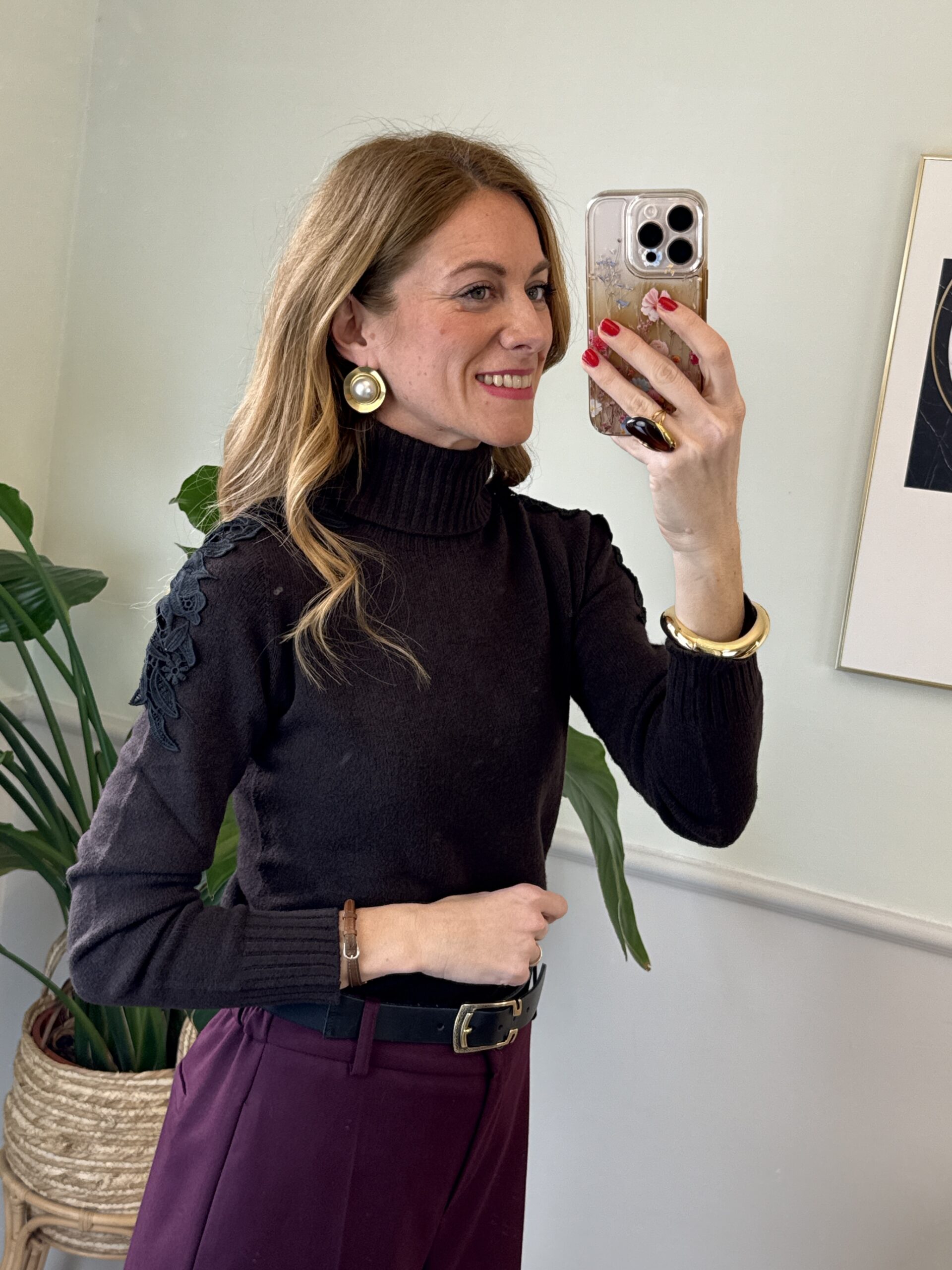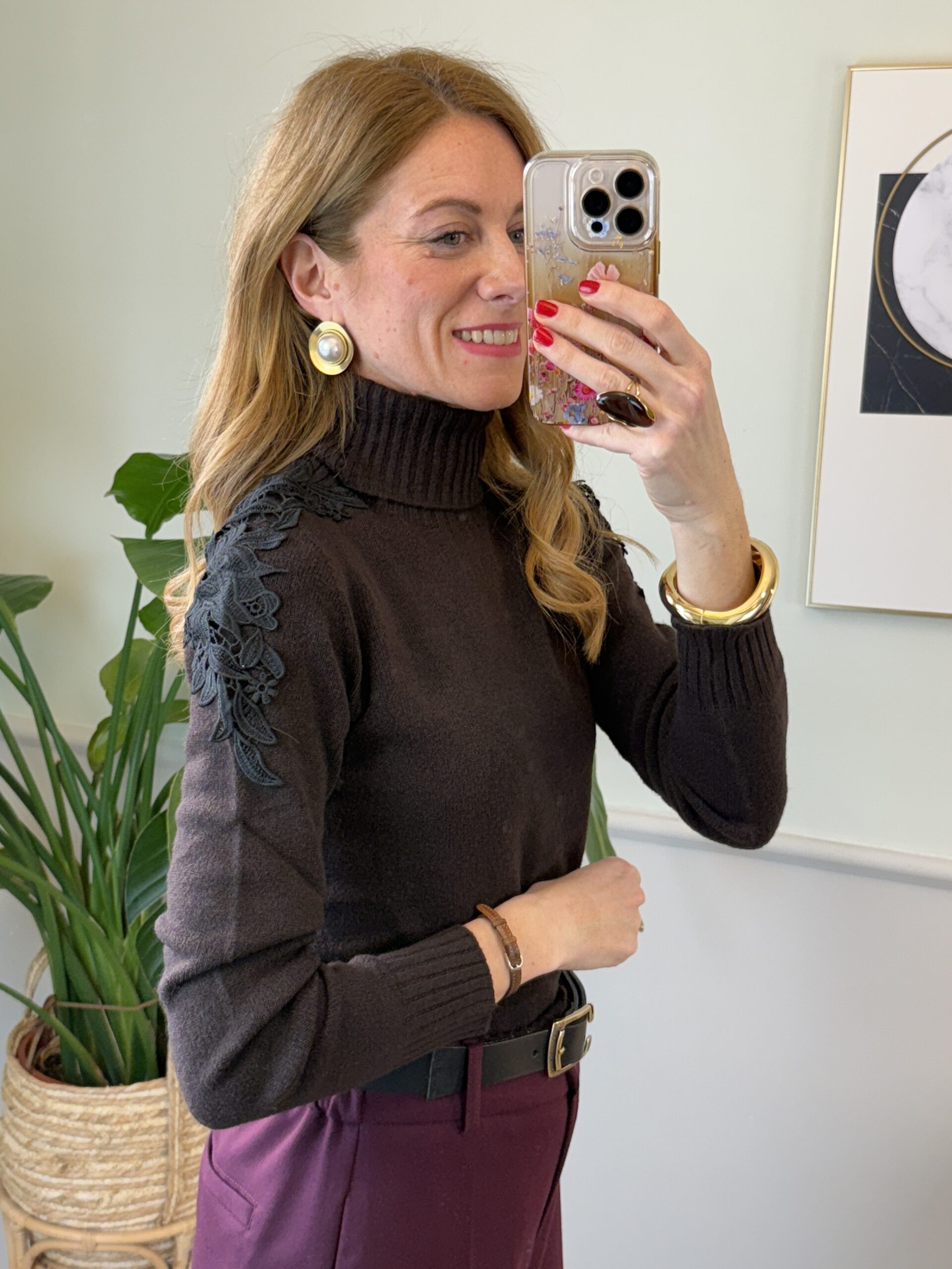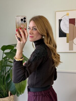 Dolcevita slim con pizzo applicato sulle spalle, collo e orli a coste.