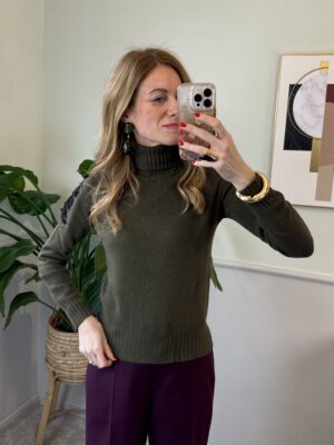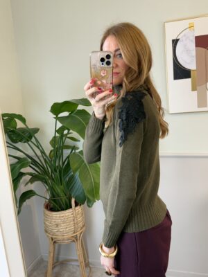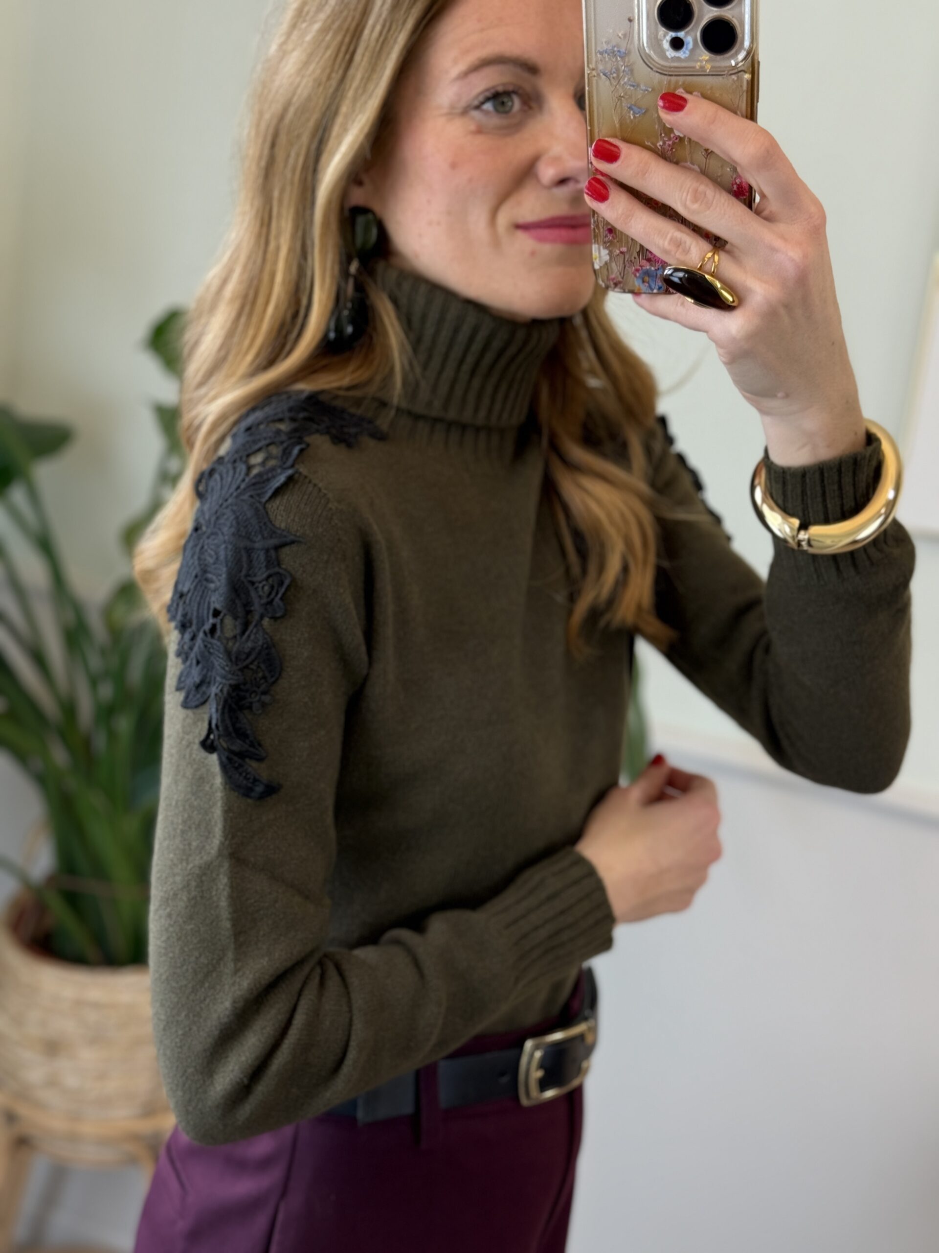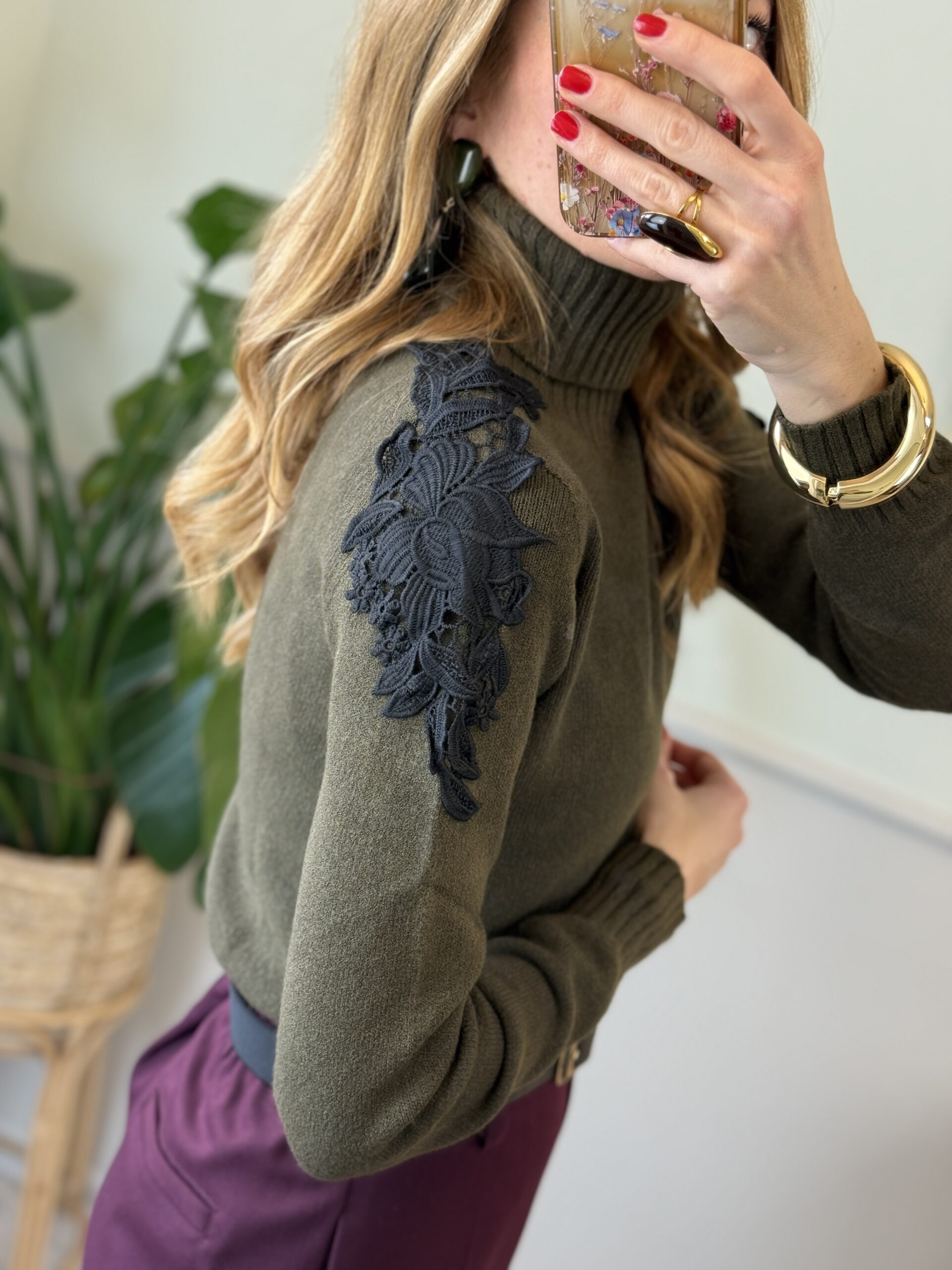 Dolcevita slim con pizzo applicato sulle spalle, collo e orli a coste.