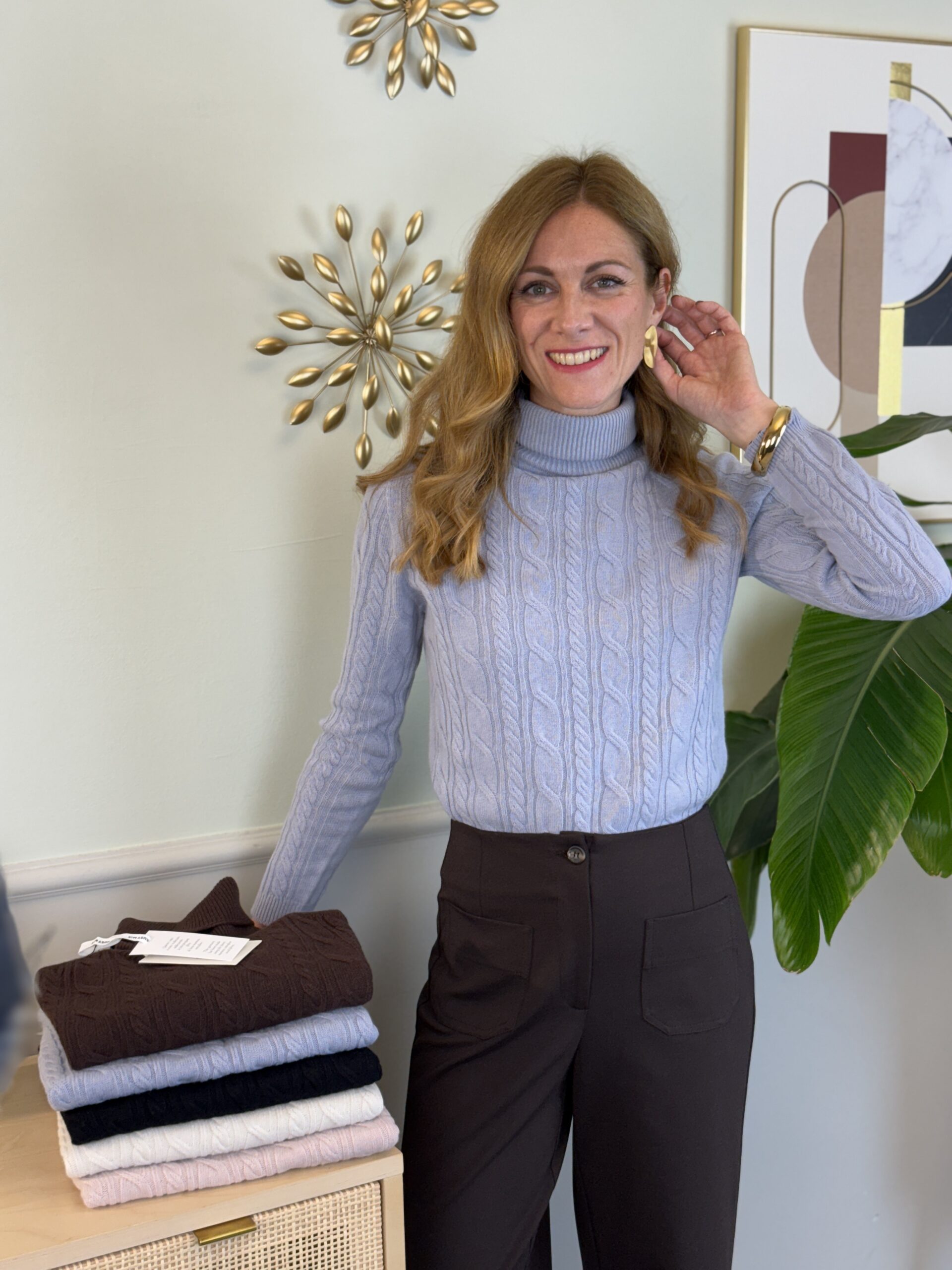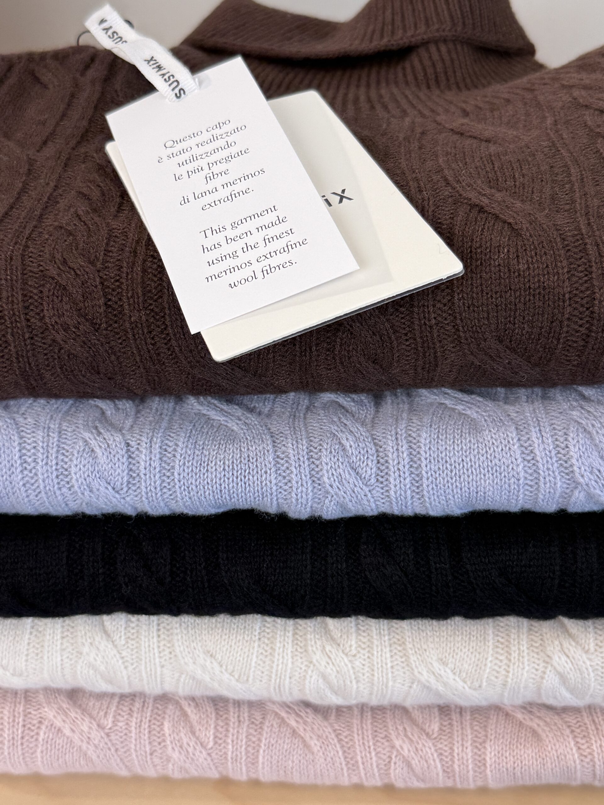 Dolcevita a trecce in tessuto molto caldo con lana merinos, orli a coste.