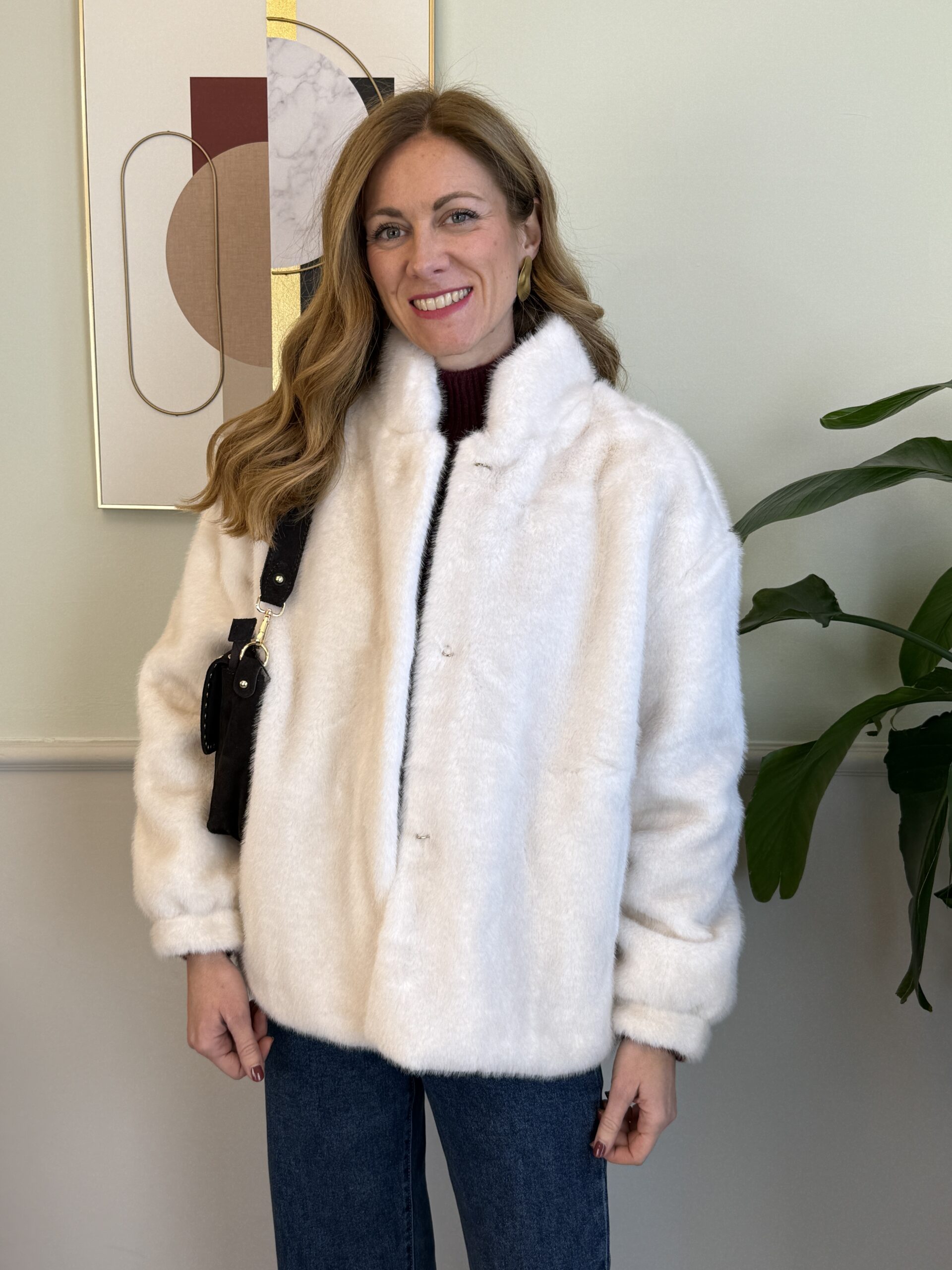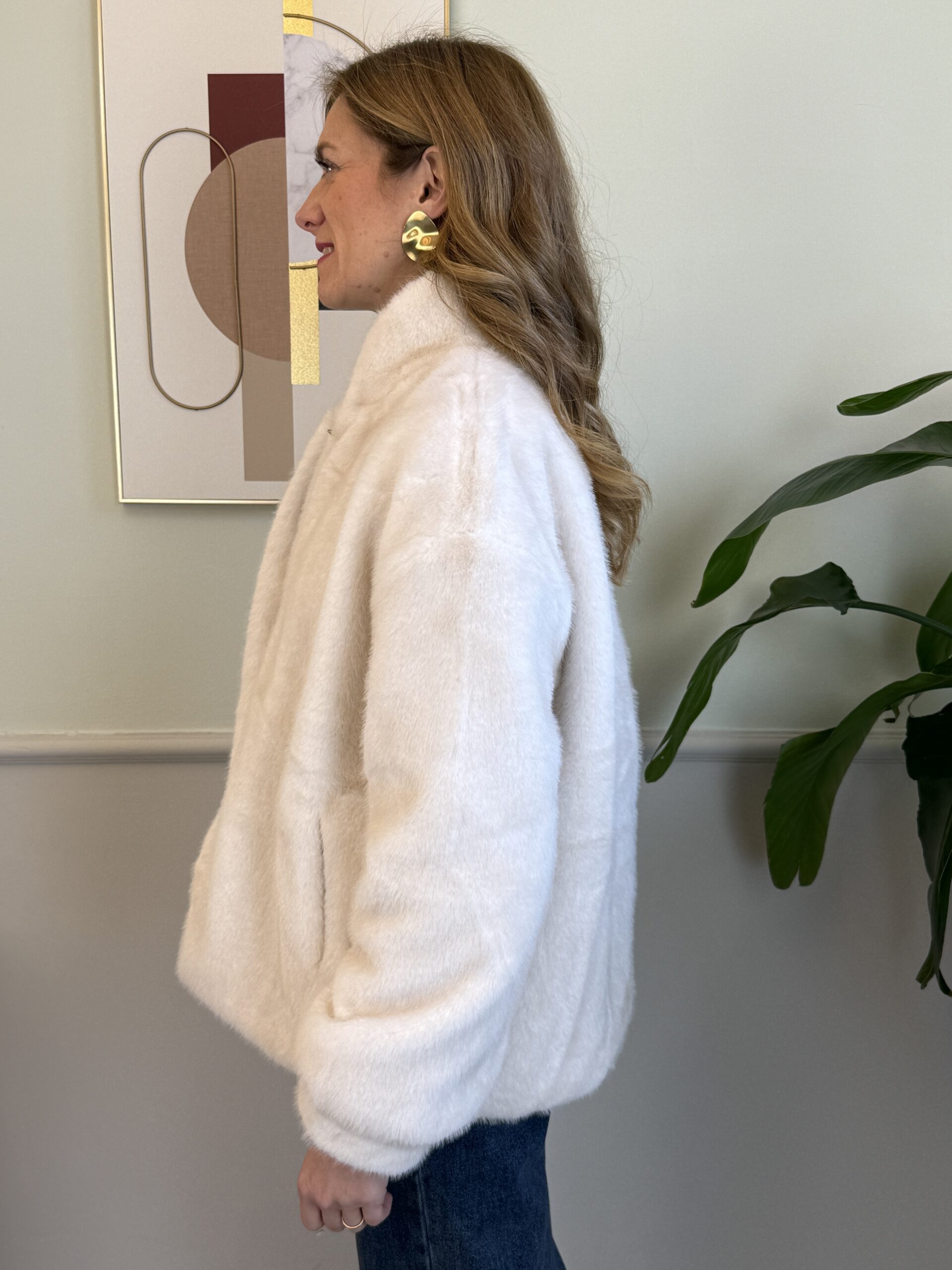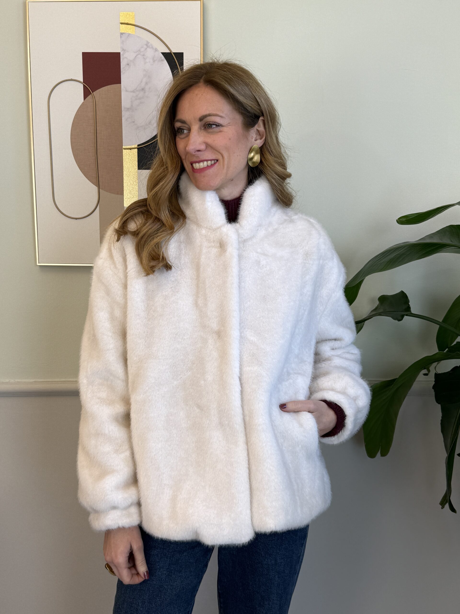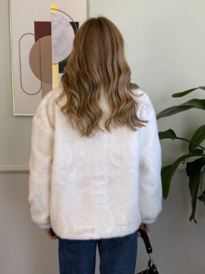 Eco-pelliccia panna con bottoni a gancio con strass, collo leggermente alto.