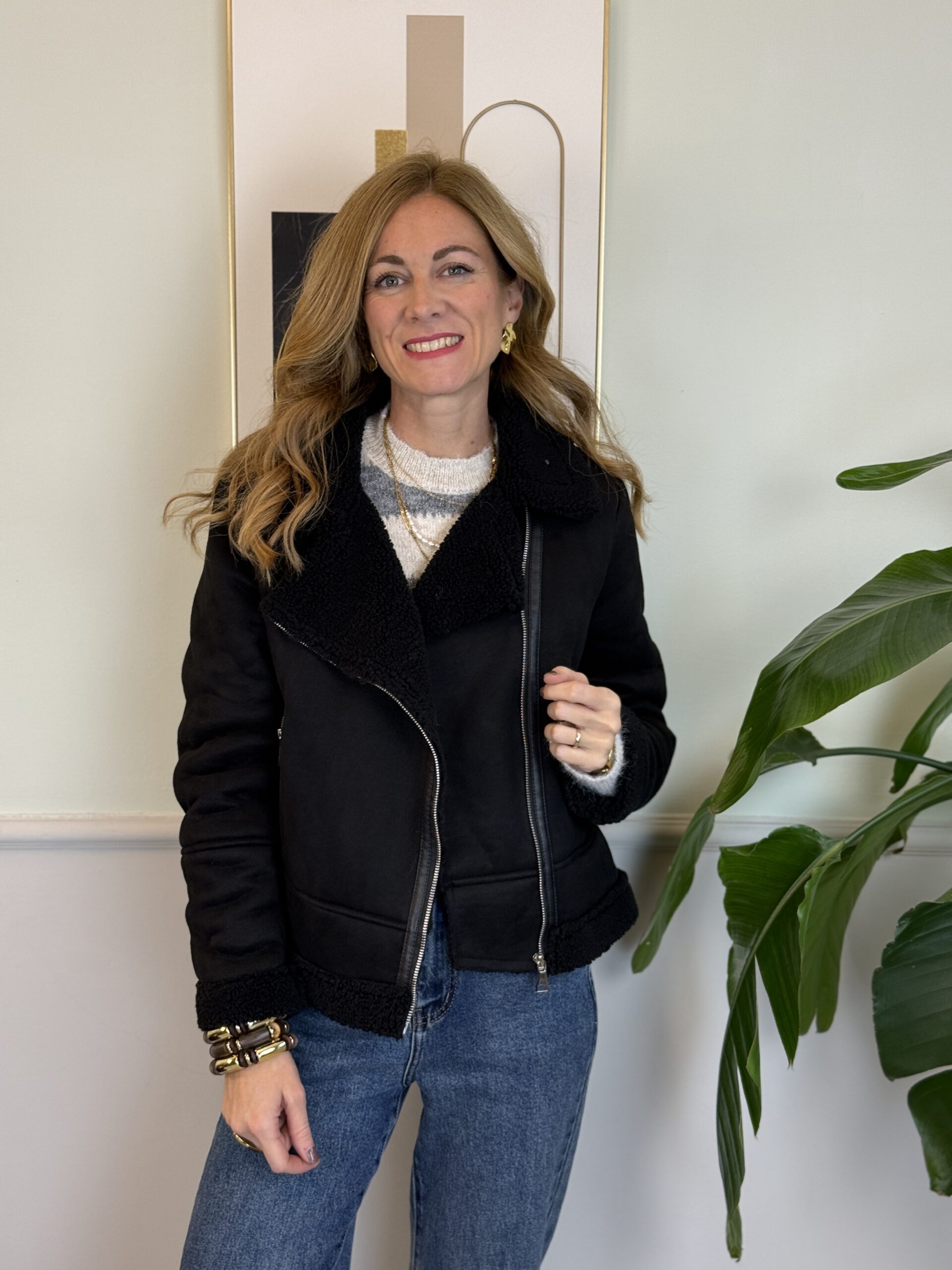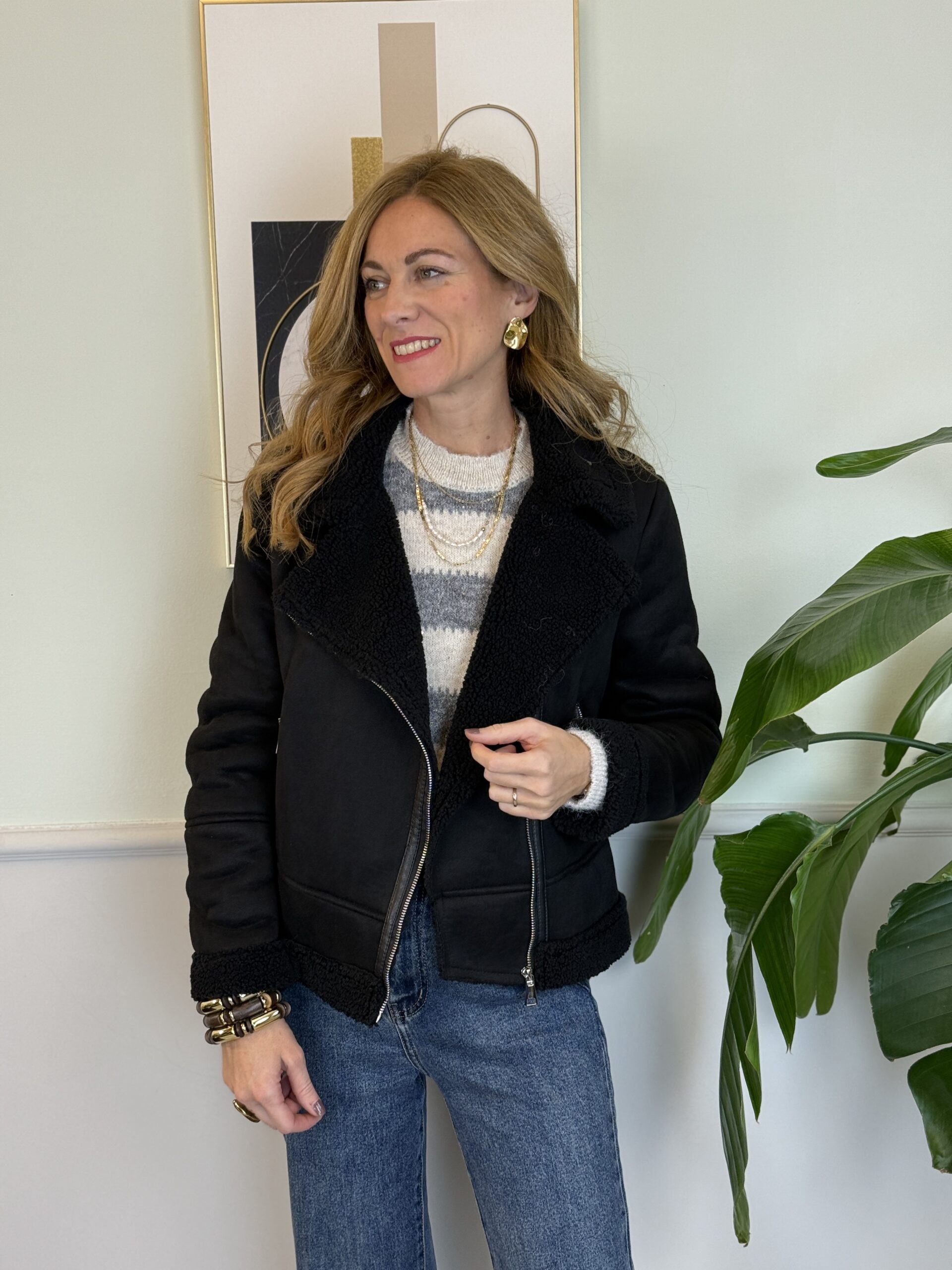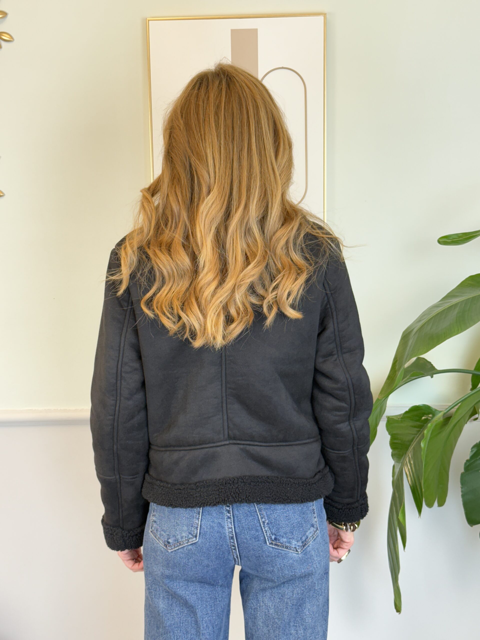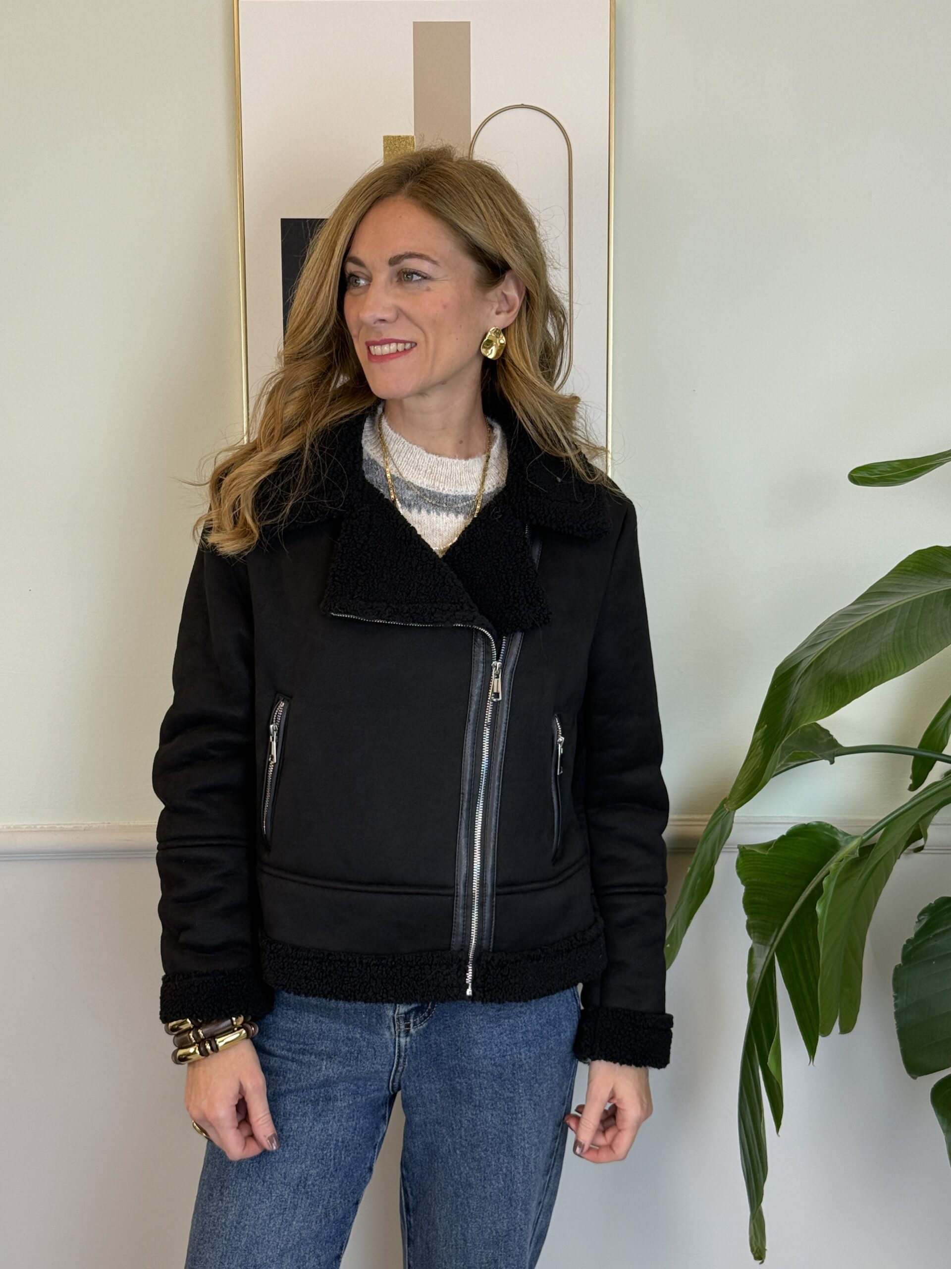 Eco-montone in eco dainetto e interno morbido effetto “shearling” con dettagli in ecopelle, scollo revers, tasche con zip sul davanti.