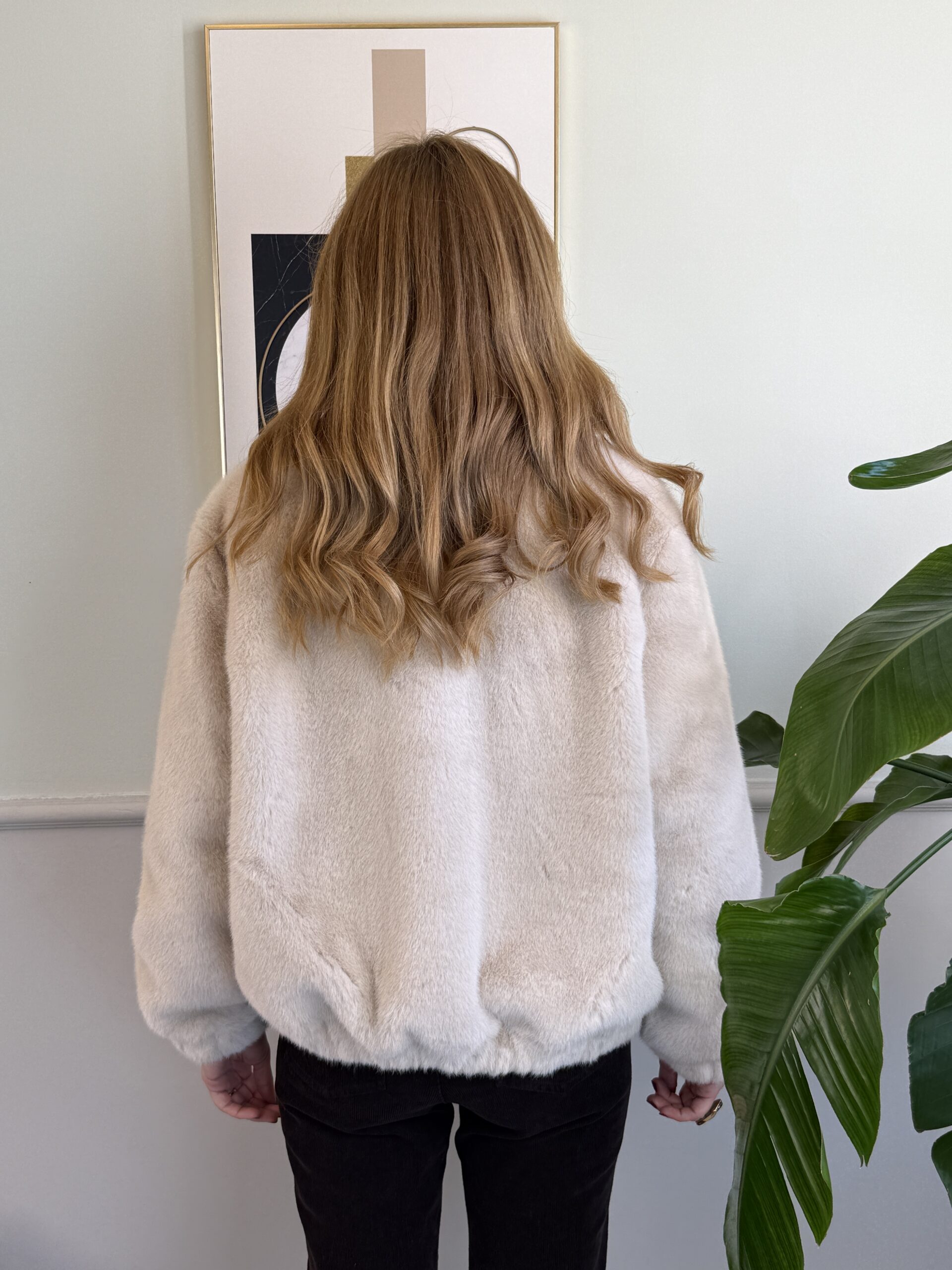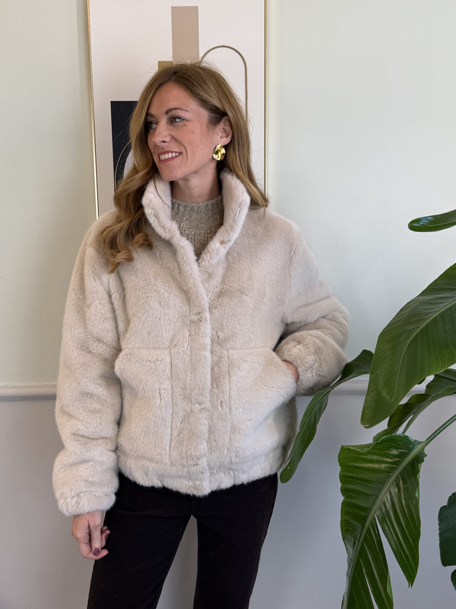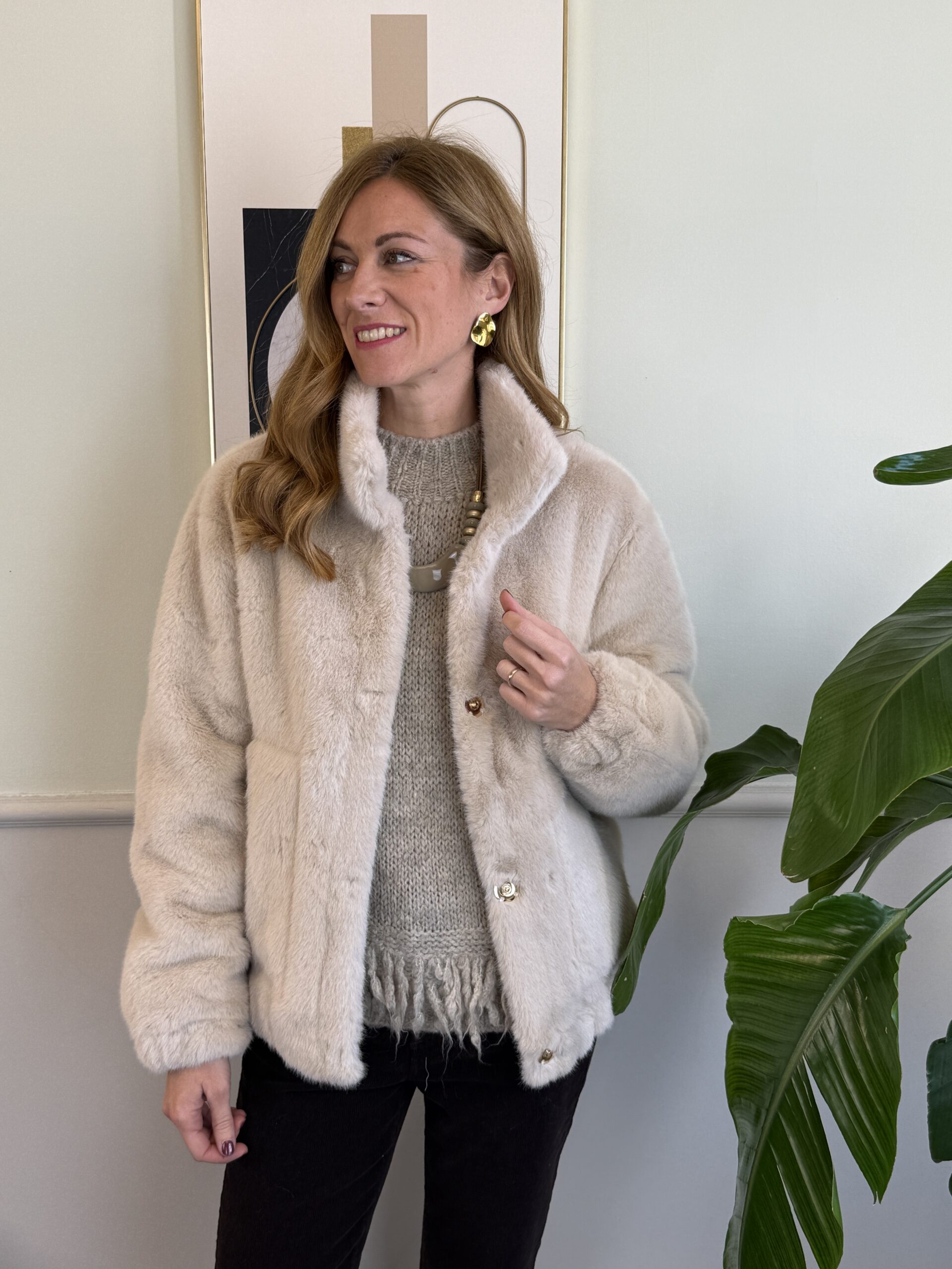 Eco-pelliccia panna morbidissima con collo alto, tasche applicate sul davanti ed elastico al fondo e ai polsi.