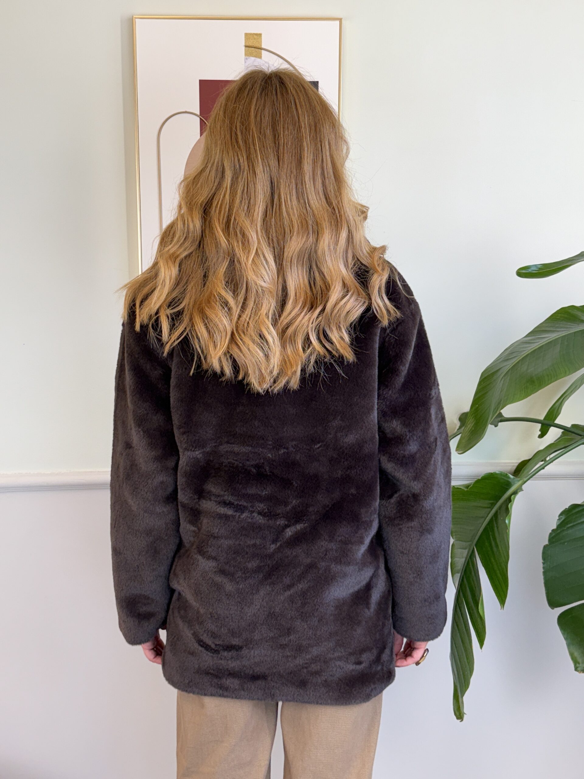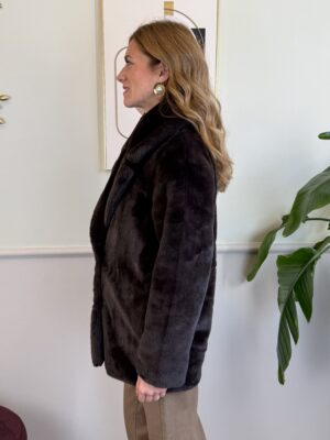 Cappotto eco pellicciotto morbidissimo, foderato con scollo revers, piccolo doppio petto e tasche laterali invisibili.