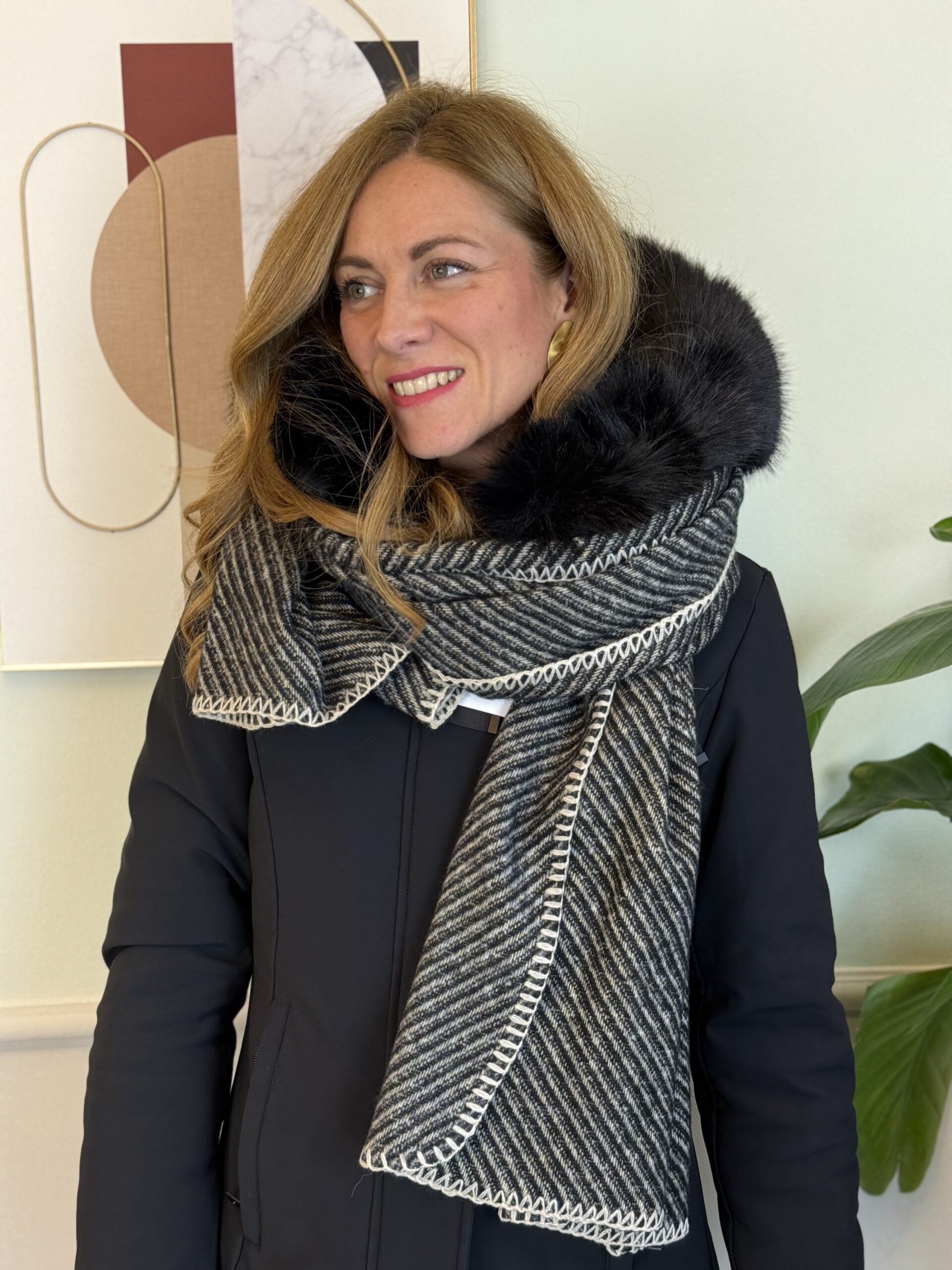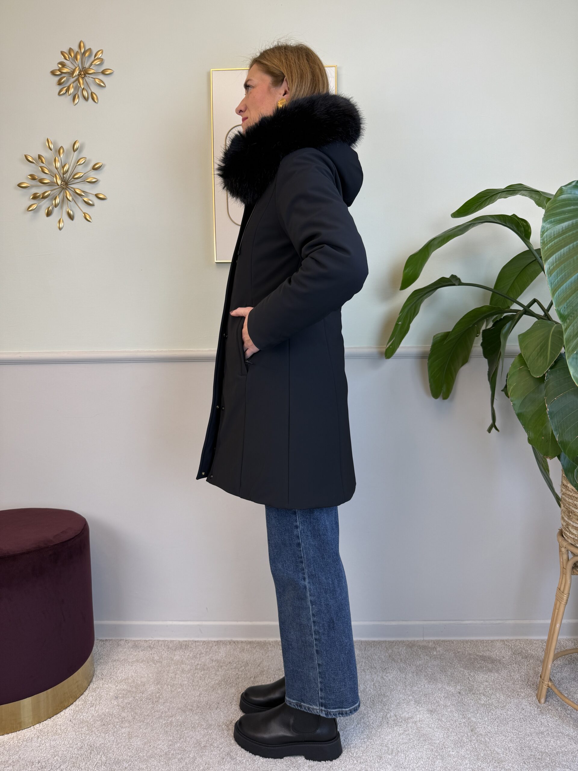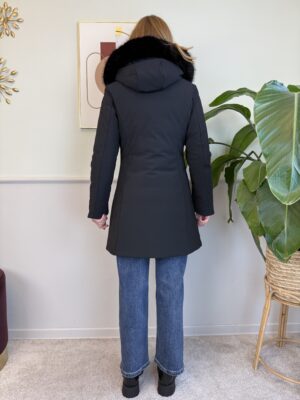 Eco piumino liscio sfiancato con cappuccio con pelliccetta removibile.