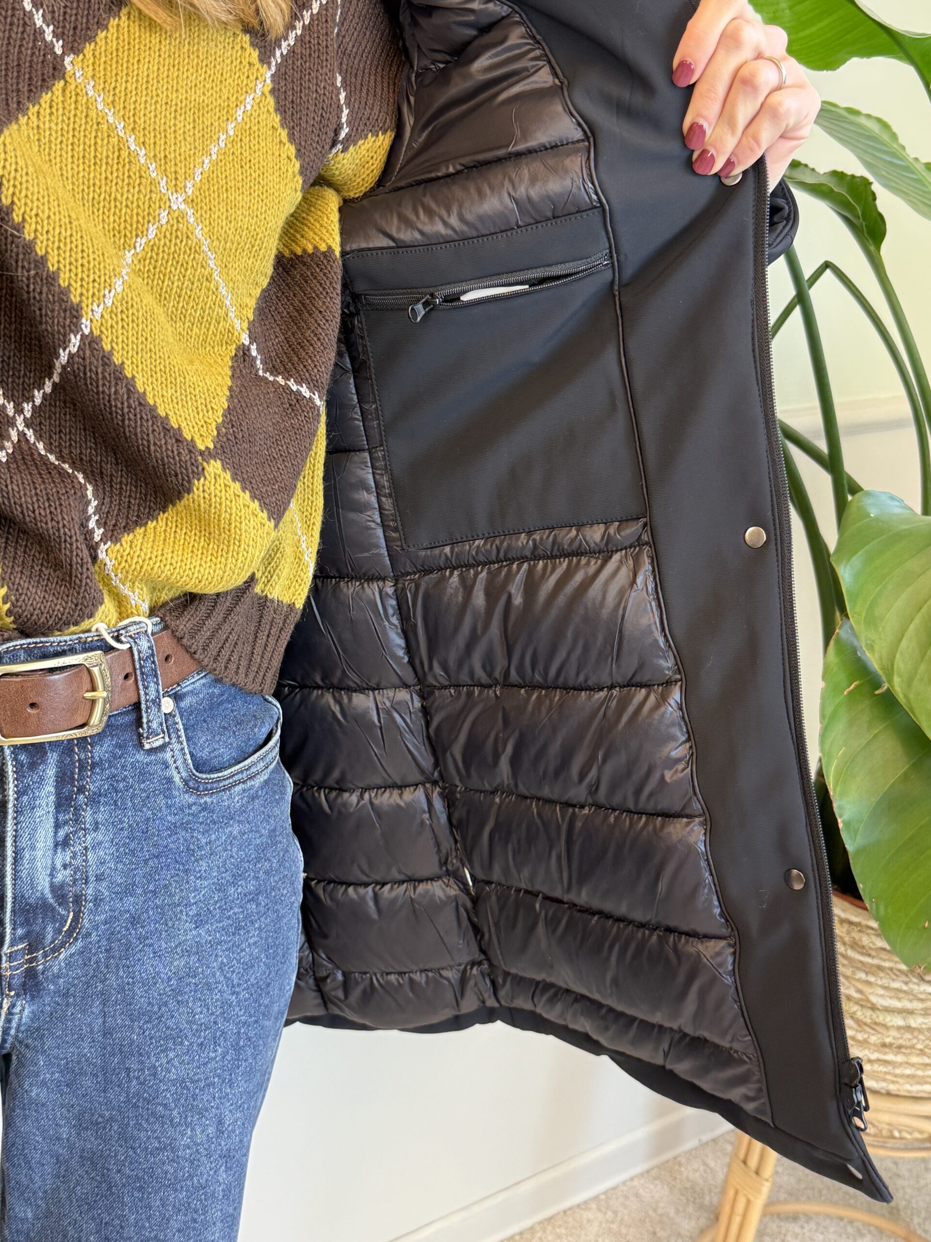 Presenta due tasche con cerniera nella parte frontale e due tasche interne (con cerniera).