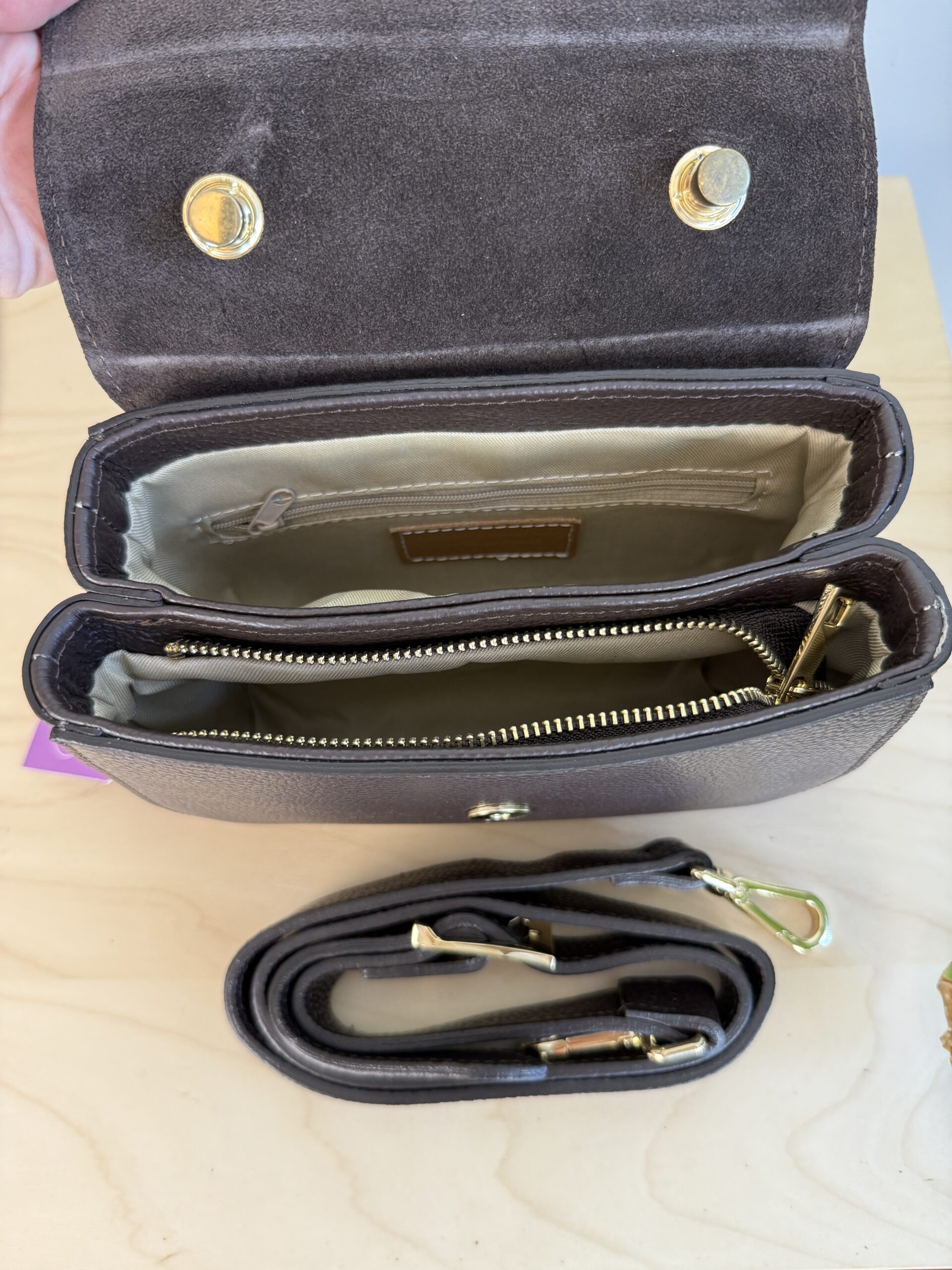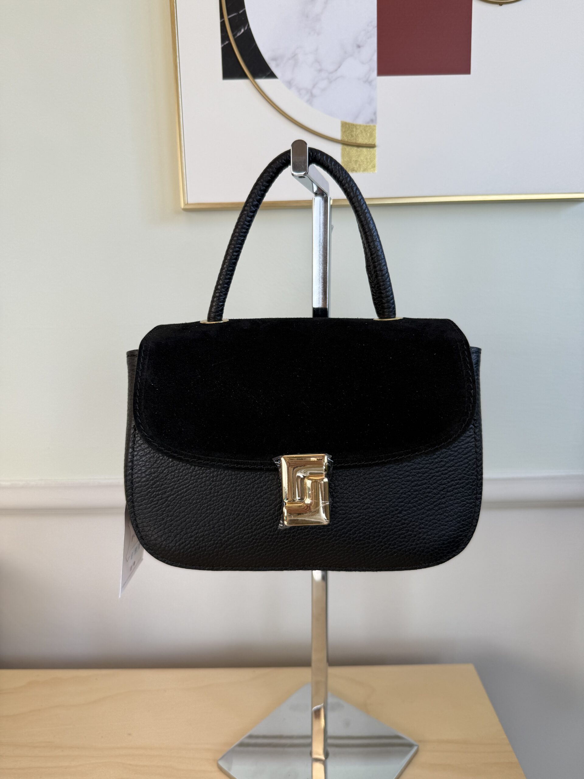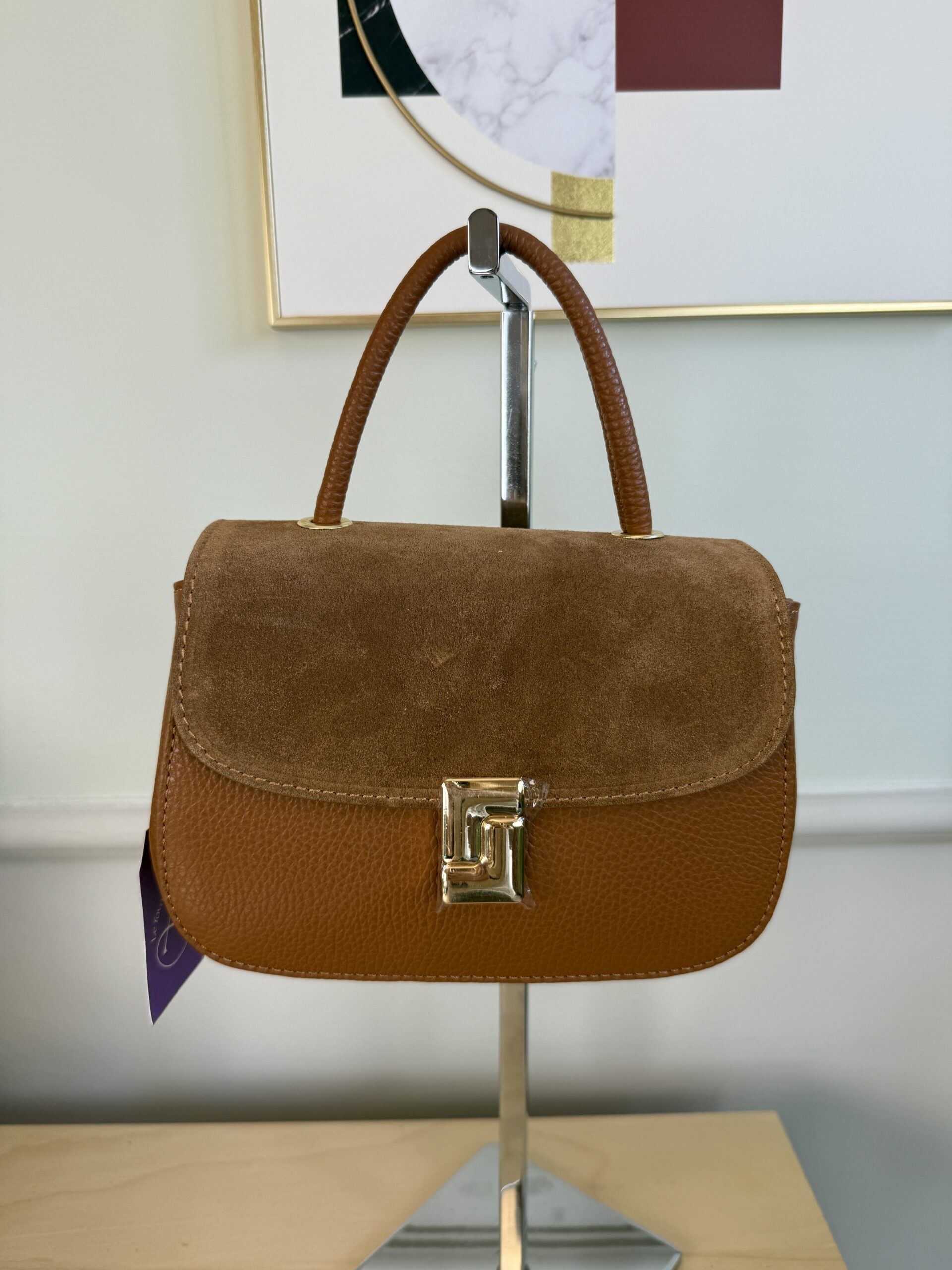 Borsa in pelle con patella scamosciata, interno foderato con doppio scomparto, dettagli dorati, tracolla regolabile.