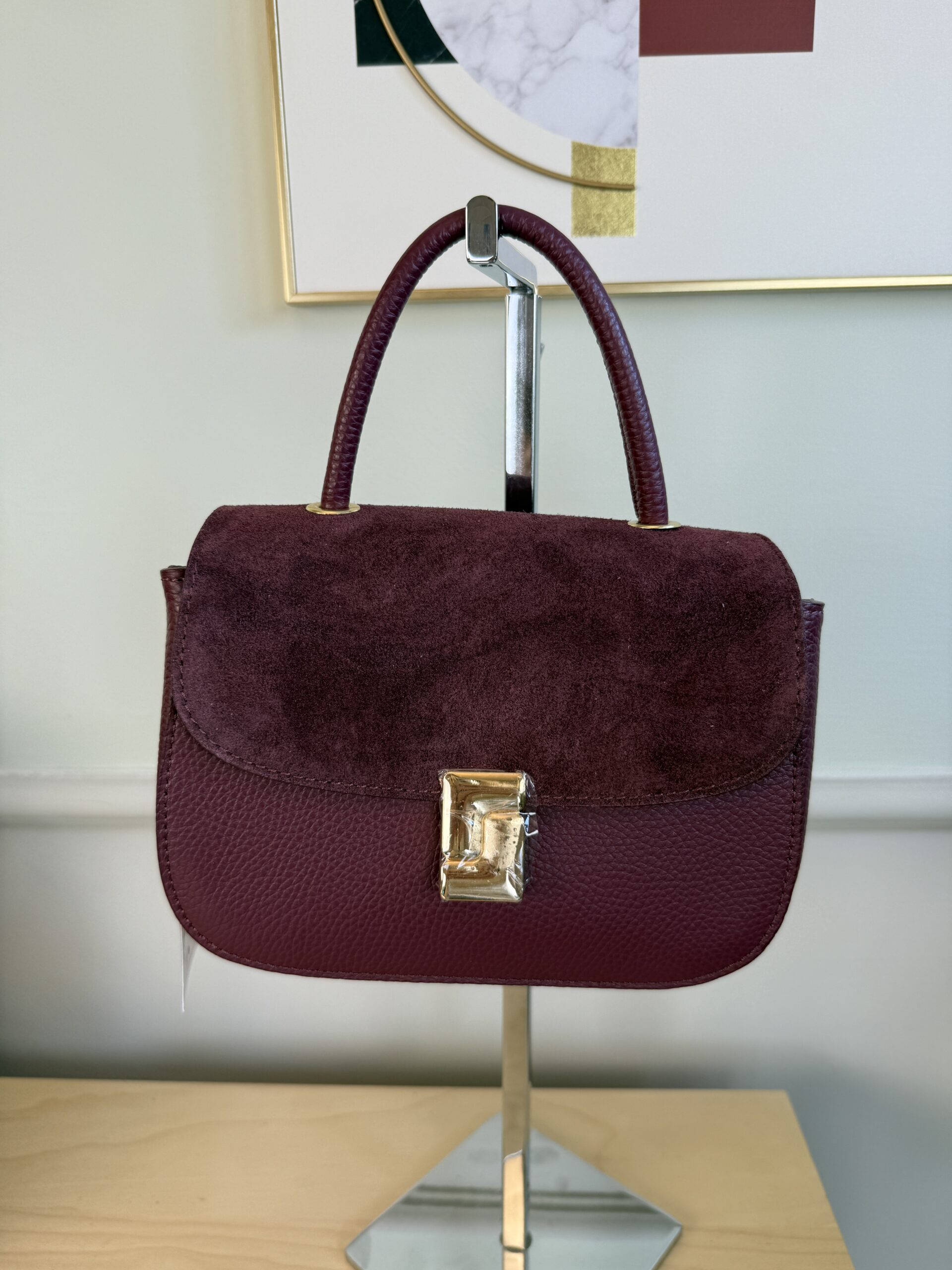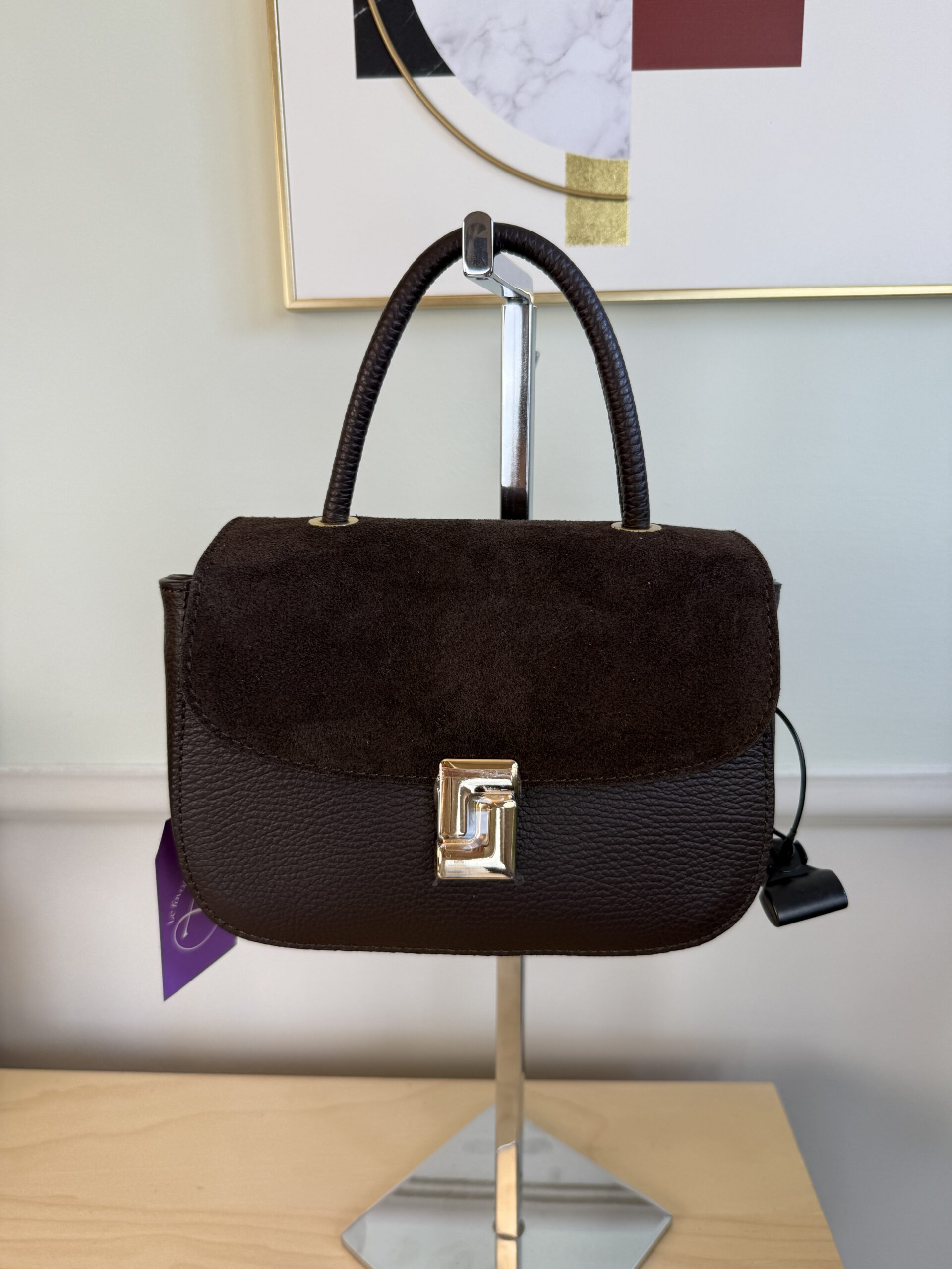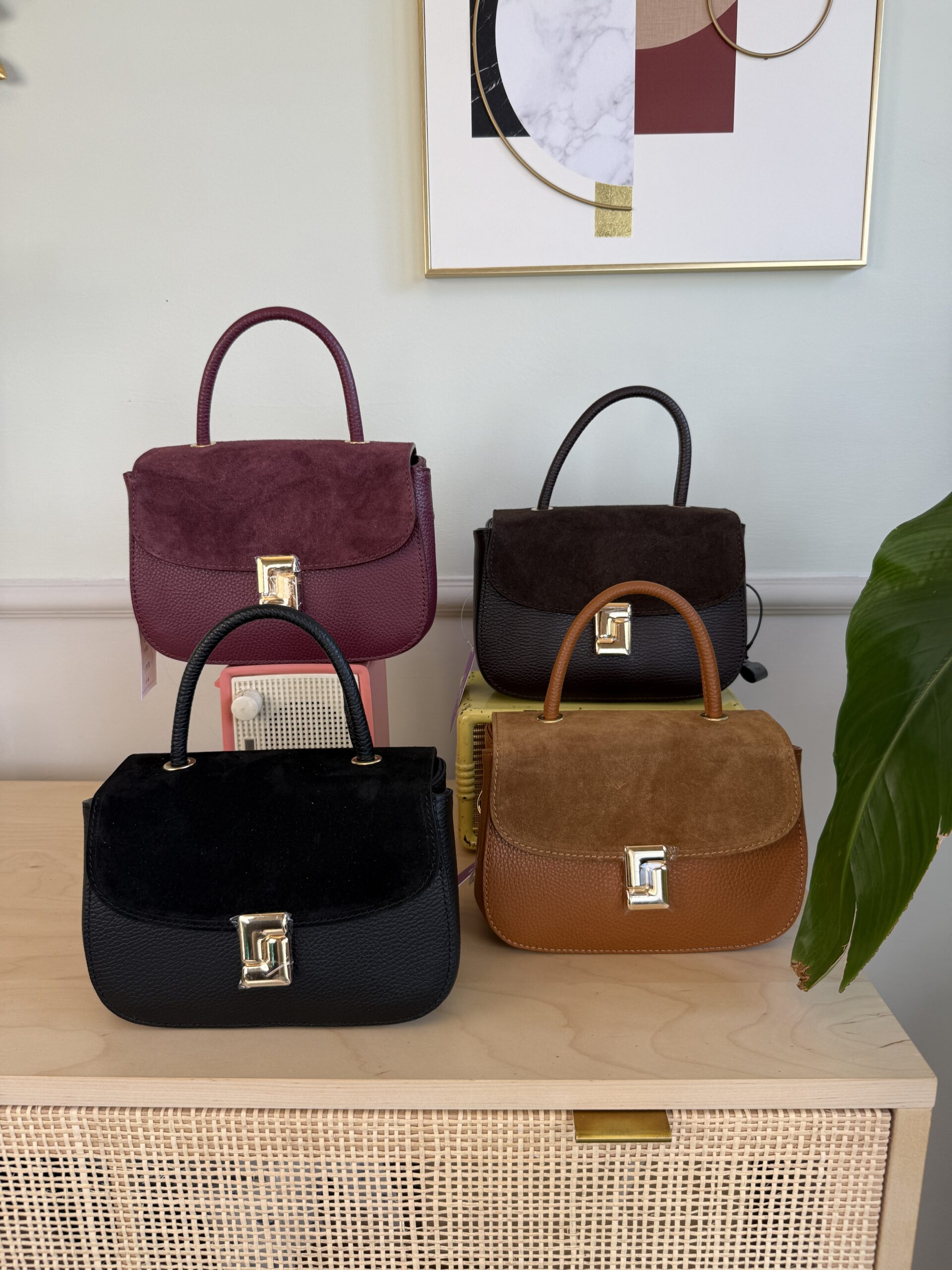 Borsa in pelle con patella scamosciata, interno foderato con doppio scomparto, dettagli dorati, tracolla regolabile.