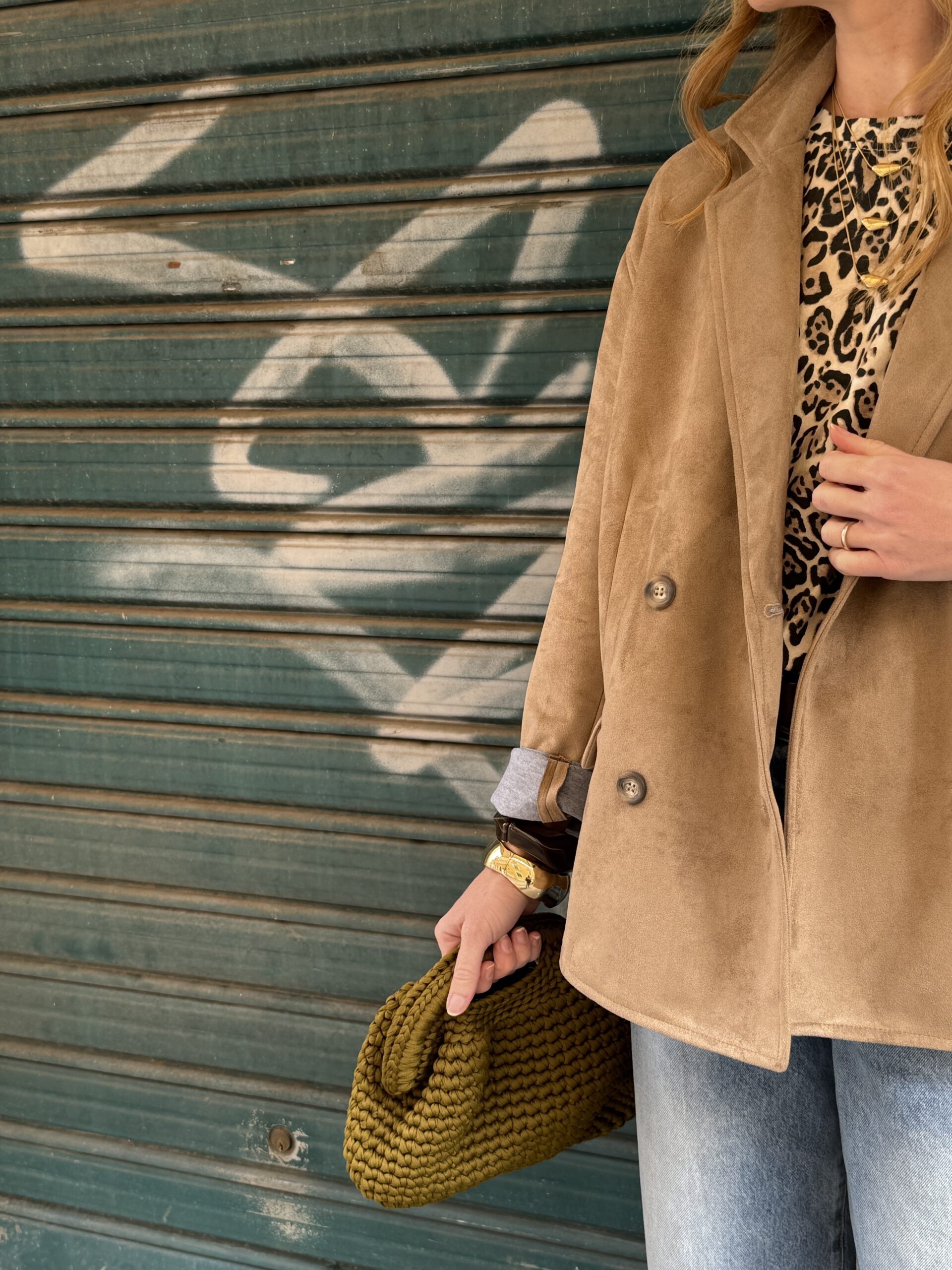 Chiusura a doppio petto a quattro bottoni tartarugati.