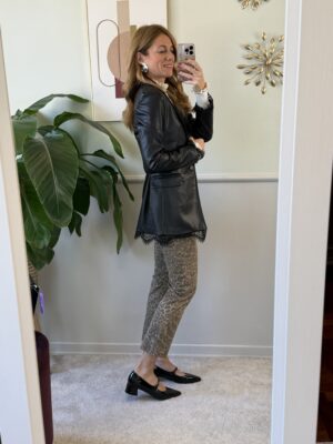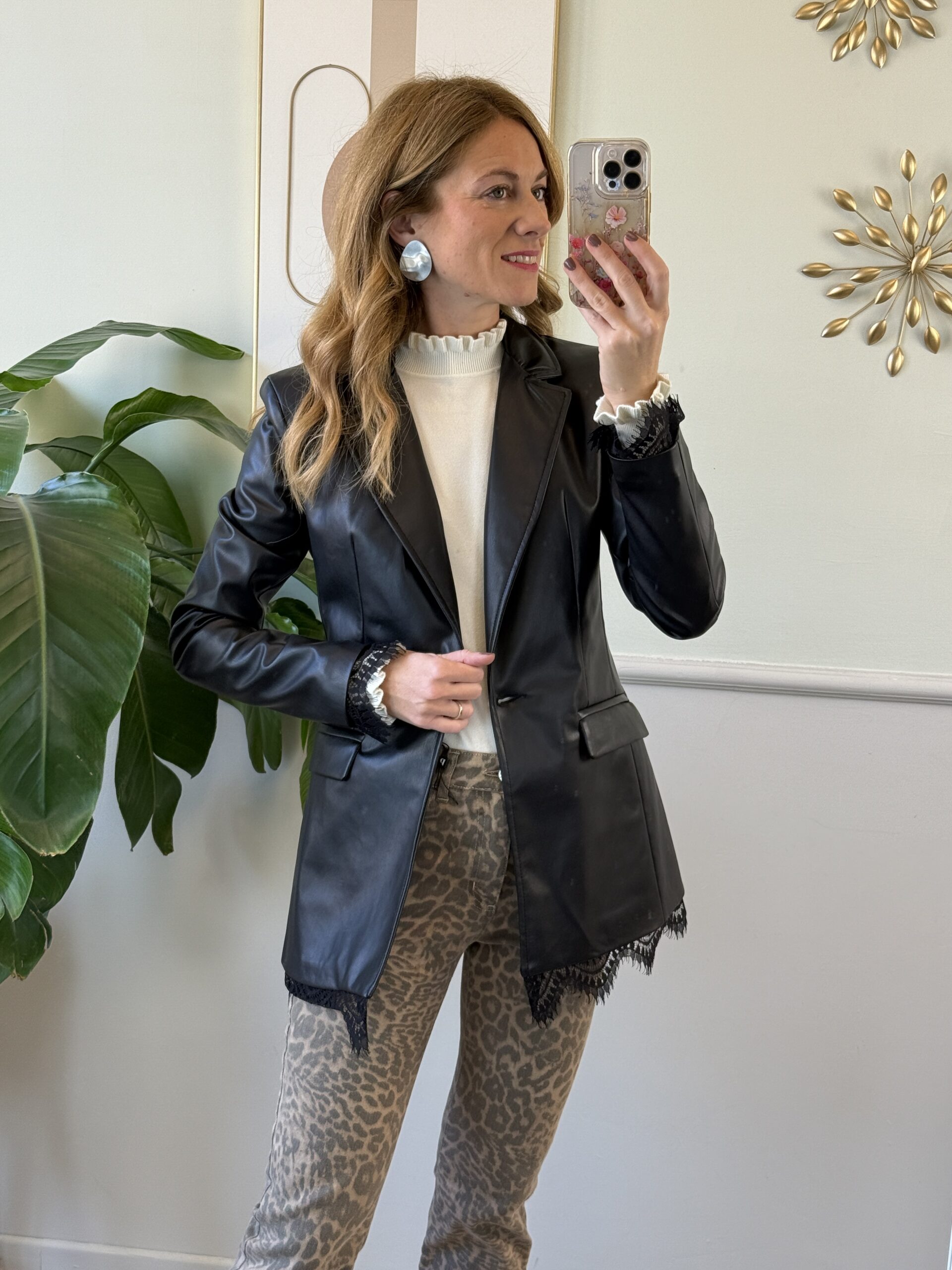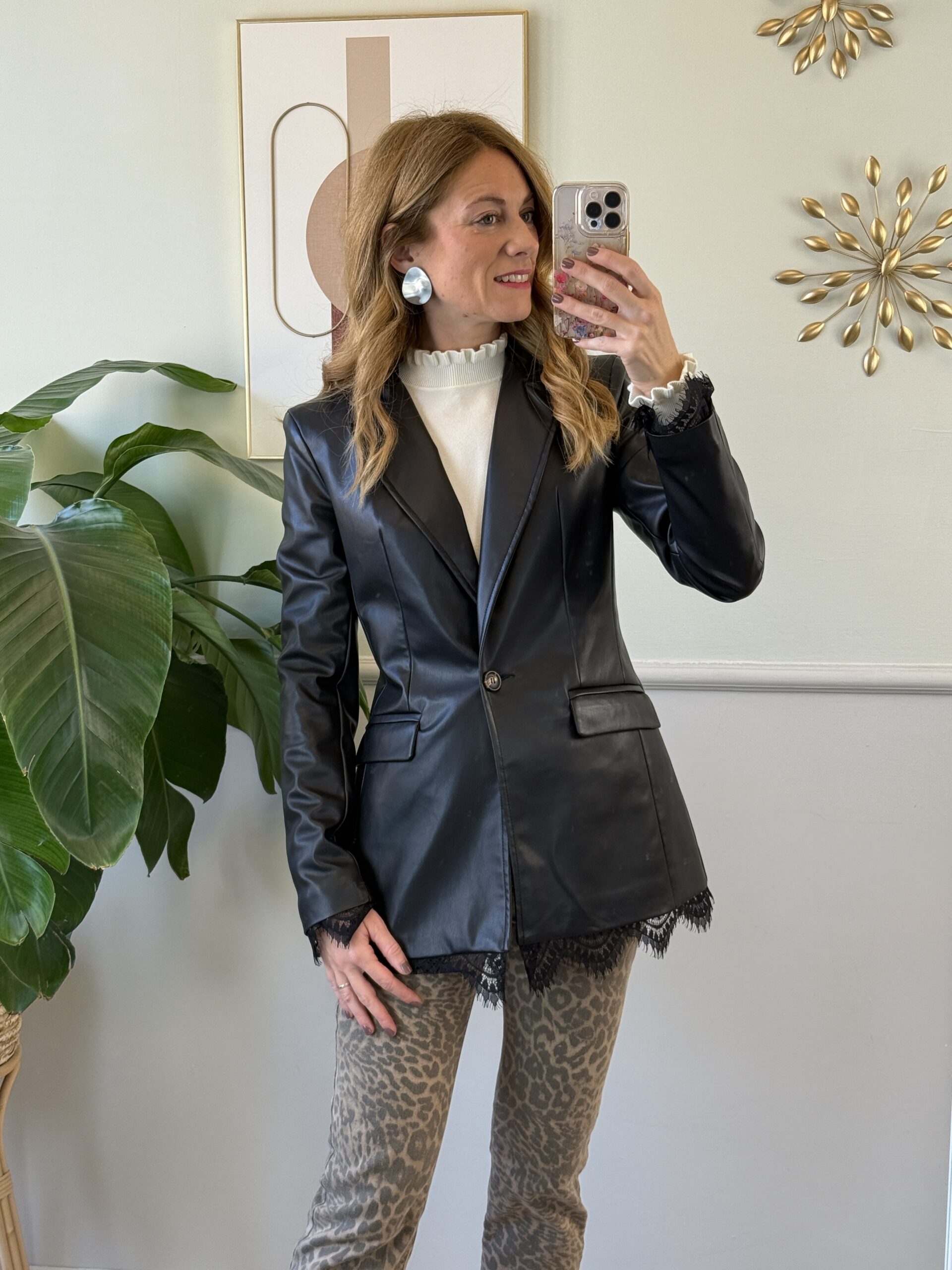 Giacca sfiancata in eco pelle nera con dettaglio orlo e bordo polsi in pizzo.
