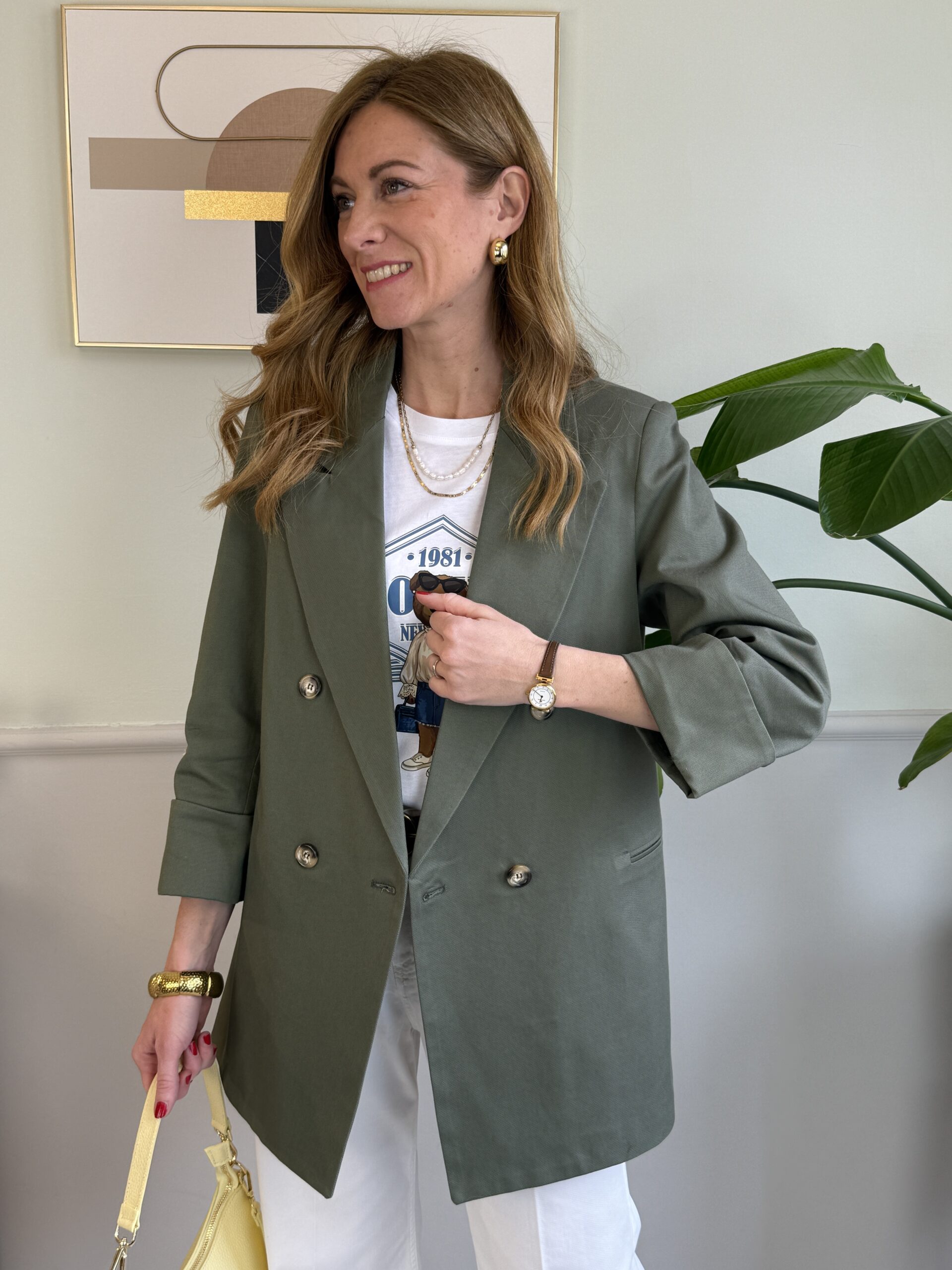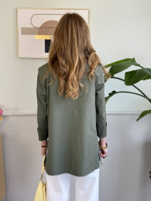 Giacca lunga, modello over, in un bellissimo color verde, con particolare della manica 3/4