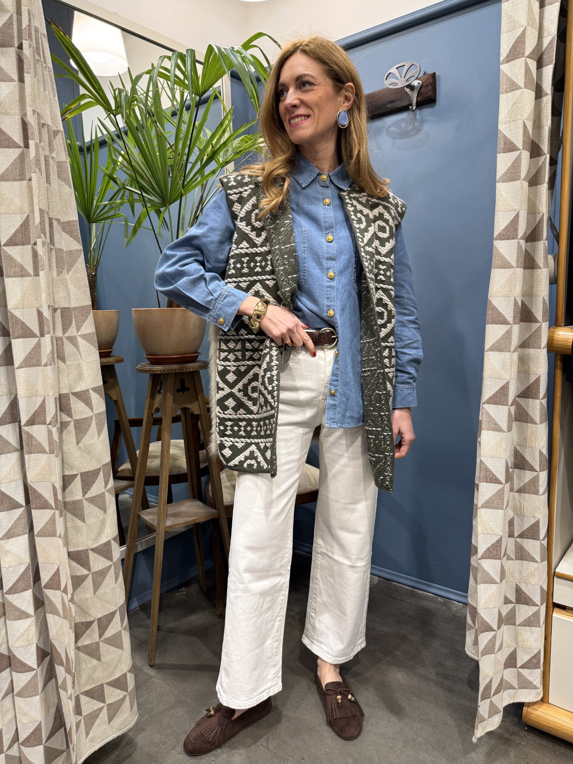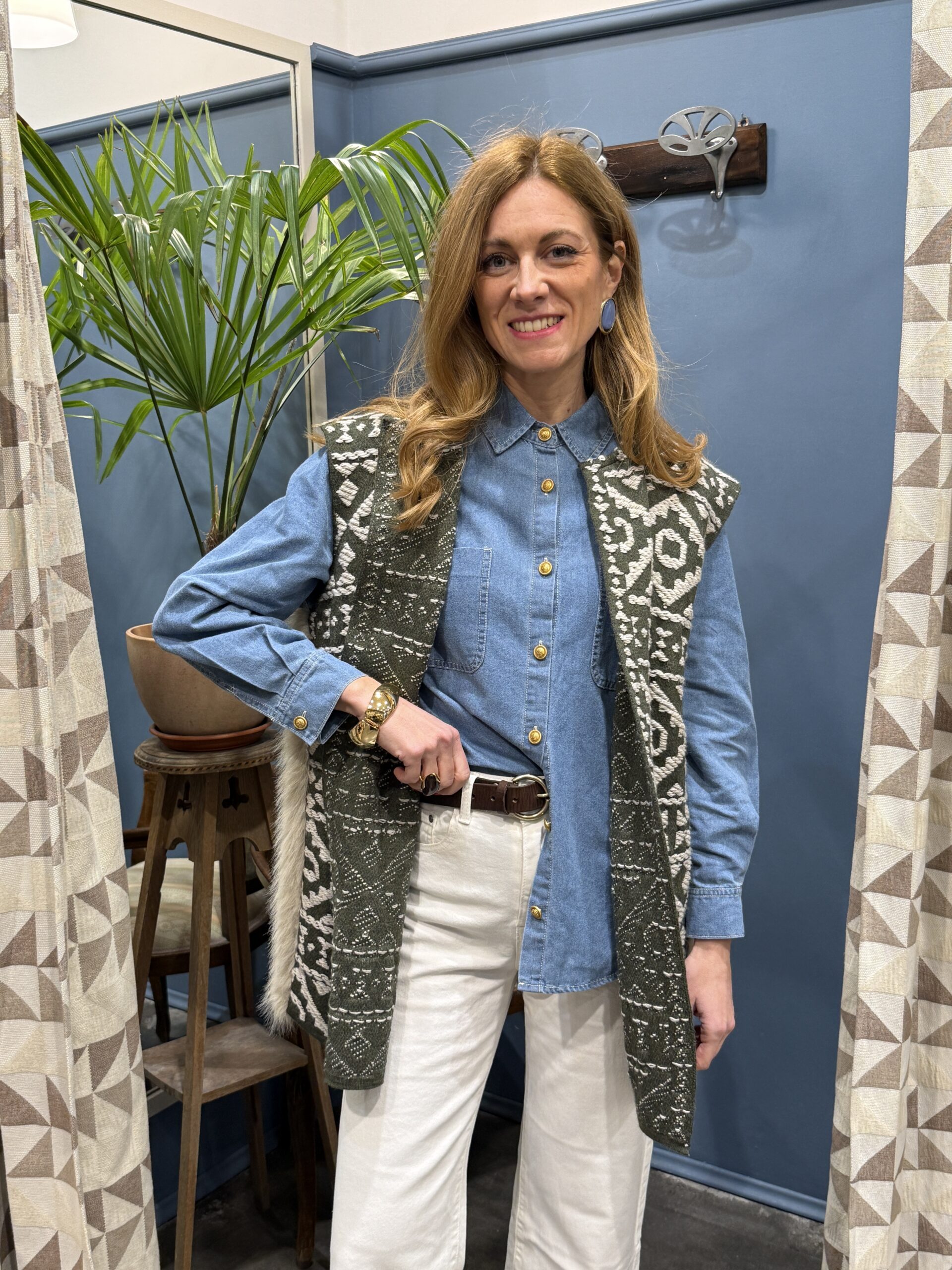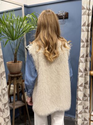 Gilet con ricami etnici sul davanti ed eco-pelliccia posteriore, foderato. Da portare aperto senza chiusura.