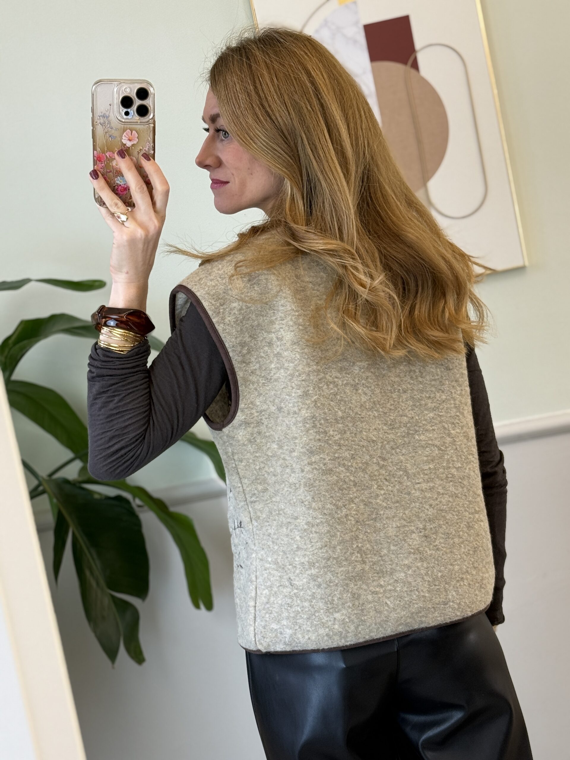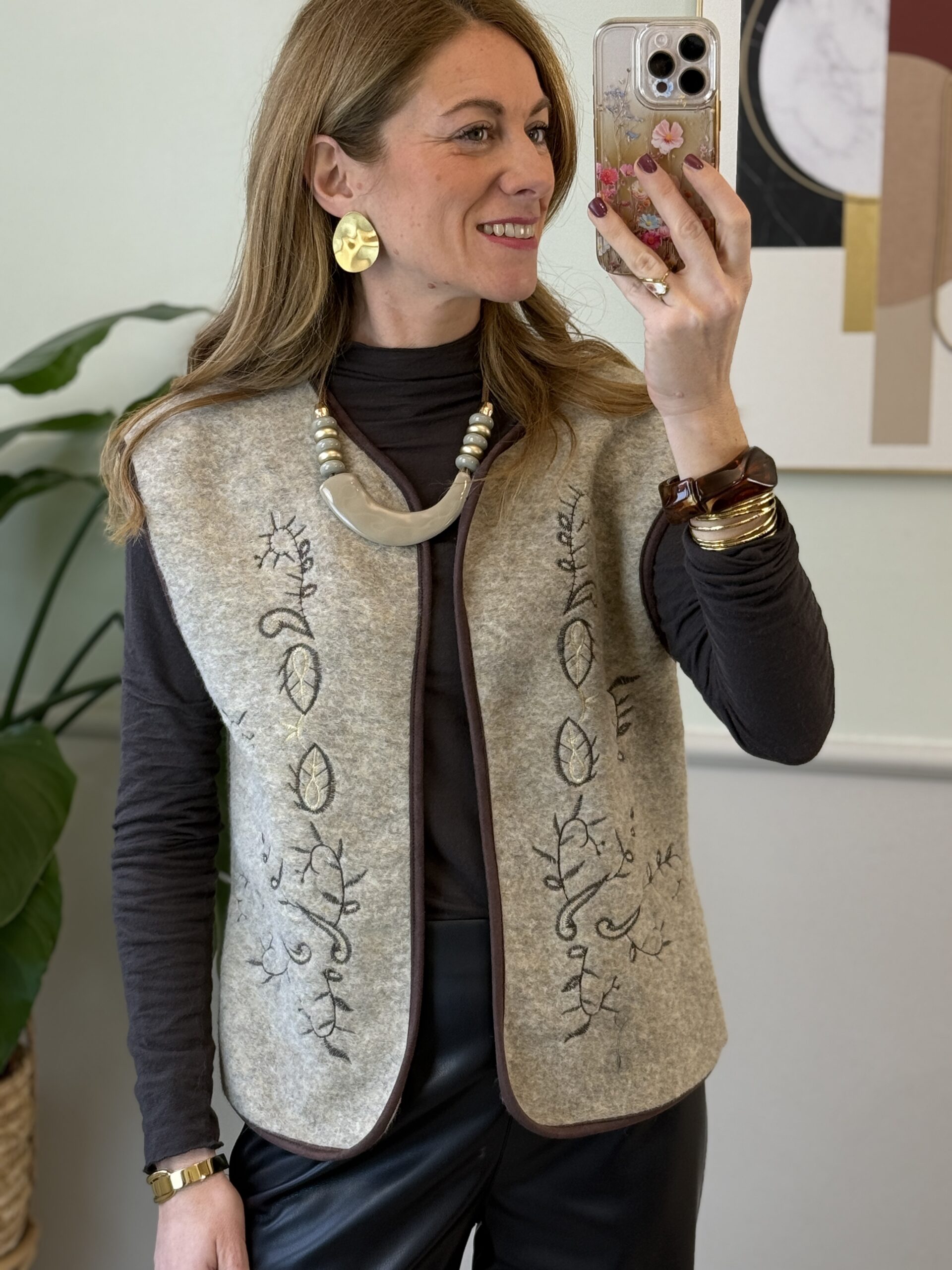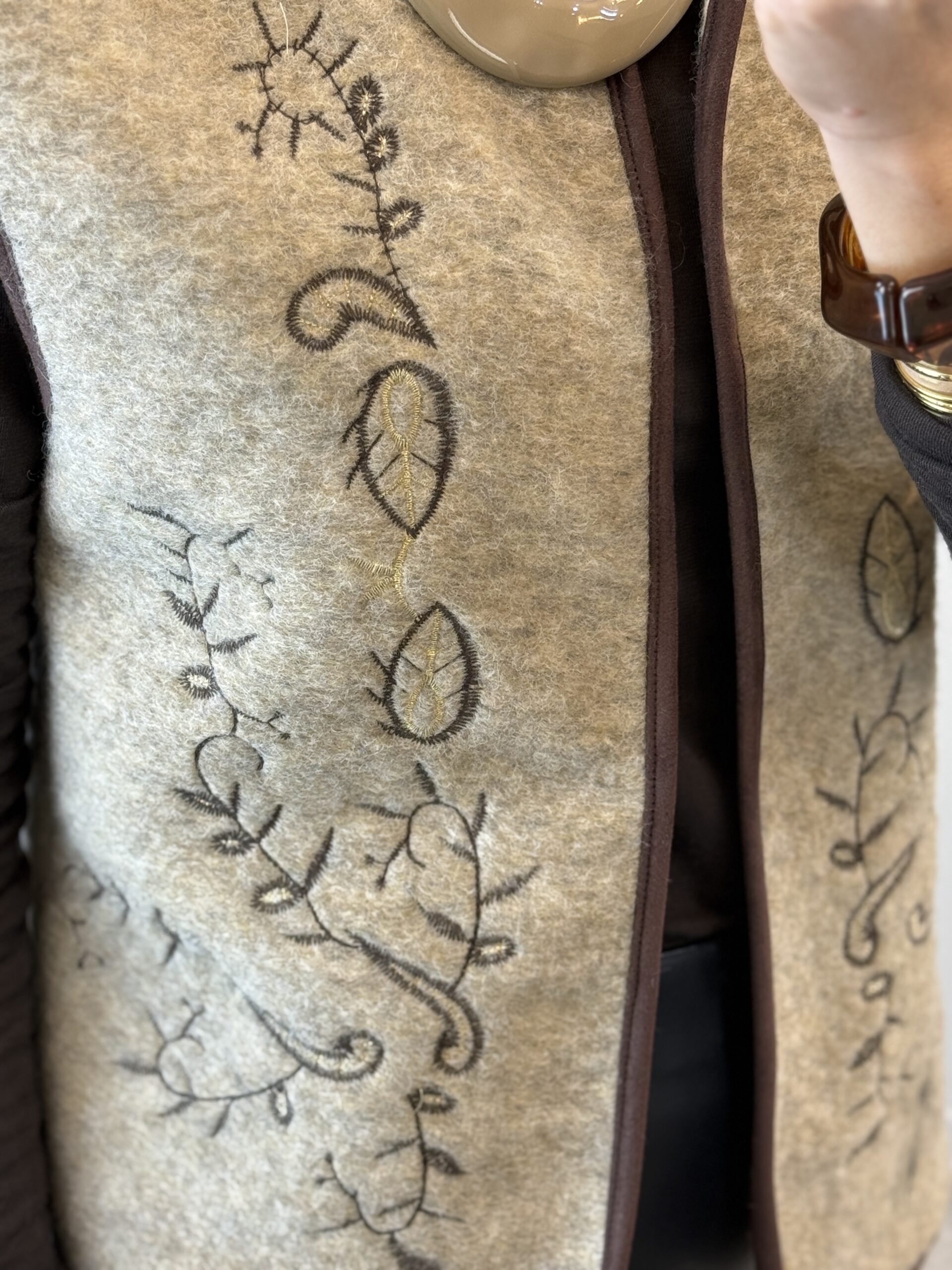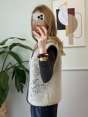 Gilet beige melange da tenere aperto con orli moro e ricami sul davanti moro/lurex dorato.