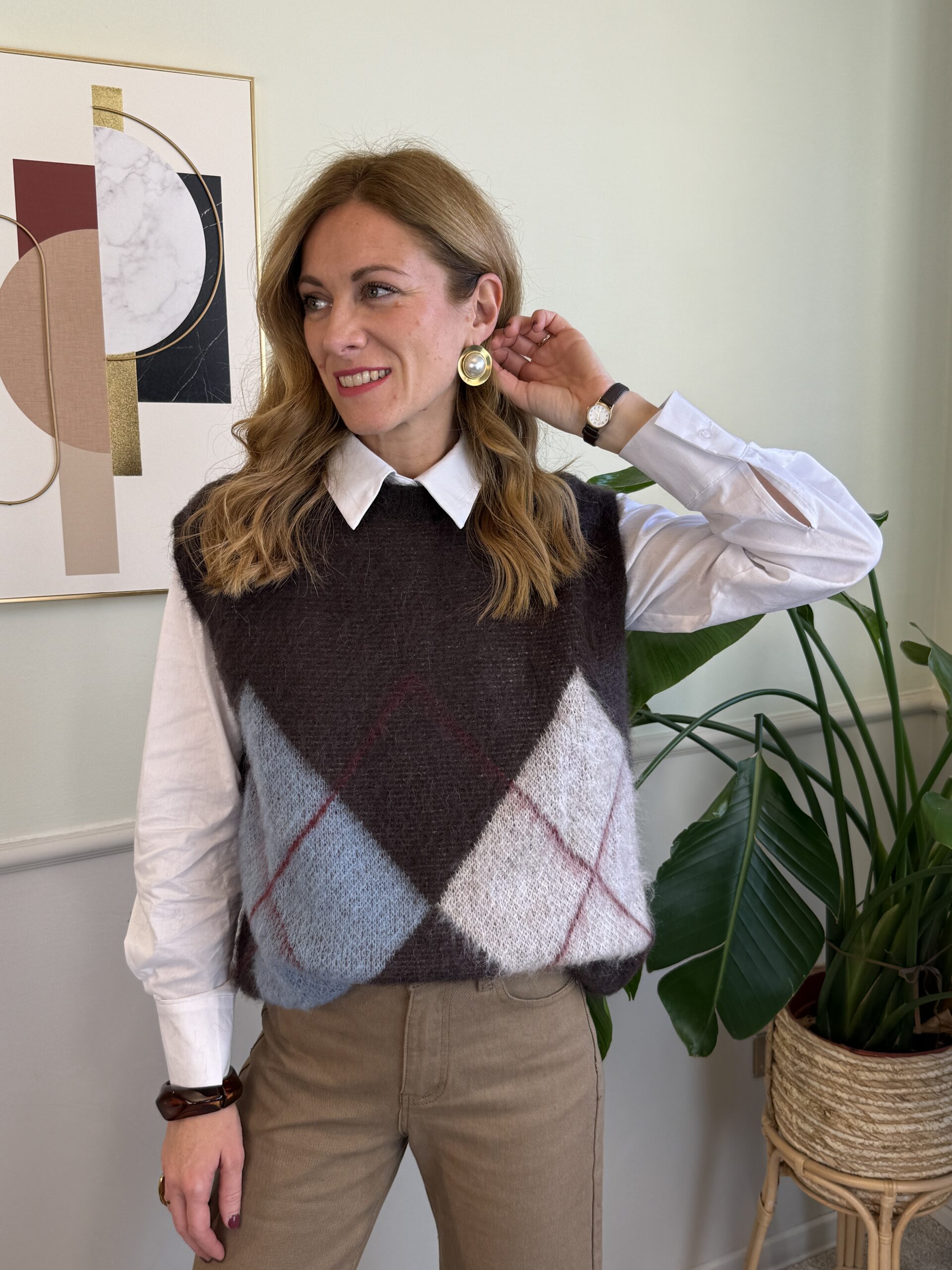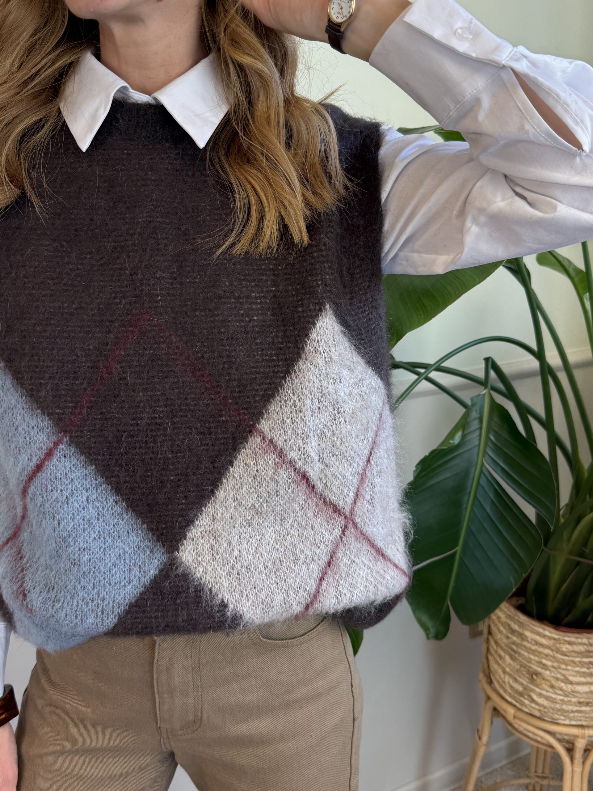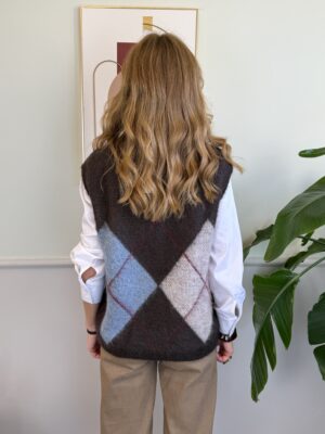 Gilet giro collo moro con rombi intrecciati sulle tonalità dell’azzurro, beige e rosso inverno.