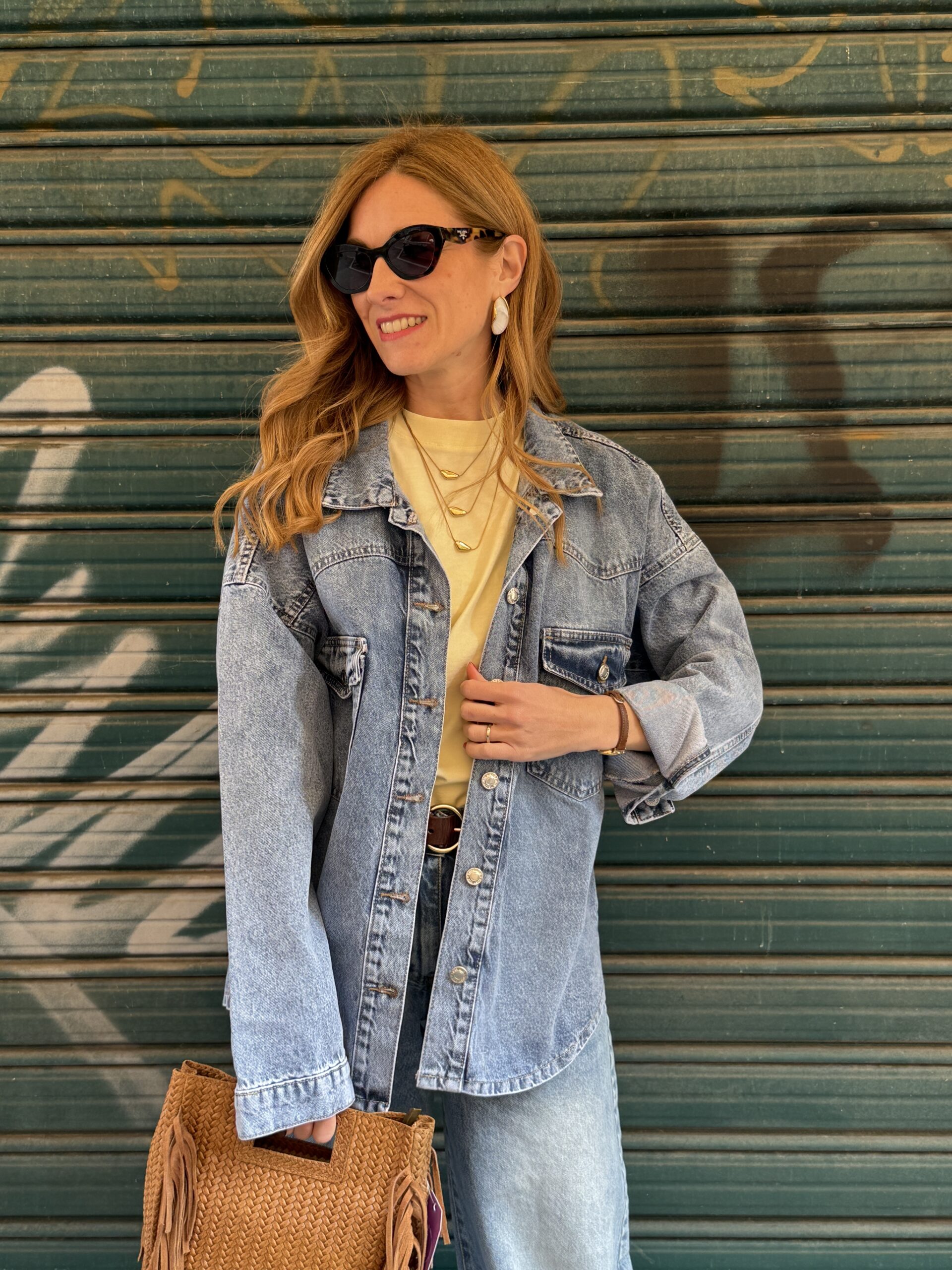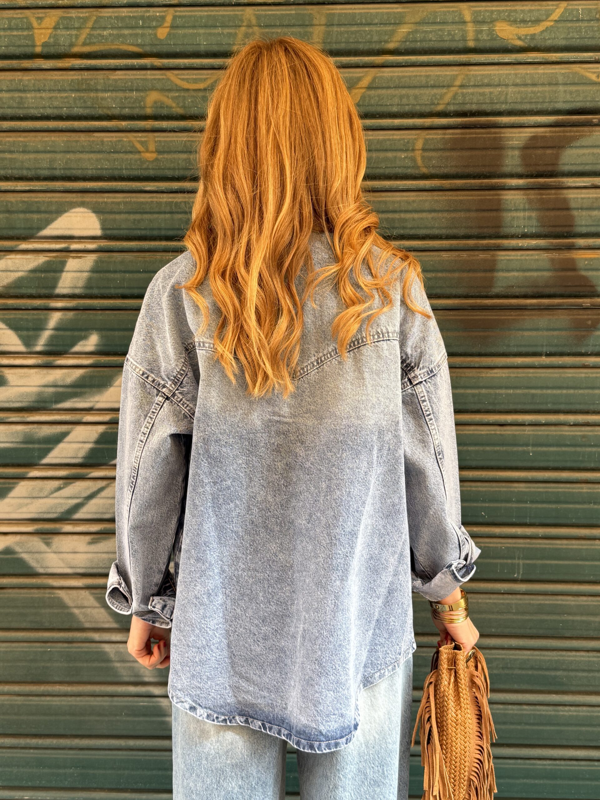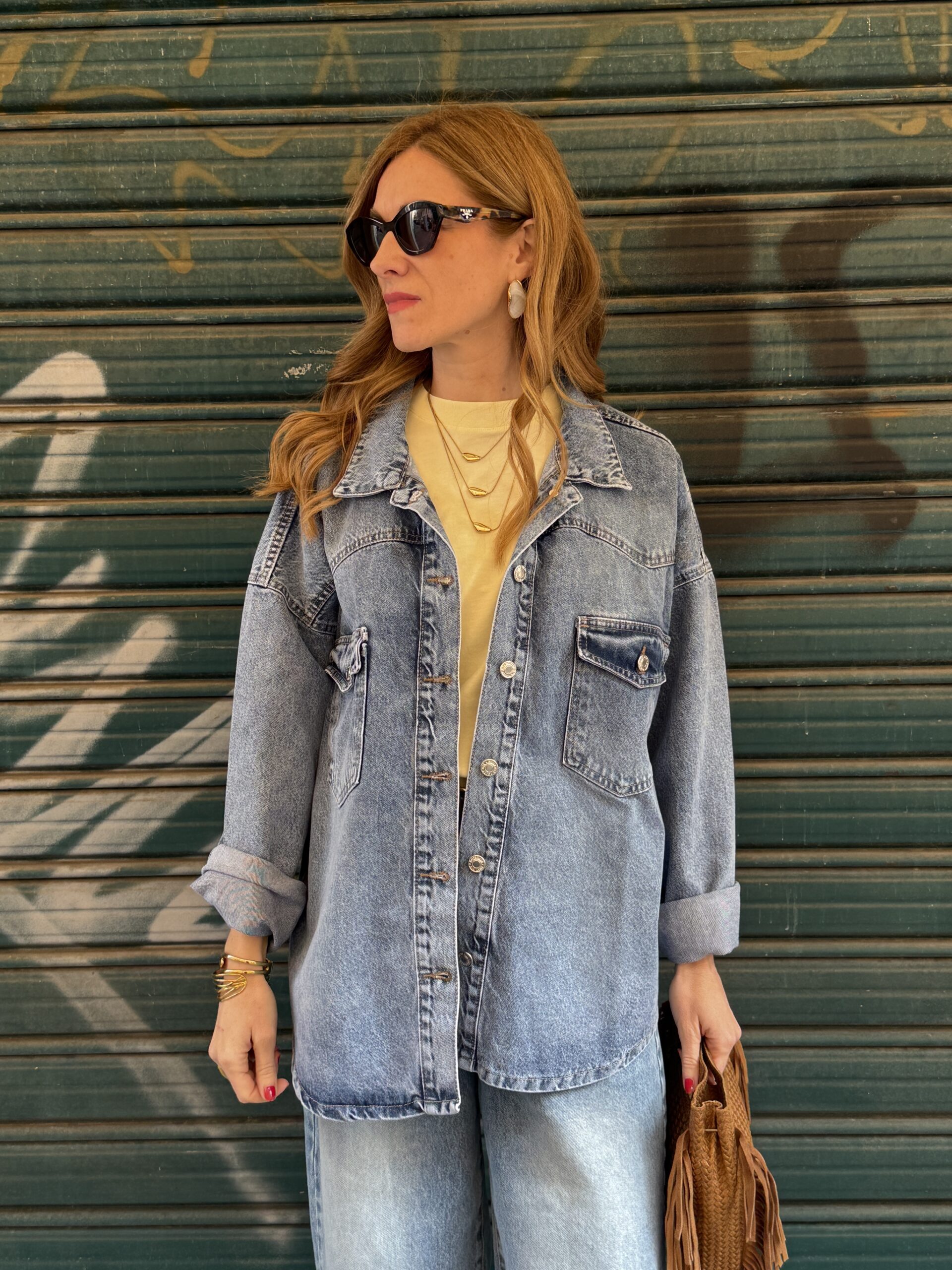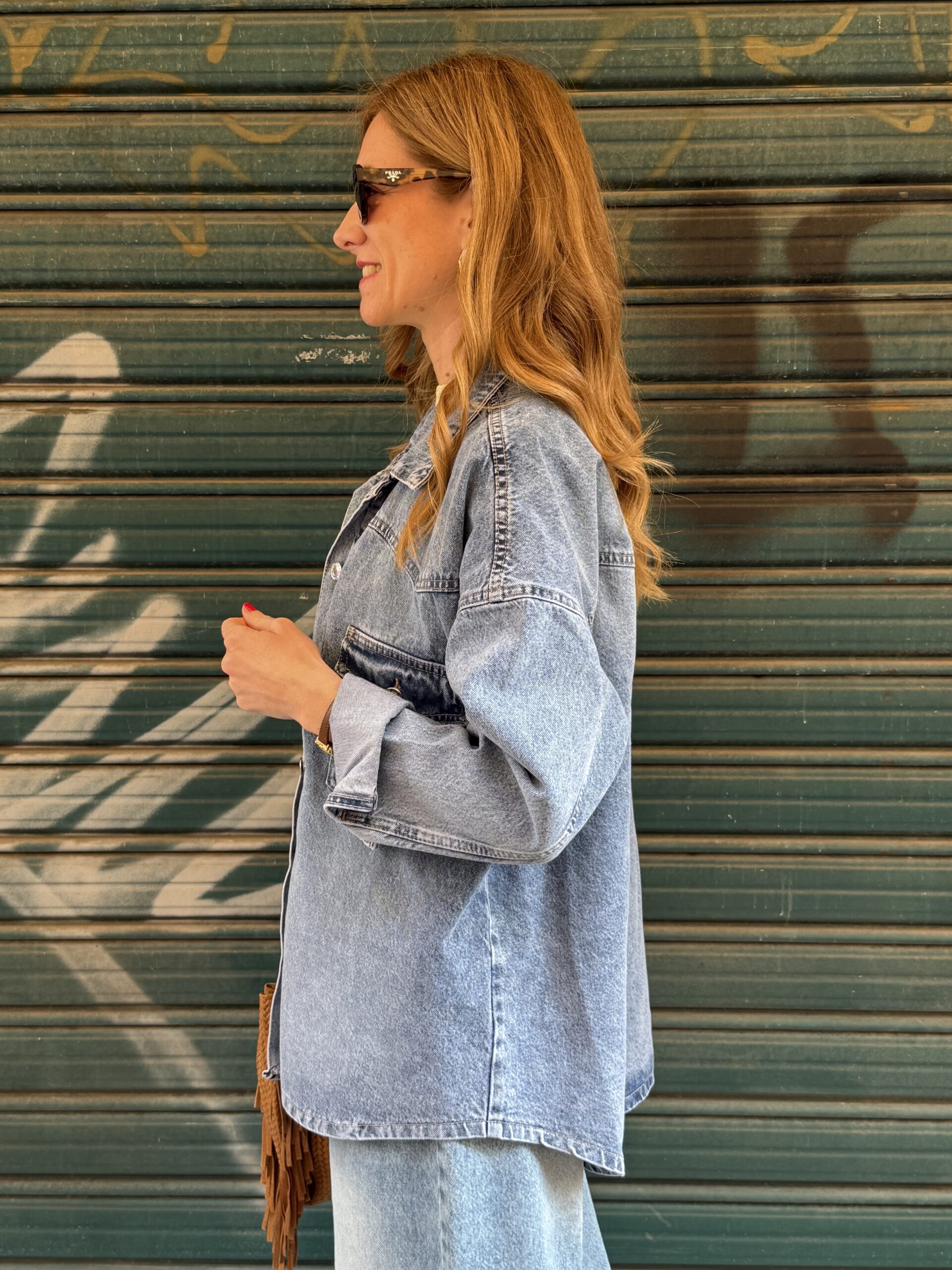 Maxi giubbino in jeans con spalla scesa e tasche applicate sul davanti.
