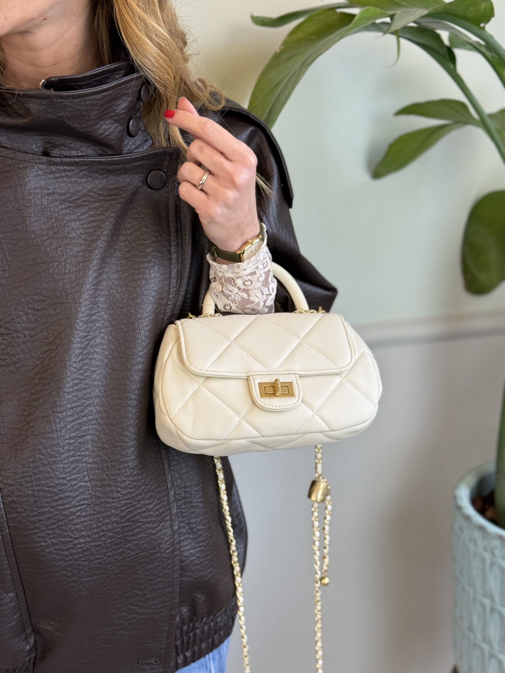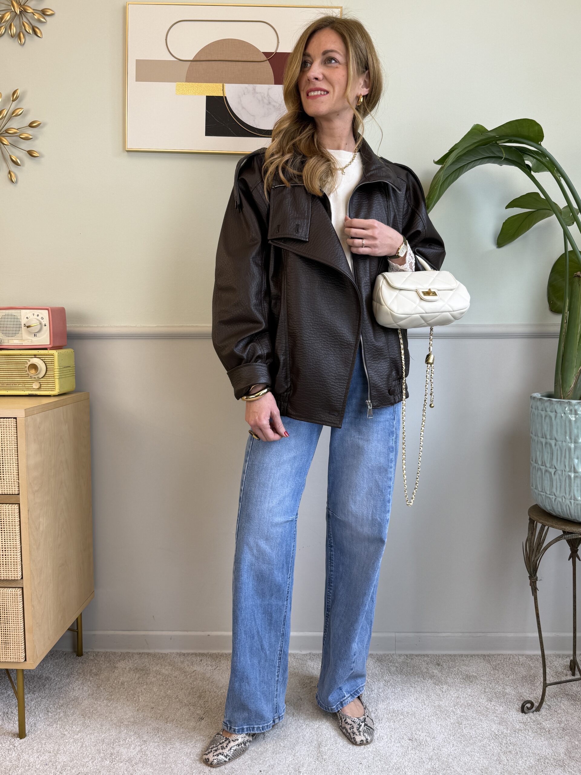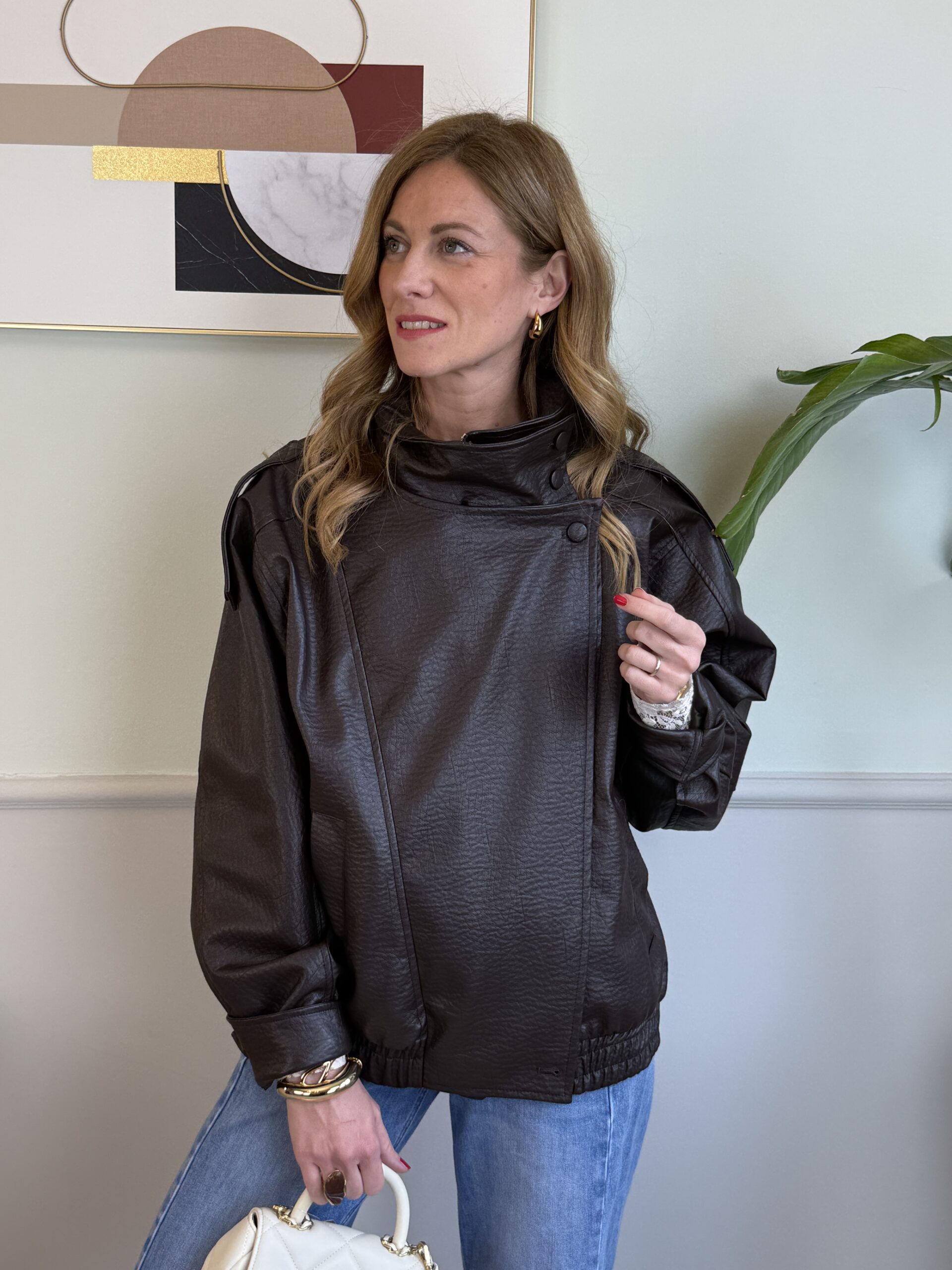 Giubbotto in ecopelle martellata moro. Modello a spalla scesa