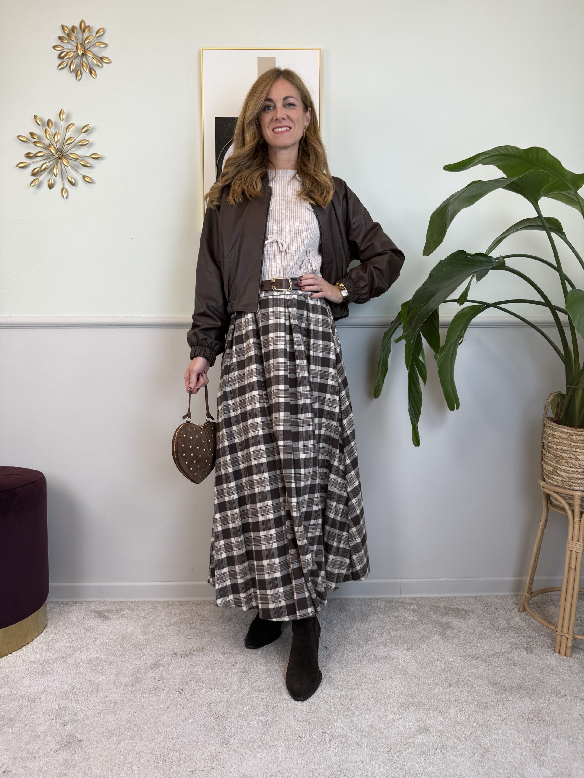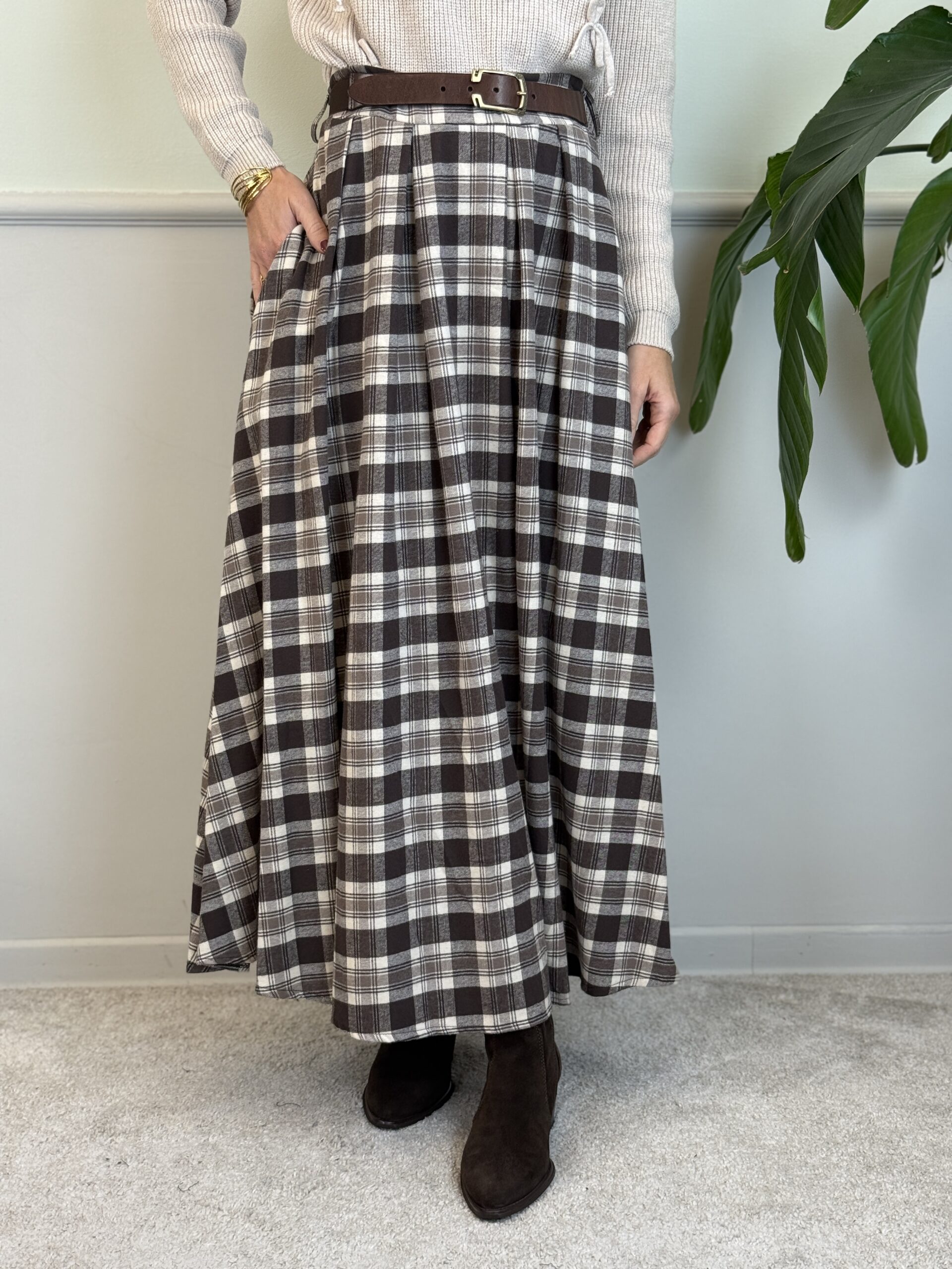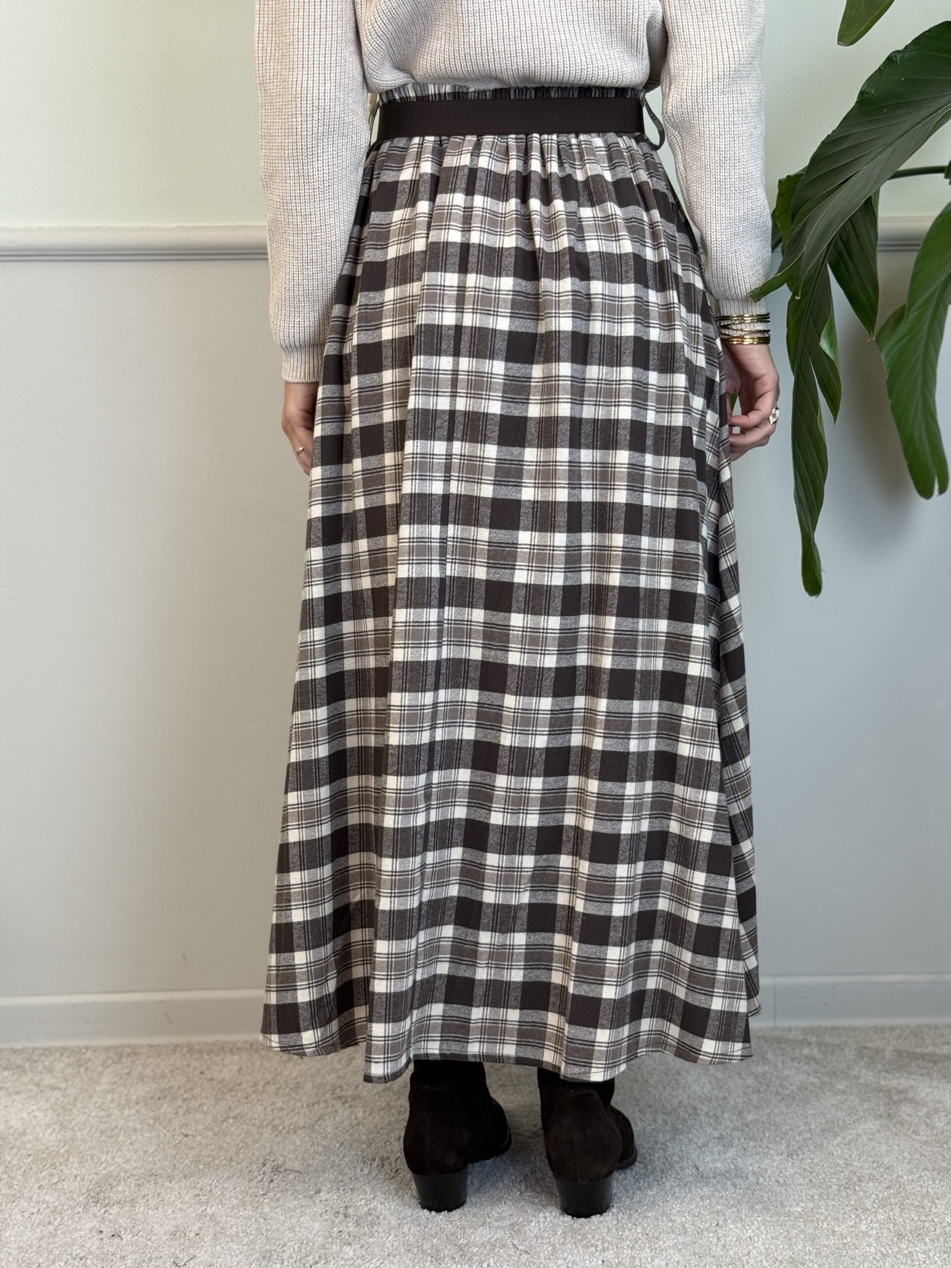 Gonna lunga a ruota in flanella calda. Pieghe sul davanti, elastico in vita posteriore.