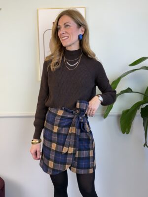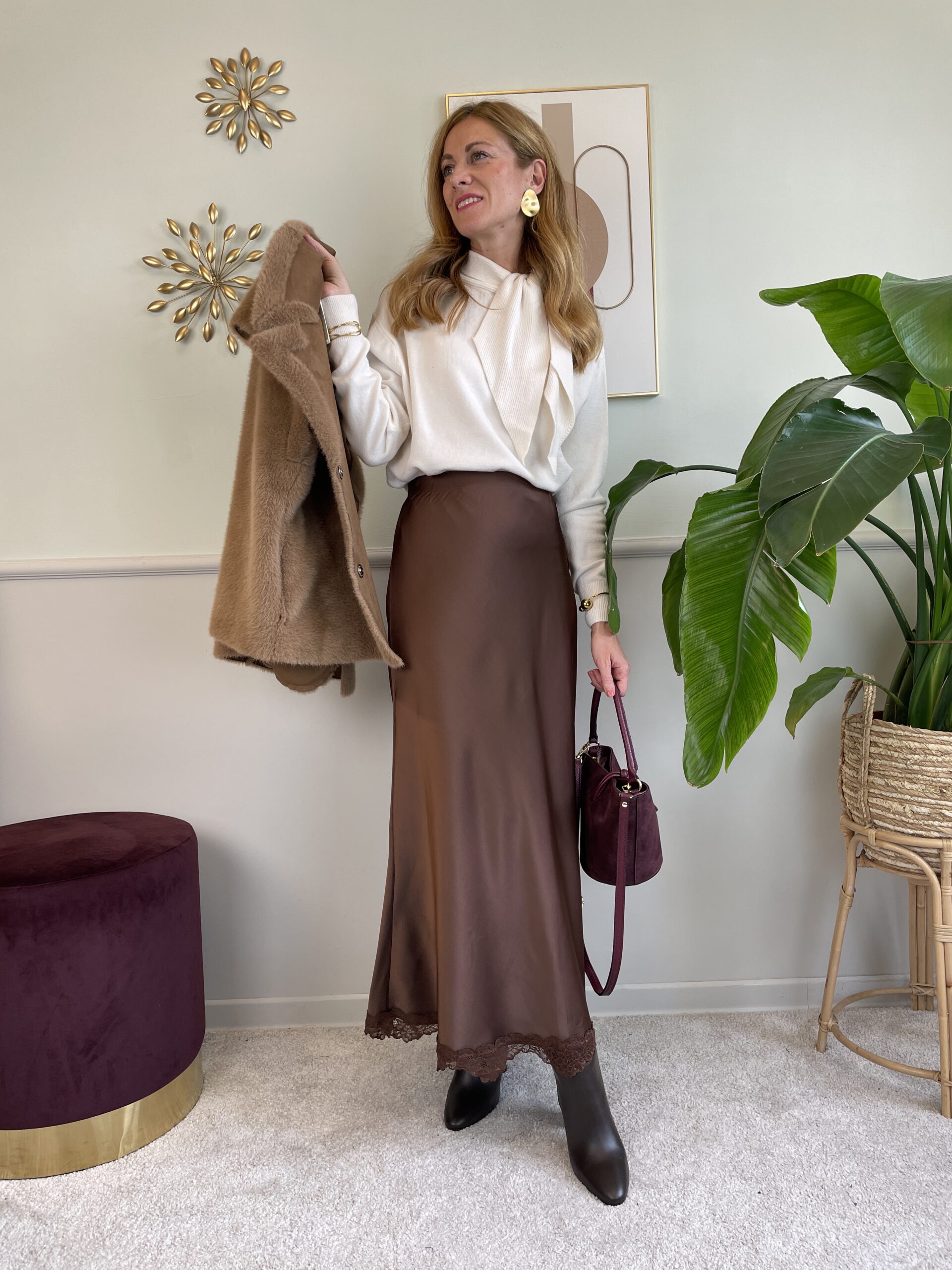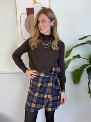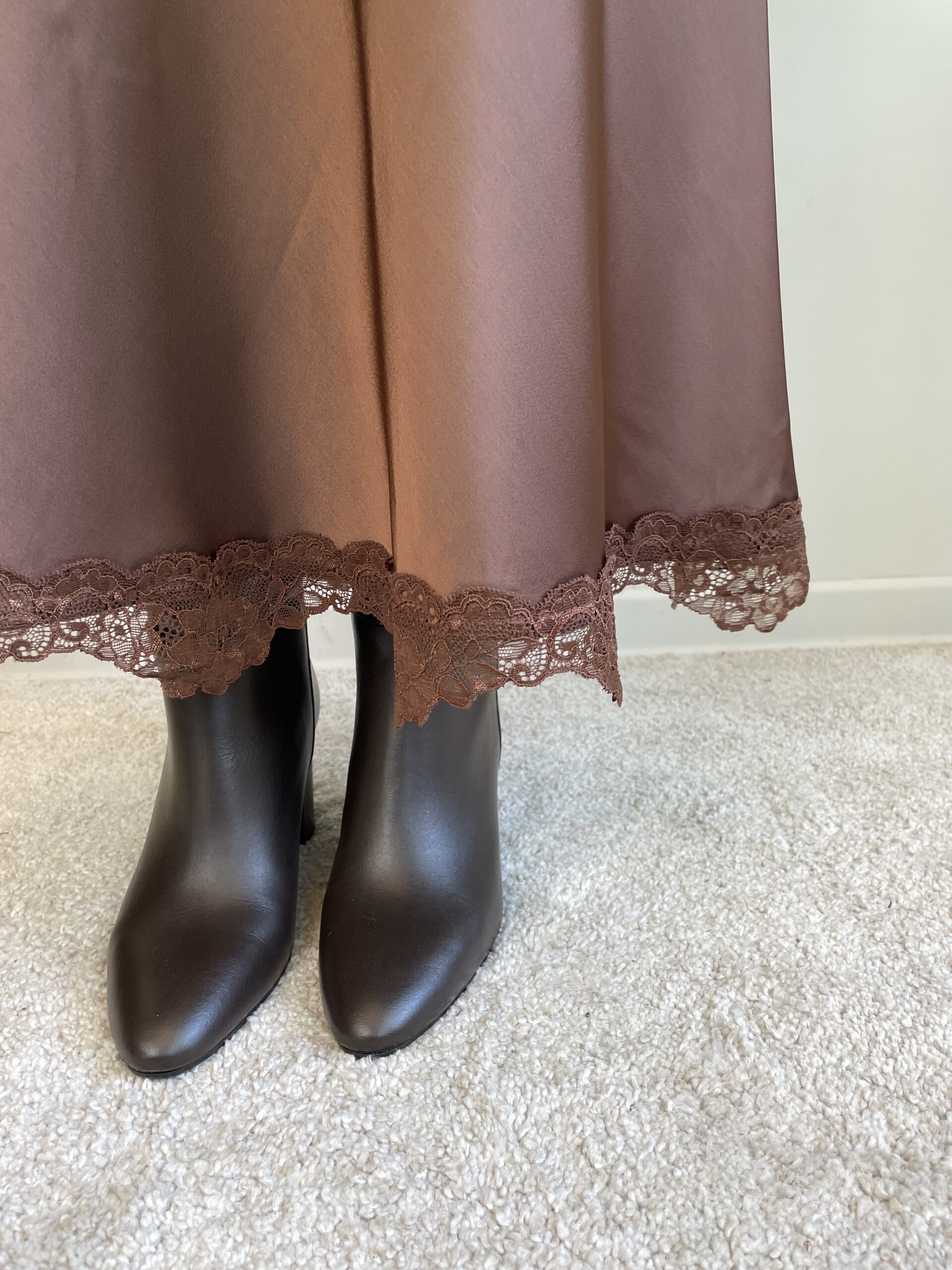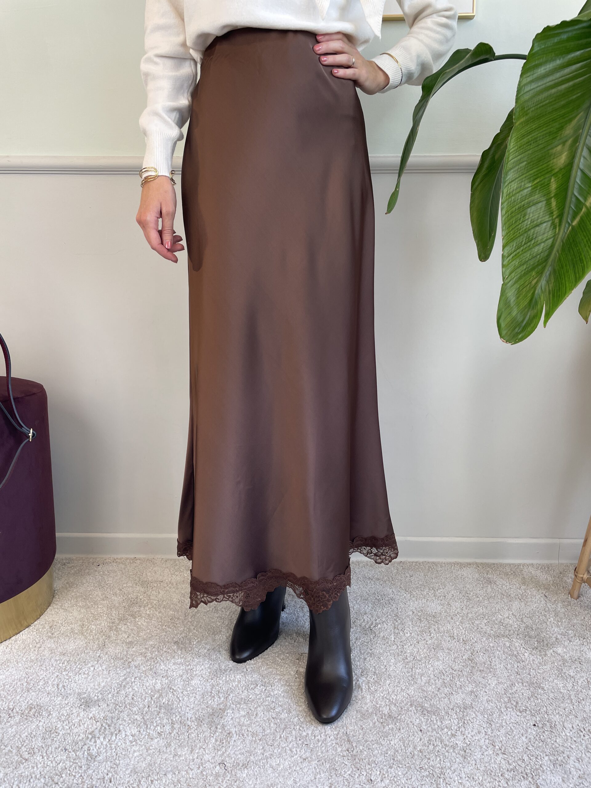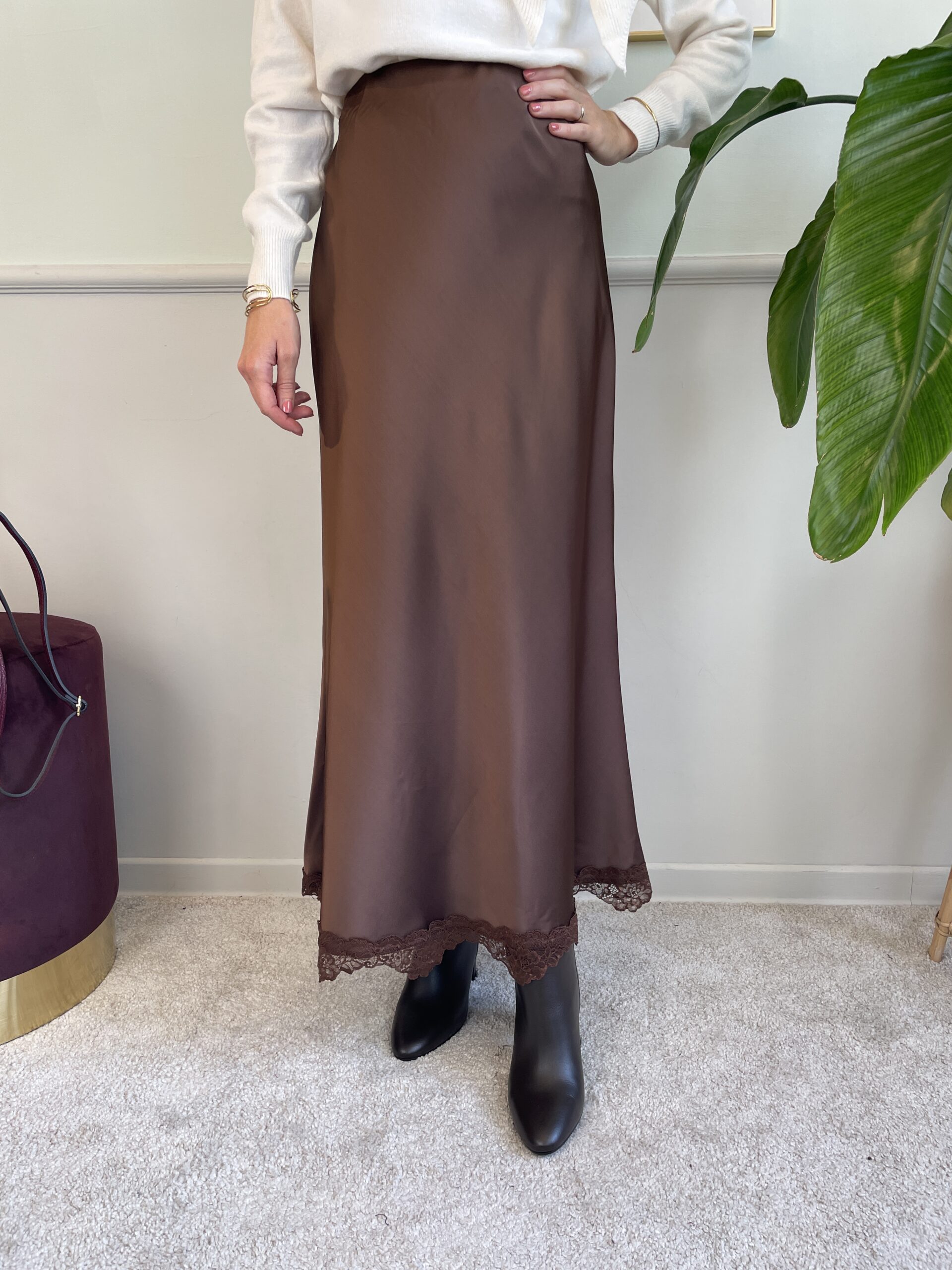 Gonna in raso orlo in pizzo marrone