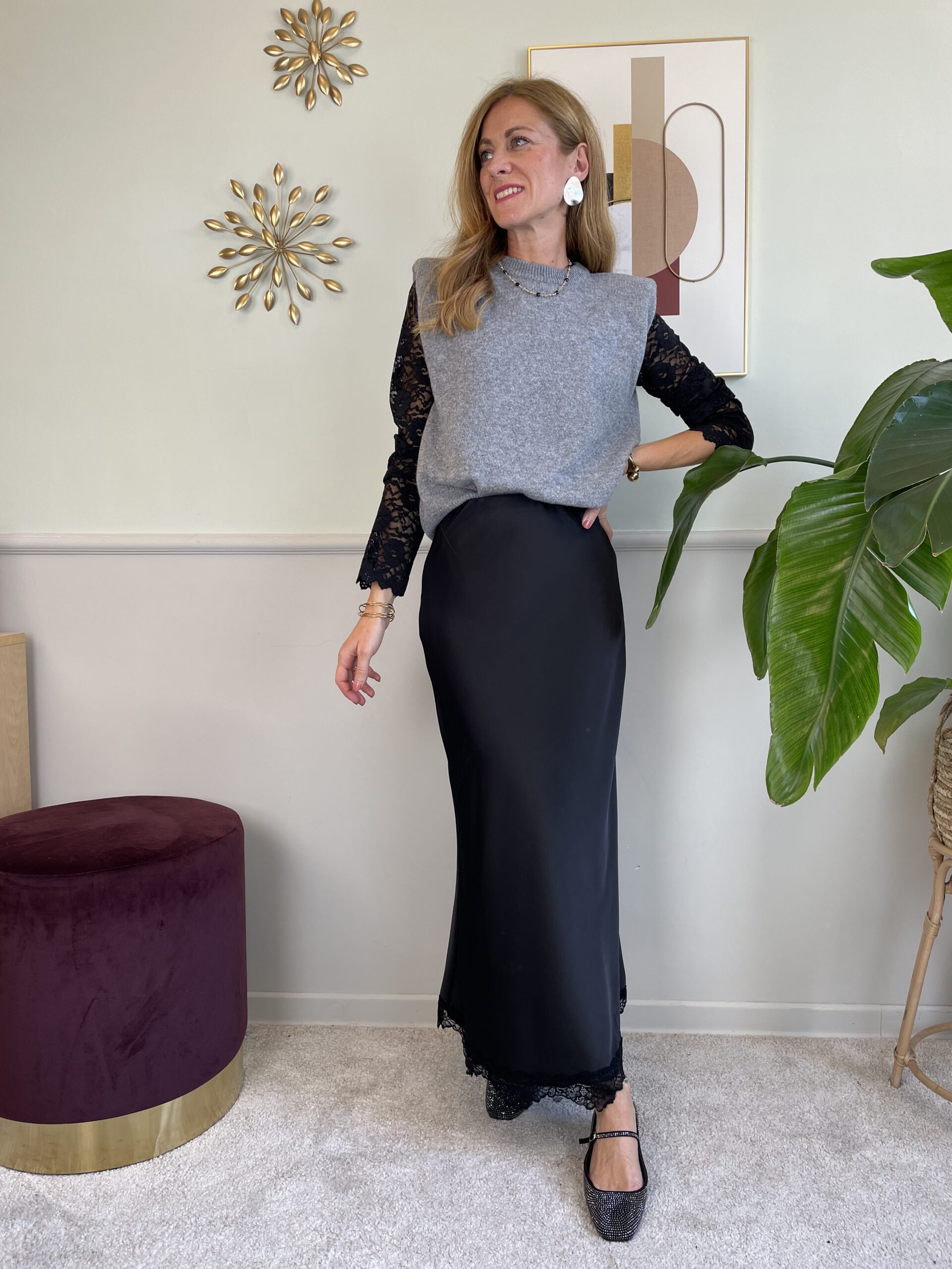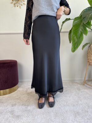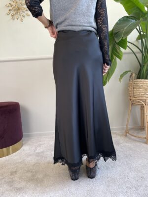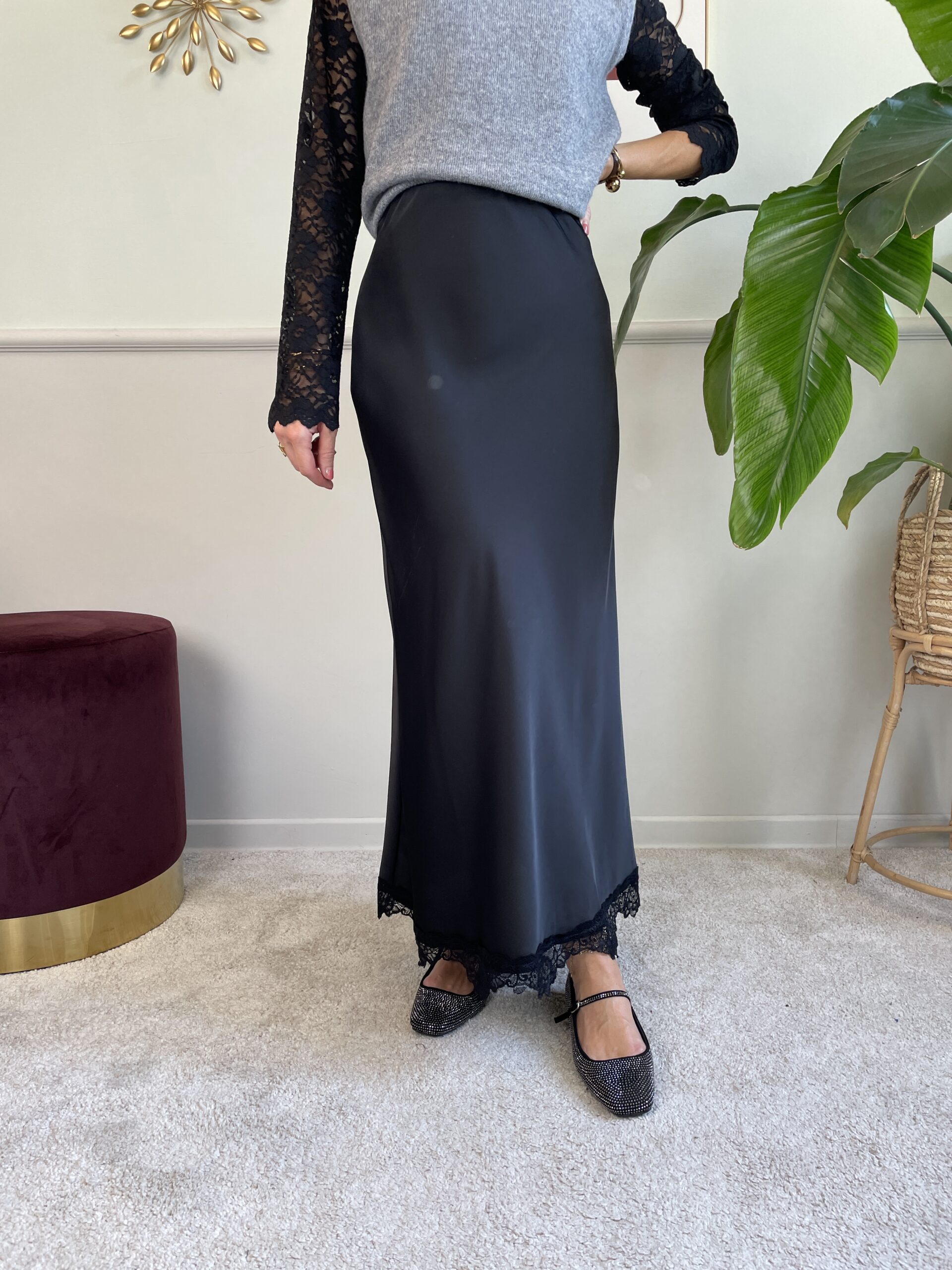 Gonna lunga svasata in raso con orlo in pizzo, vita alta con elastico interno.