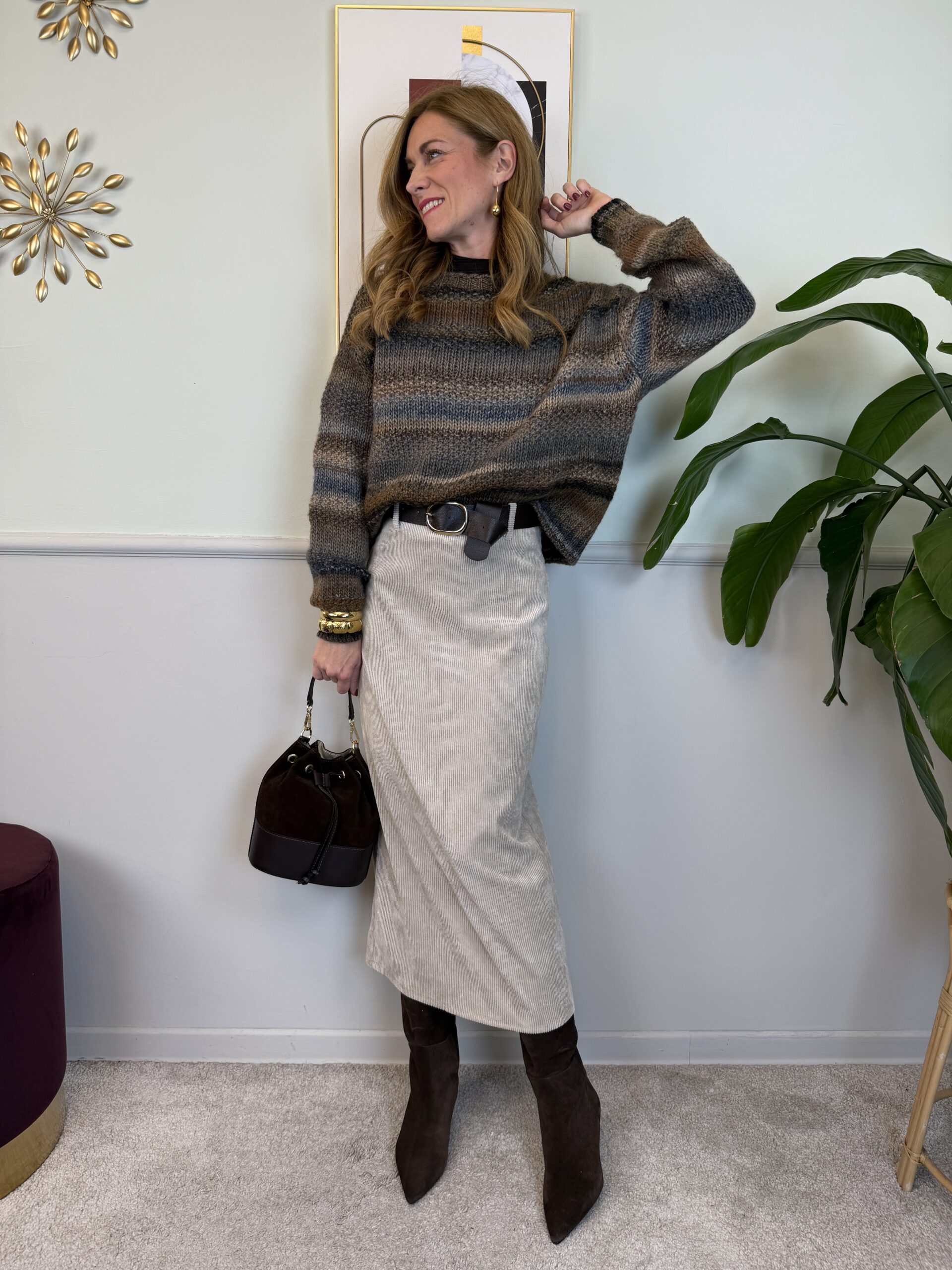Gonna longuette in velluto a coste color panna. Presenta spacco posteriore per facilitare la camminata e cintura alta in vita con fibbia metallica.