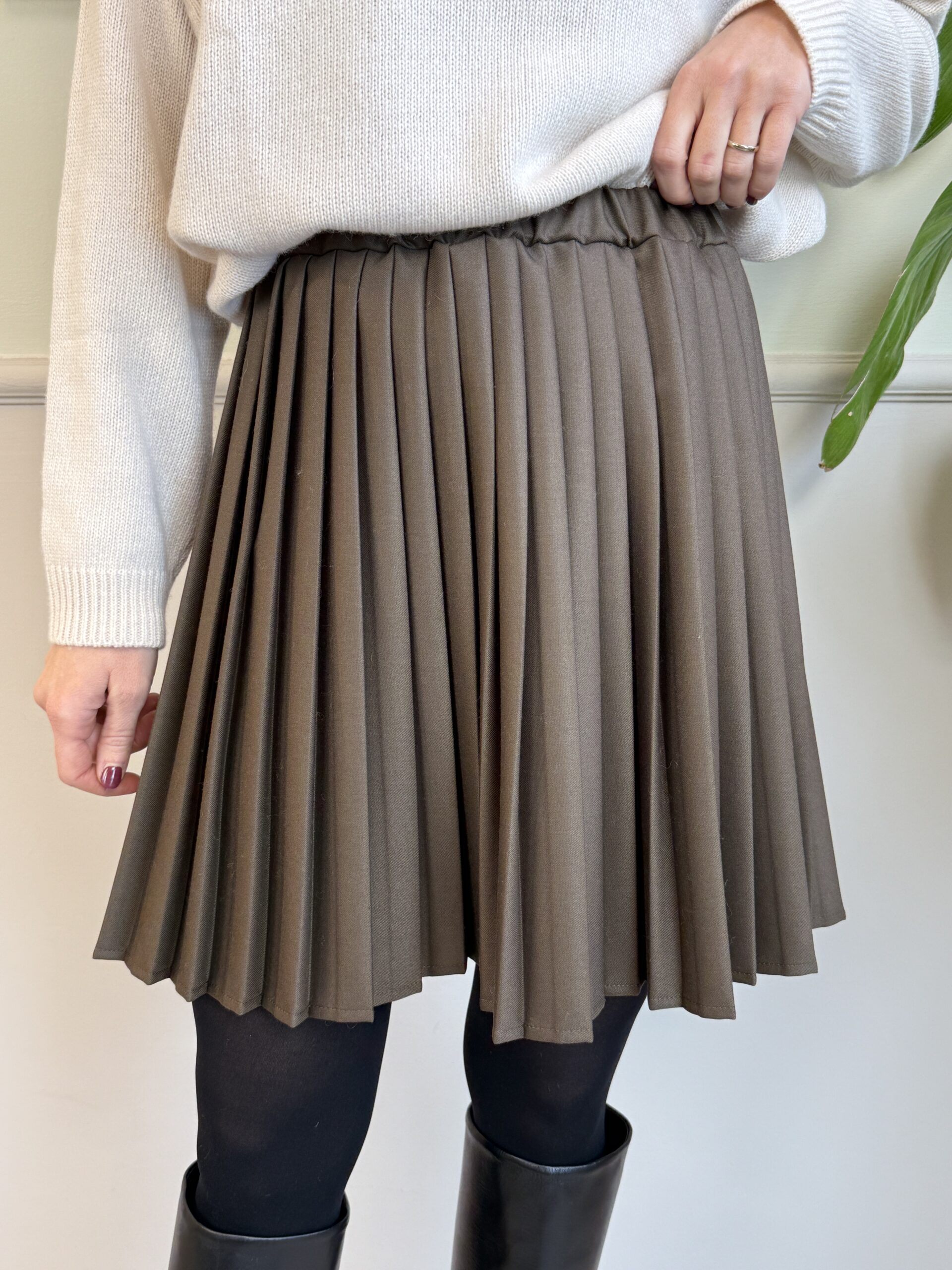 Gonna plissettata con elastico in vita in colore verde fango.