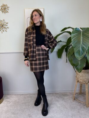 Gonna lunga a portafoglio con elastico in vita, bottone interno e lacciatura laterale a cintura. Fantasia vichy con lurex dorato, orlo asimmetrico.