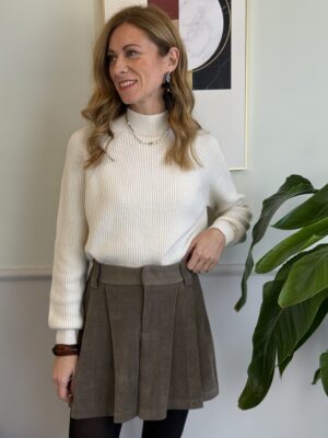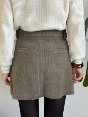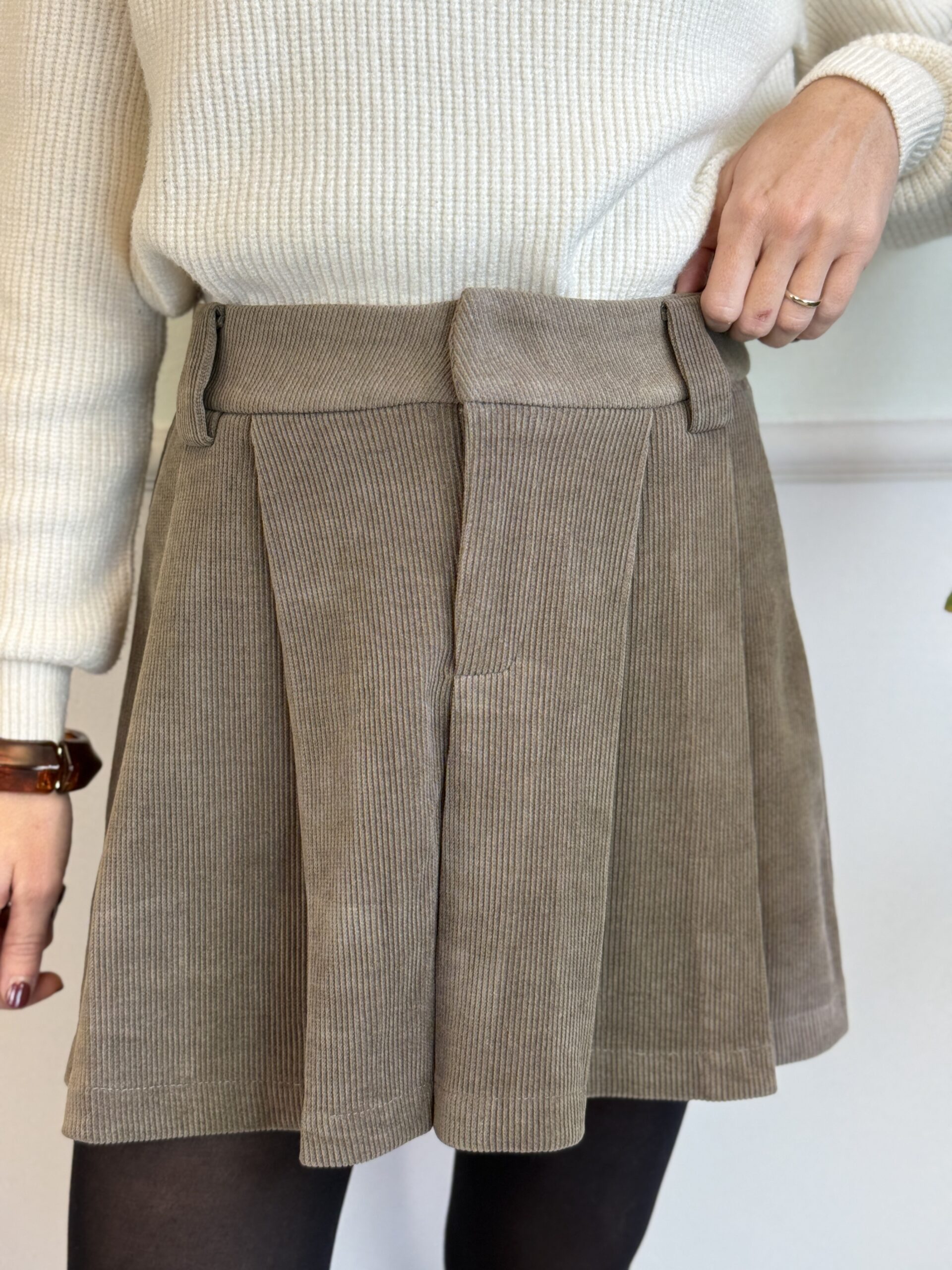 Gonnellina in velluto a pieghe color khaki. Presenta una fodera a shorts.