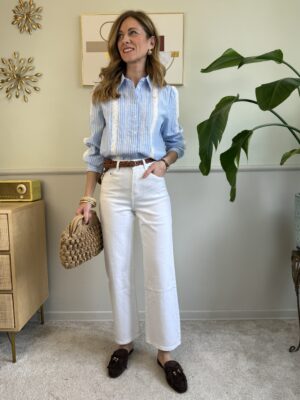 Jeans dritto cropped a vita alta, modello 5 tasche, tessuto elasticizzato.