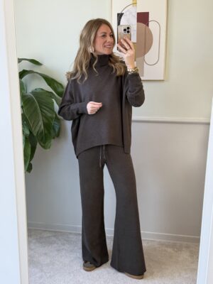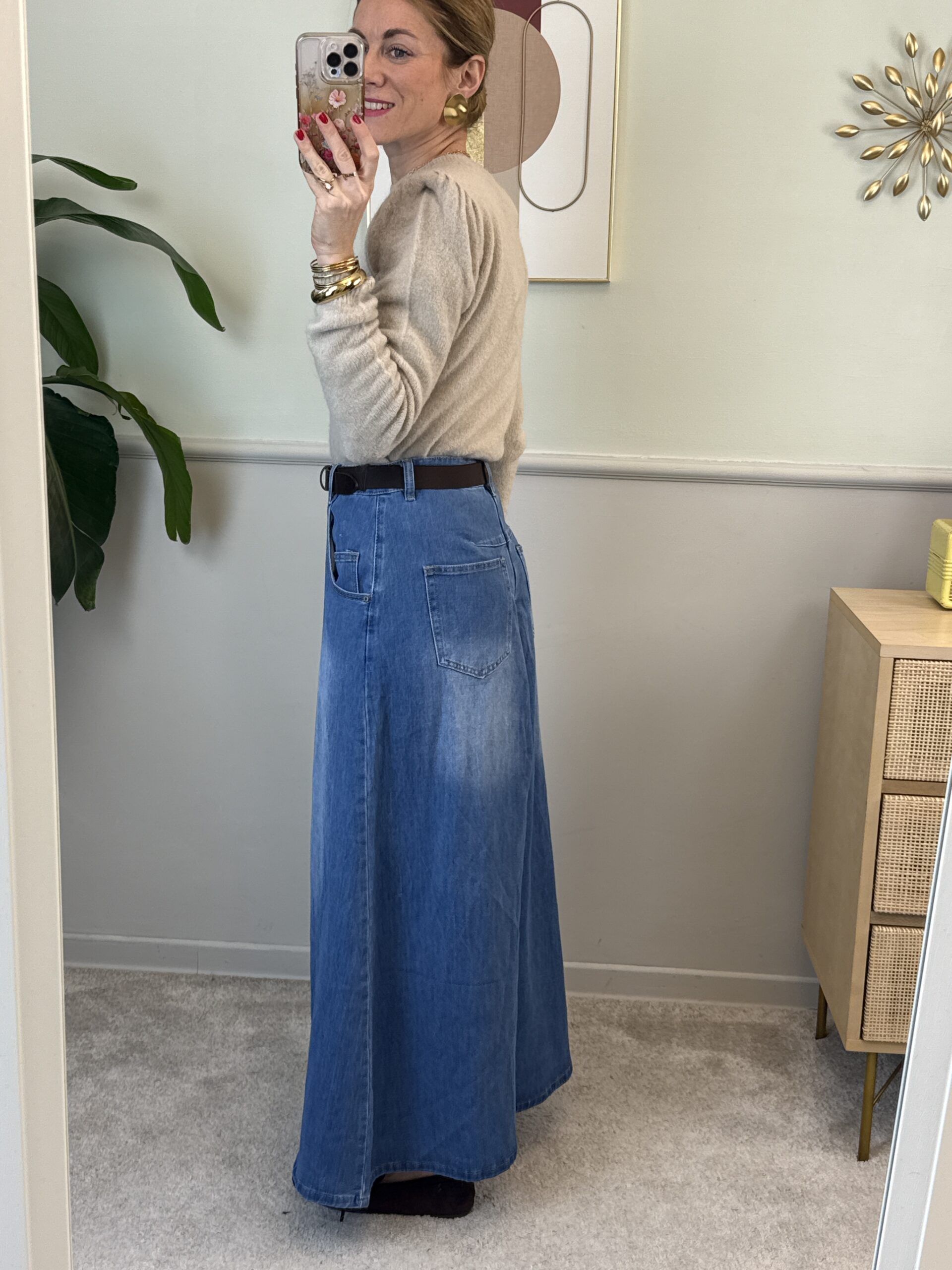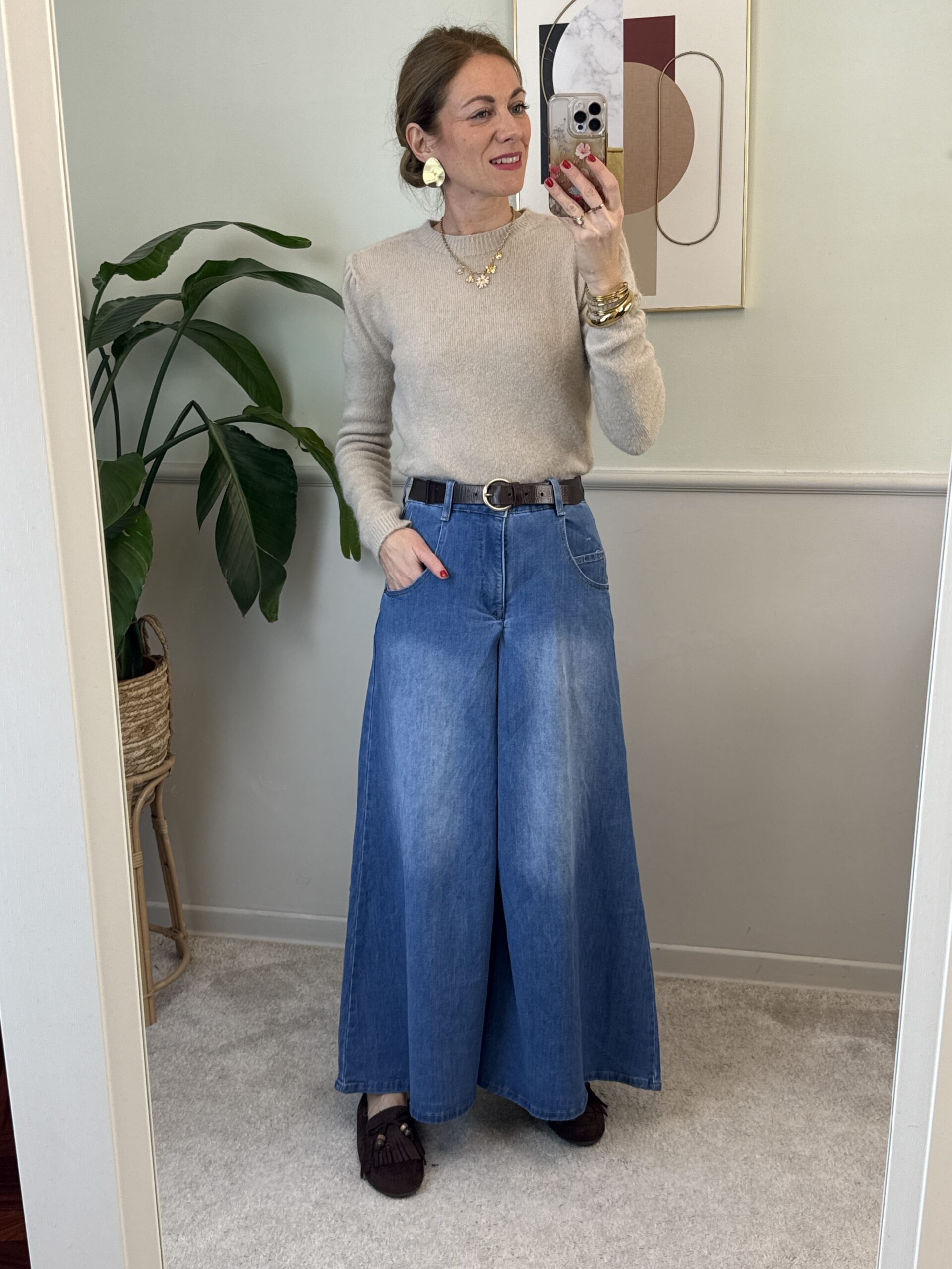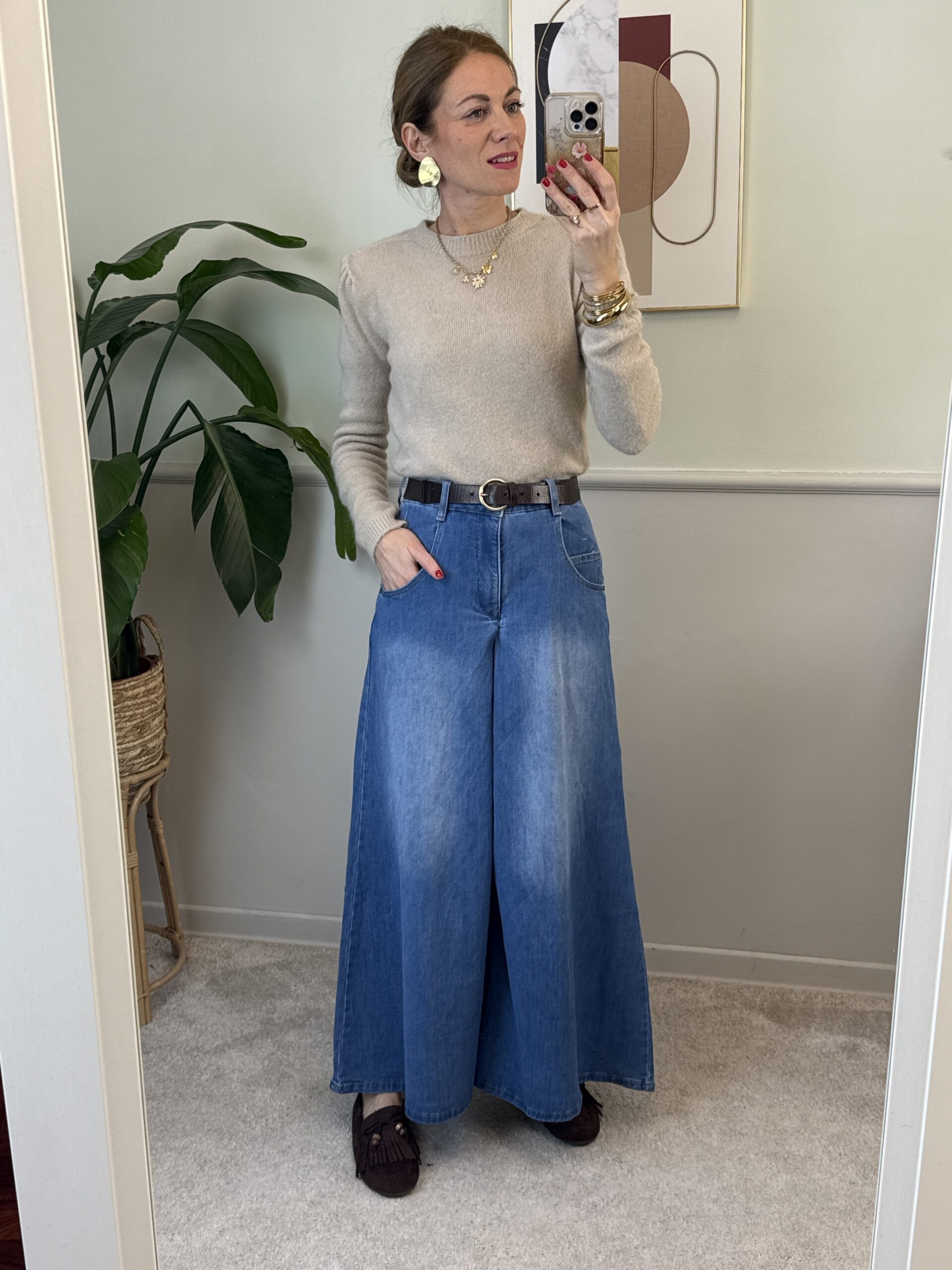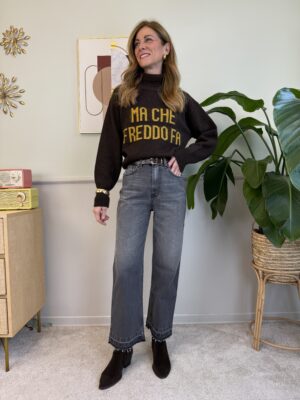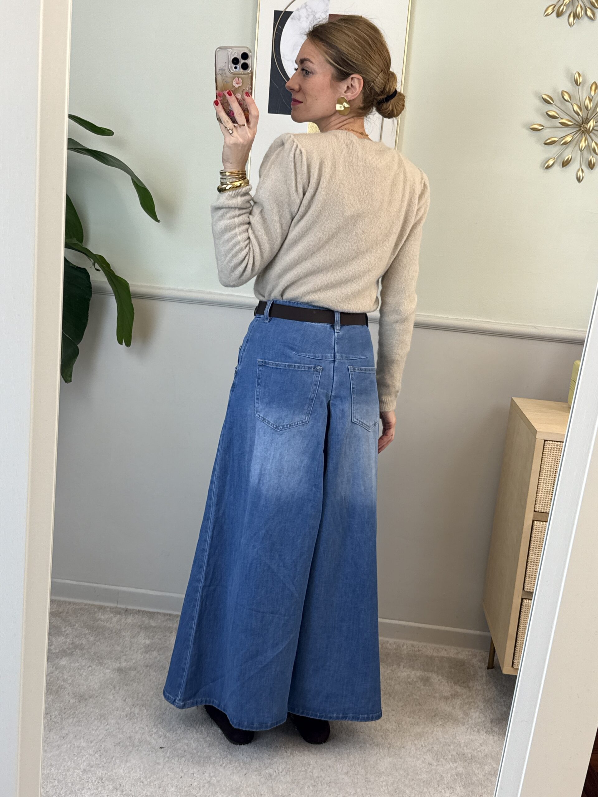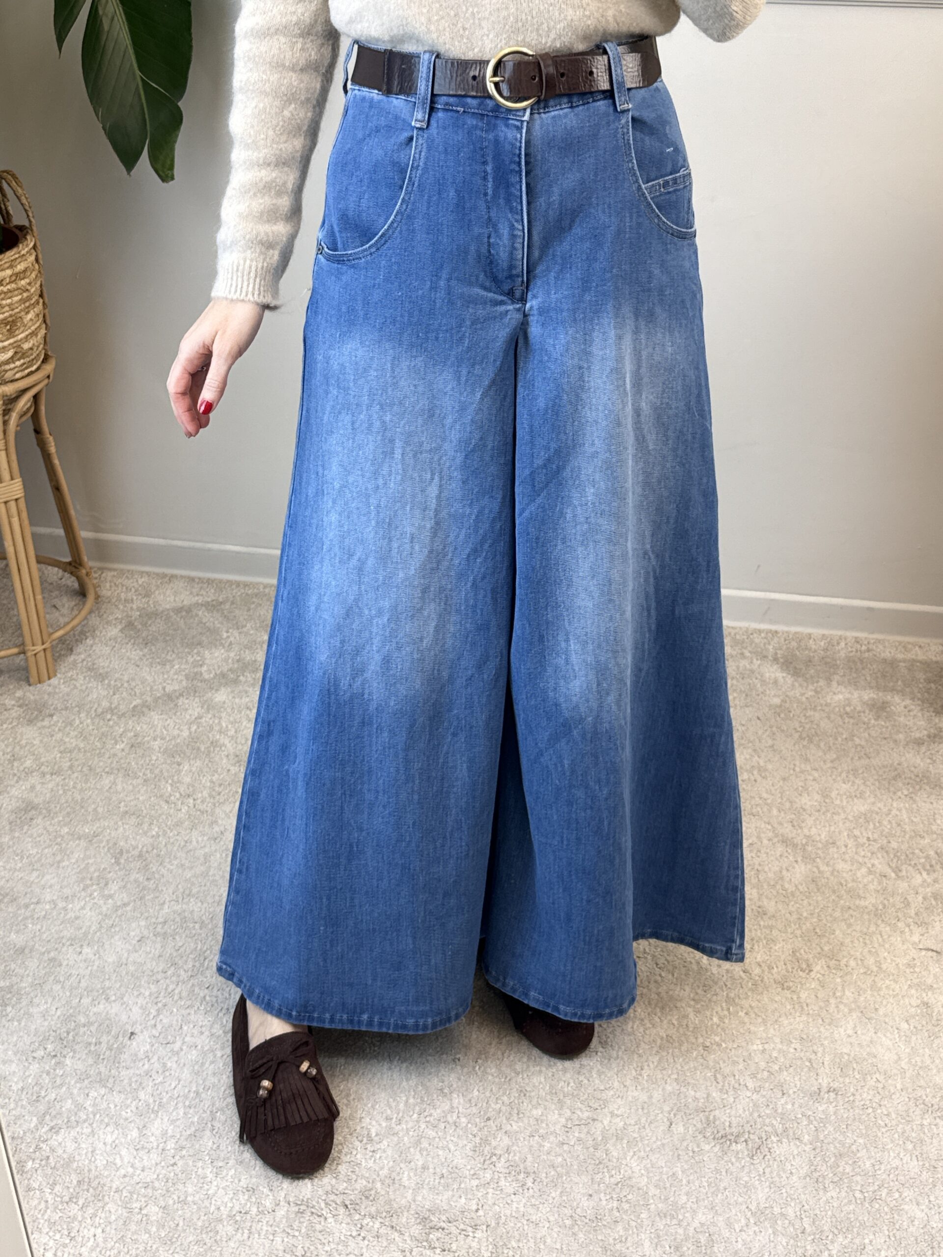 Jeans modello pantagonna, molto ampio nella parte della gamba.