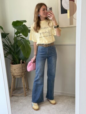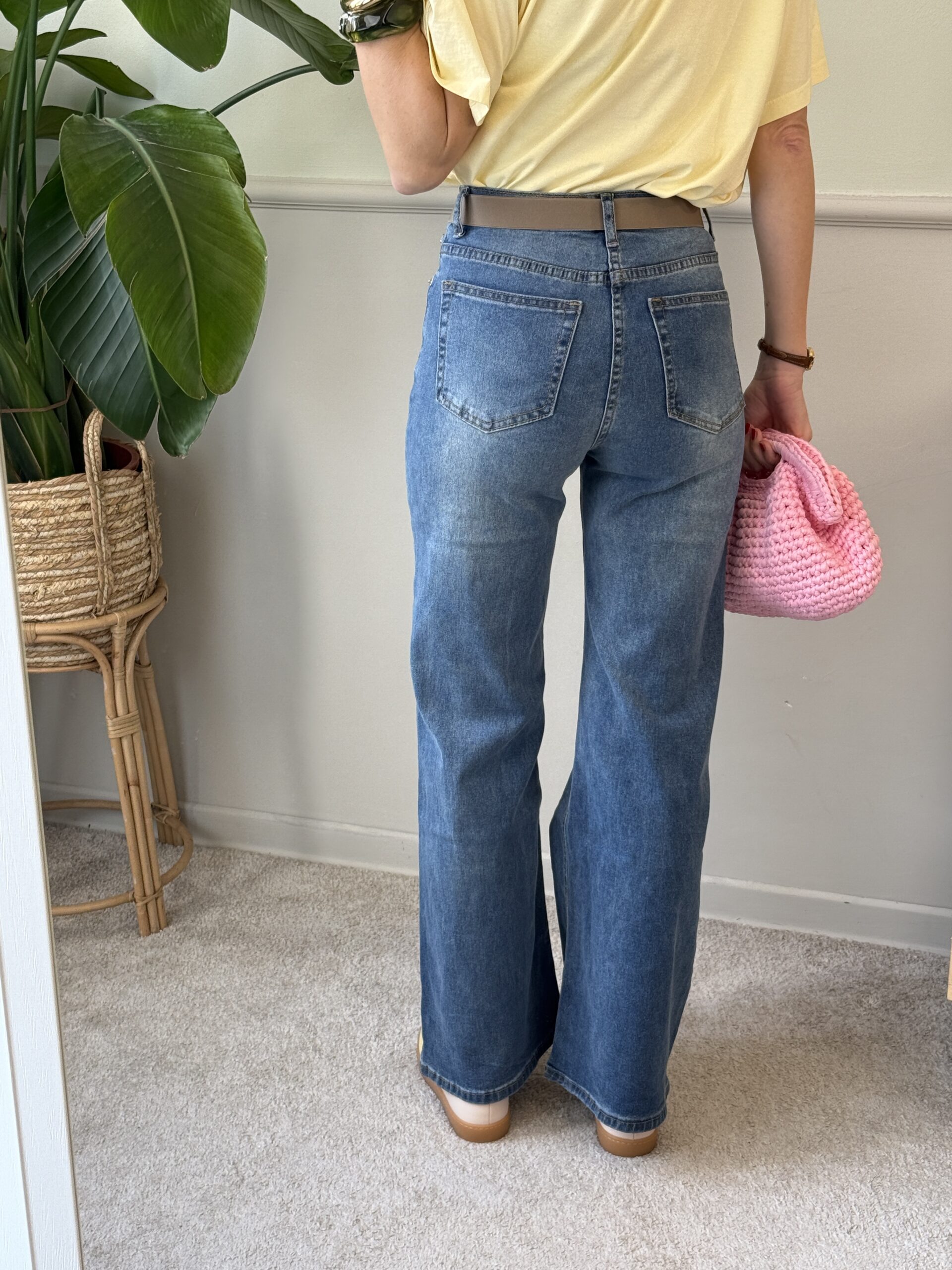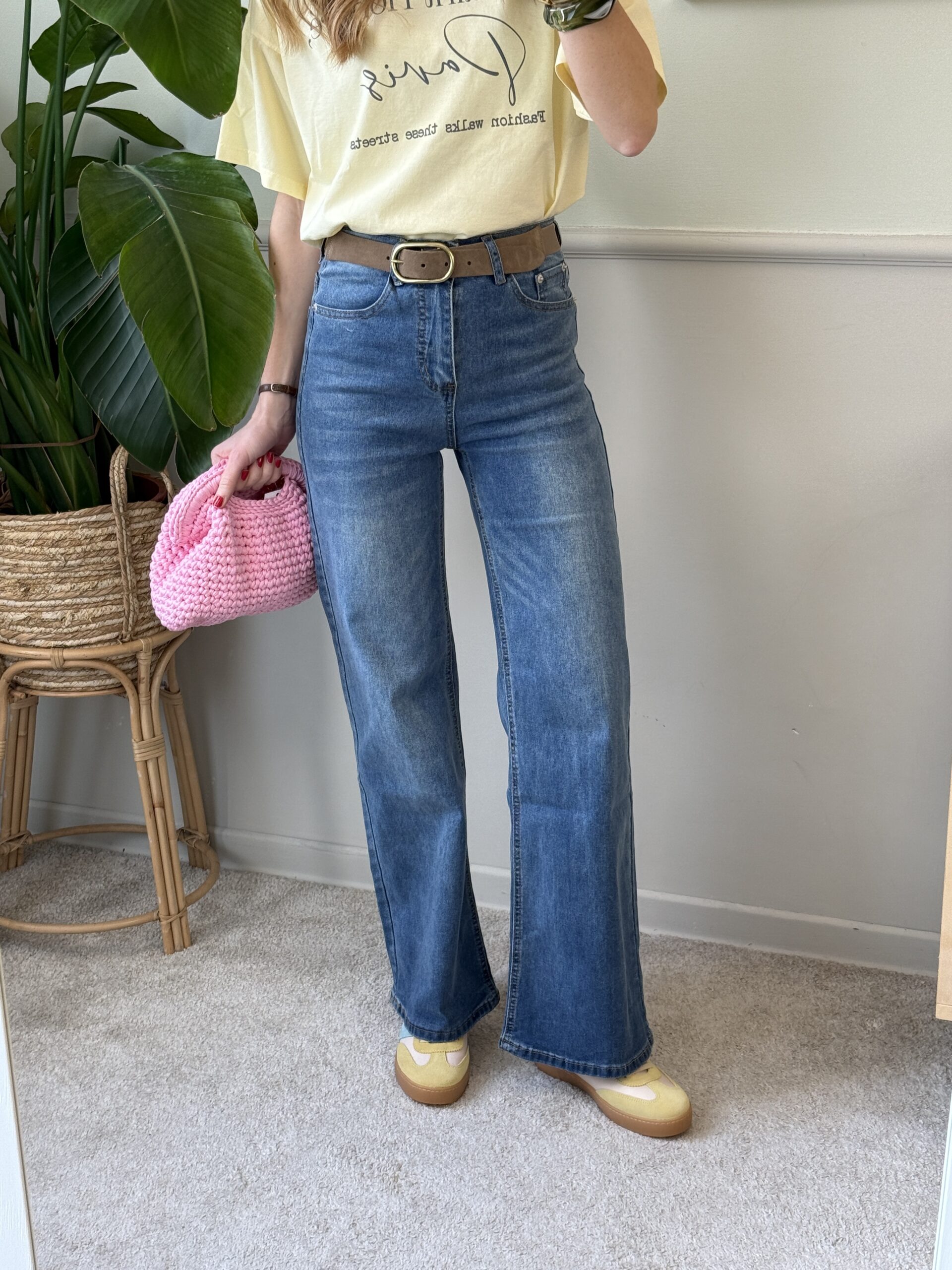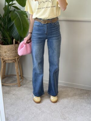 Jeans svasato elasticizzato, vita alta, leggermente sfumato.