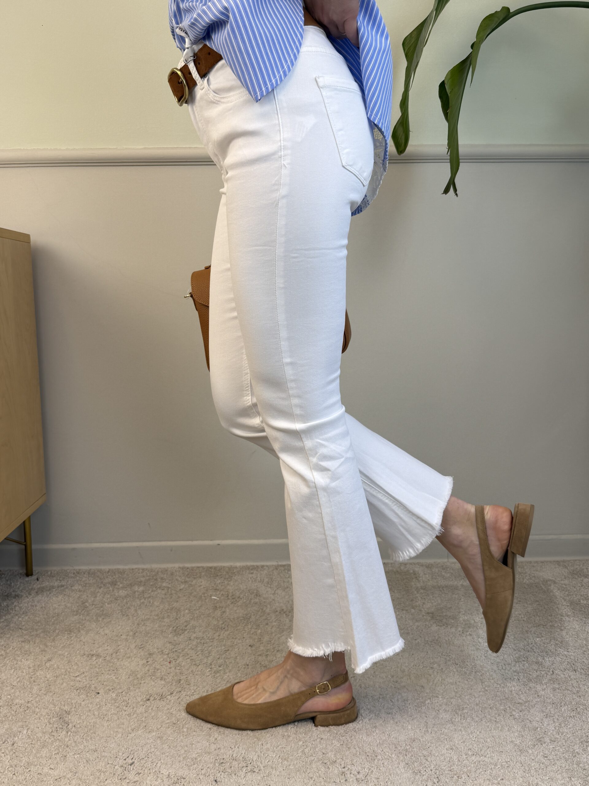 Jeans trombetta bianco con scalino e orlo sfrangiato.