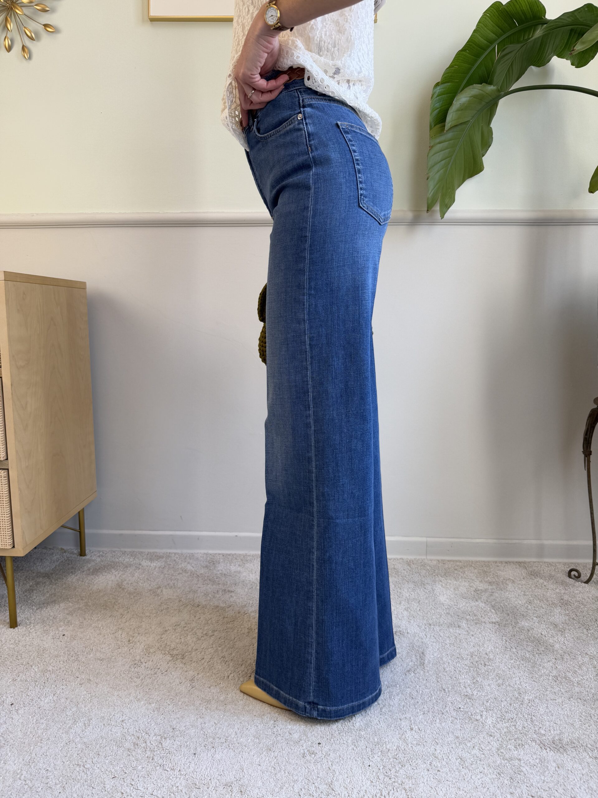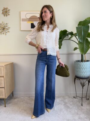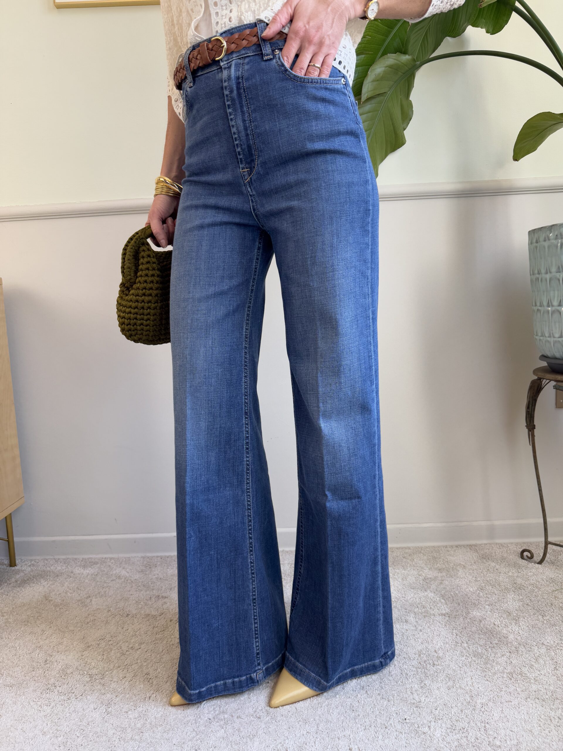 Jeans a vita alta, gamba aderente leggermente svasata.