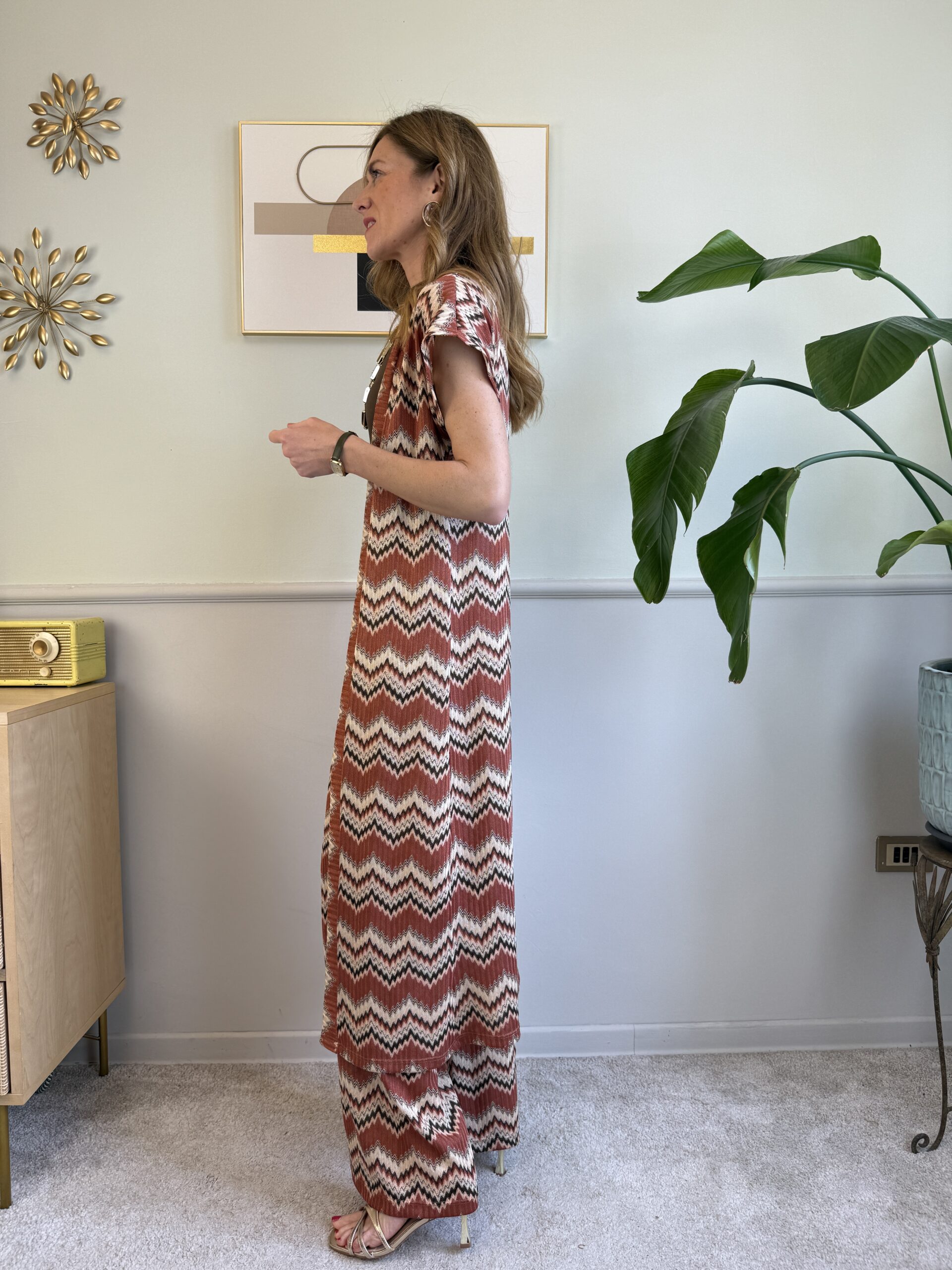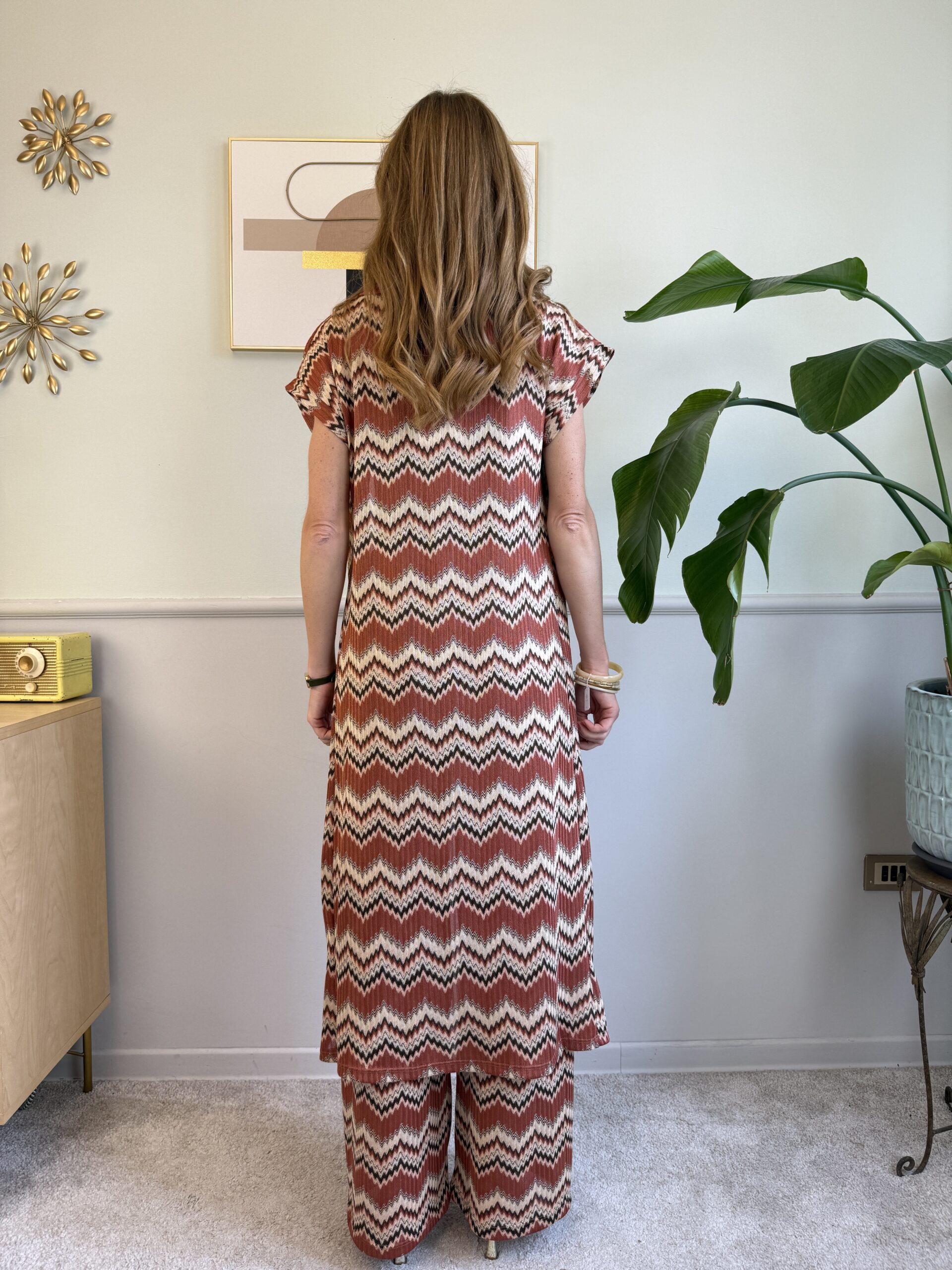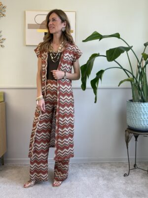 Kimono senza maniche in fantasia sui toni del terra cotta, moro, beige e rosa.