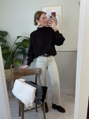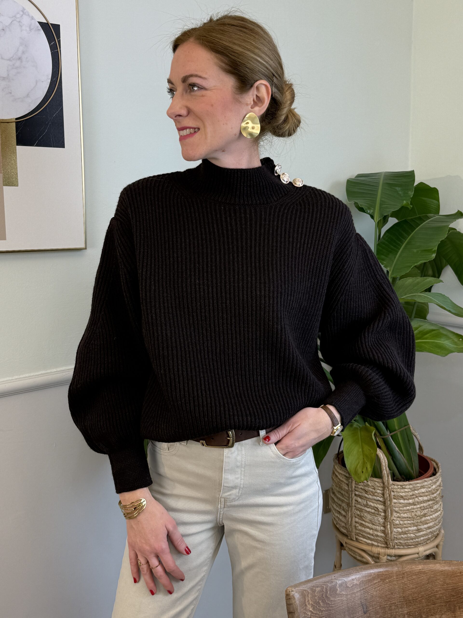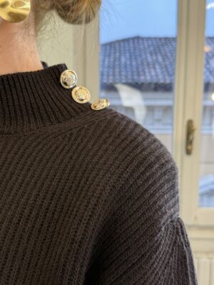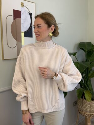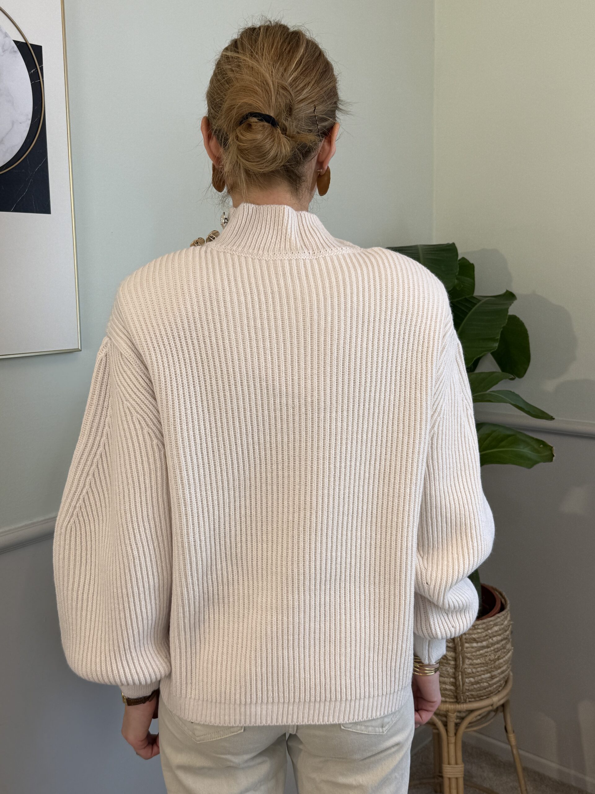 Maxi pull con collo lupetto in lavorazione costa inglese e maniche a palloncino.