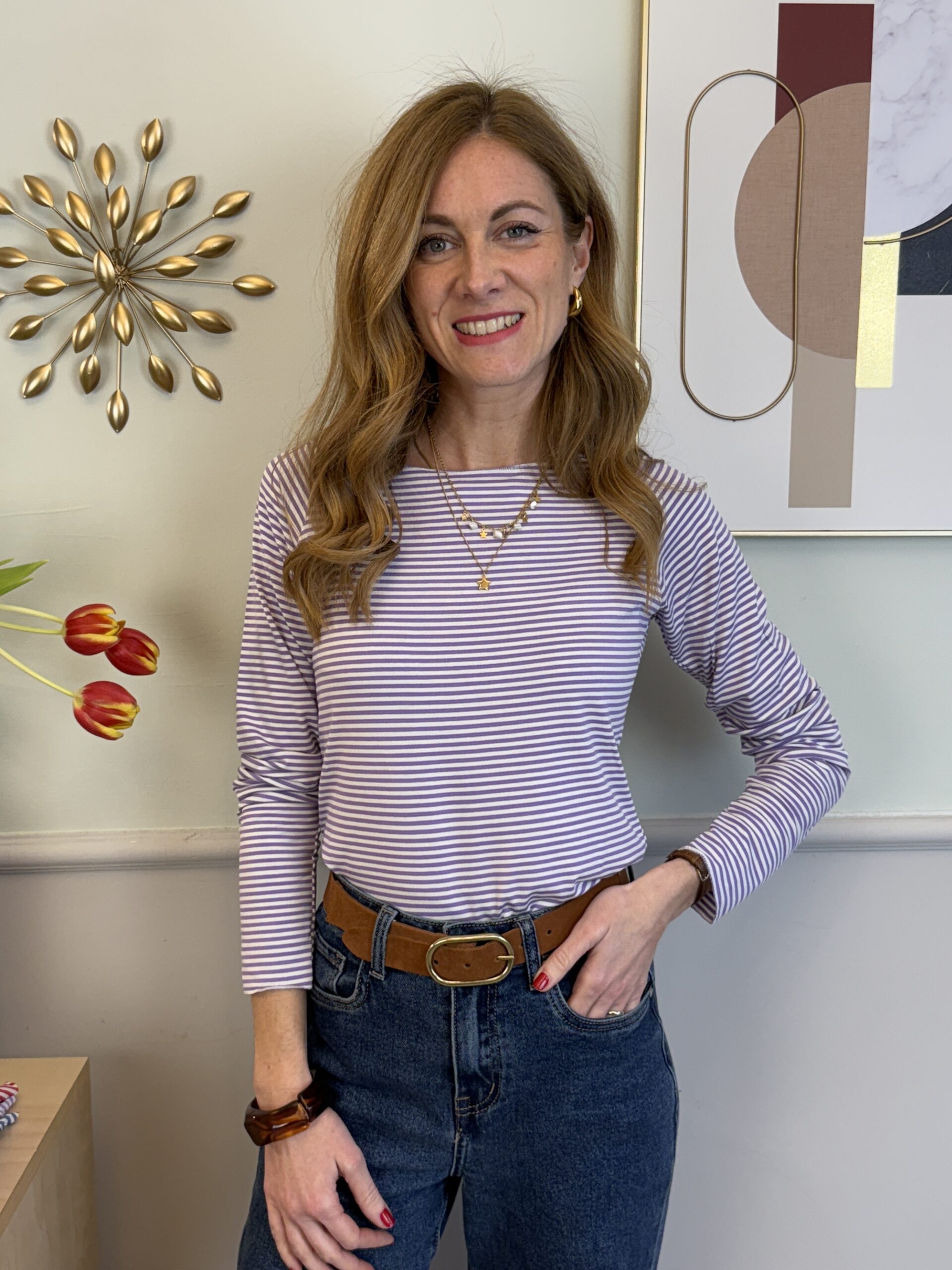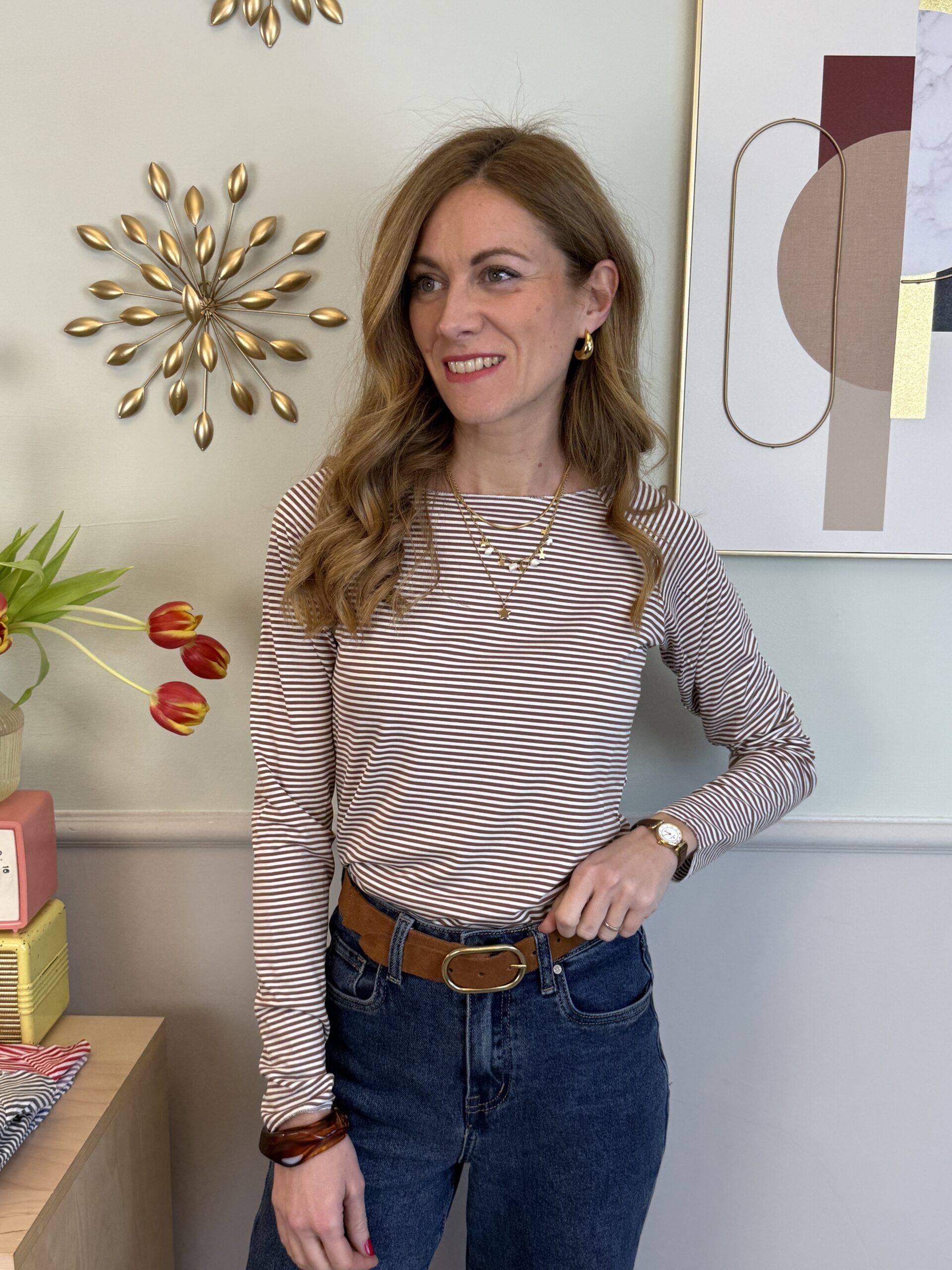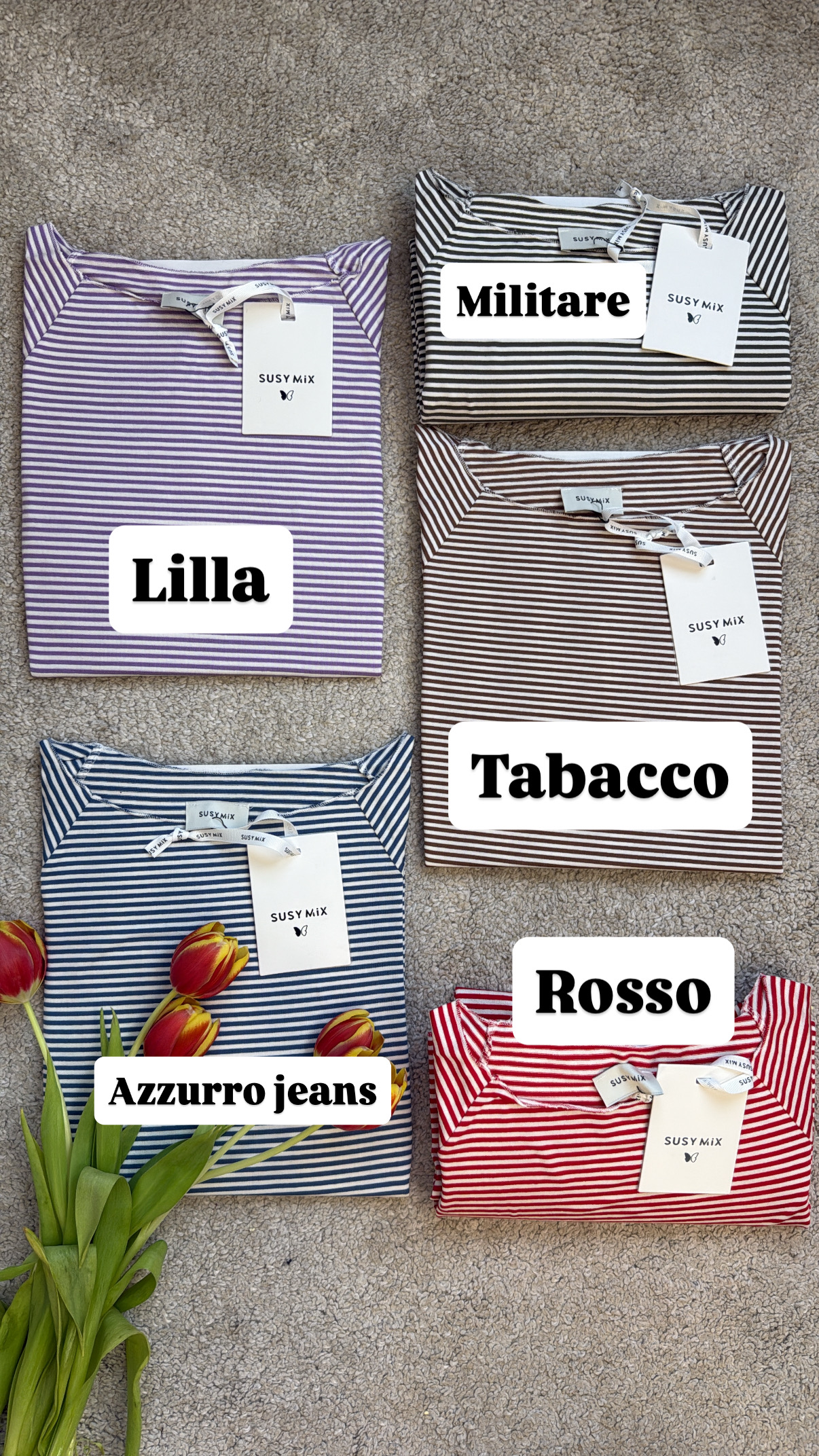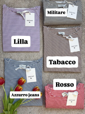 Maglia a manica lunga in fantasia rigata con collo a barchetta.
