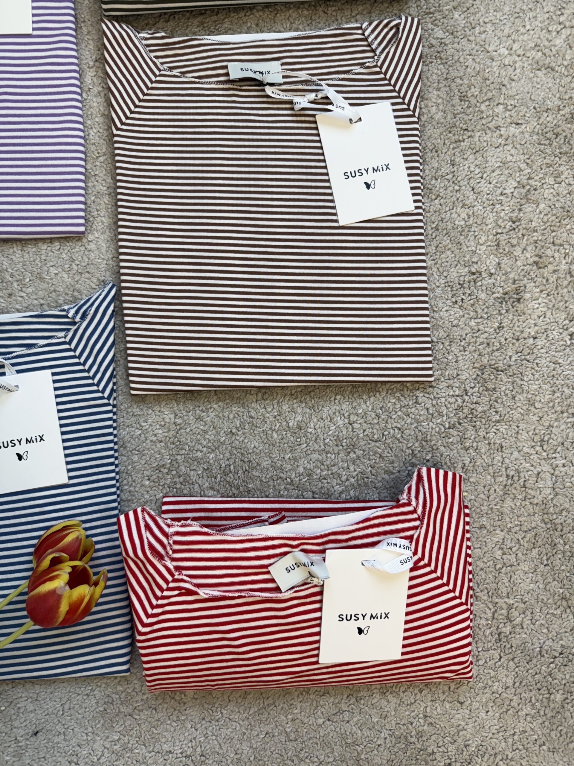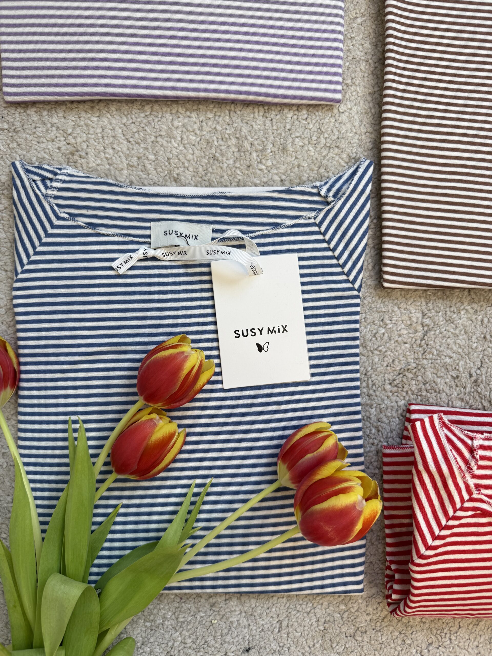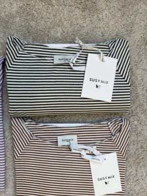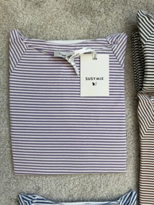 Maglia a manica lunga in fantasia rigata con collo a barchetta.