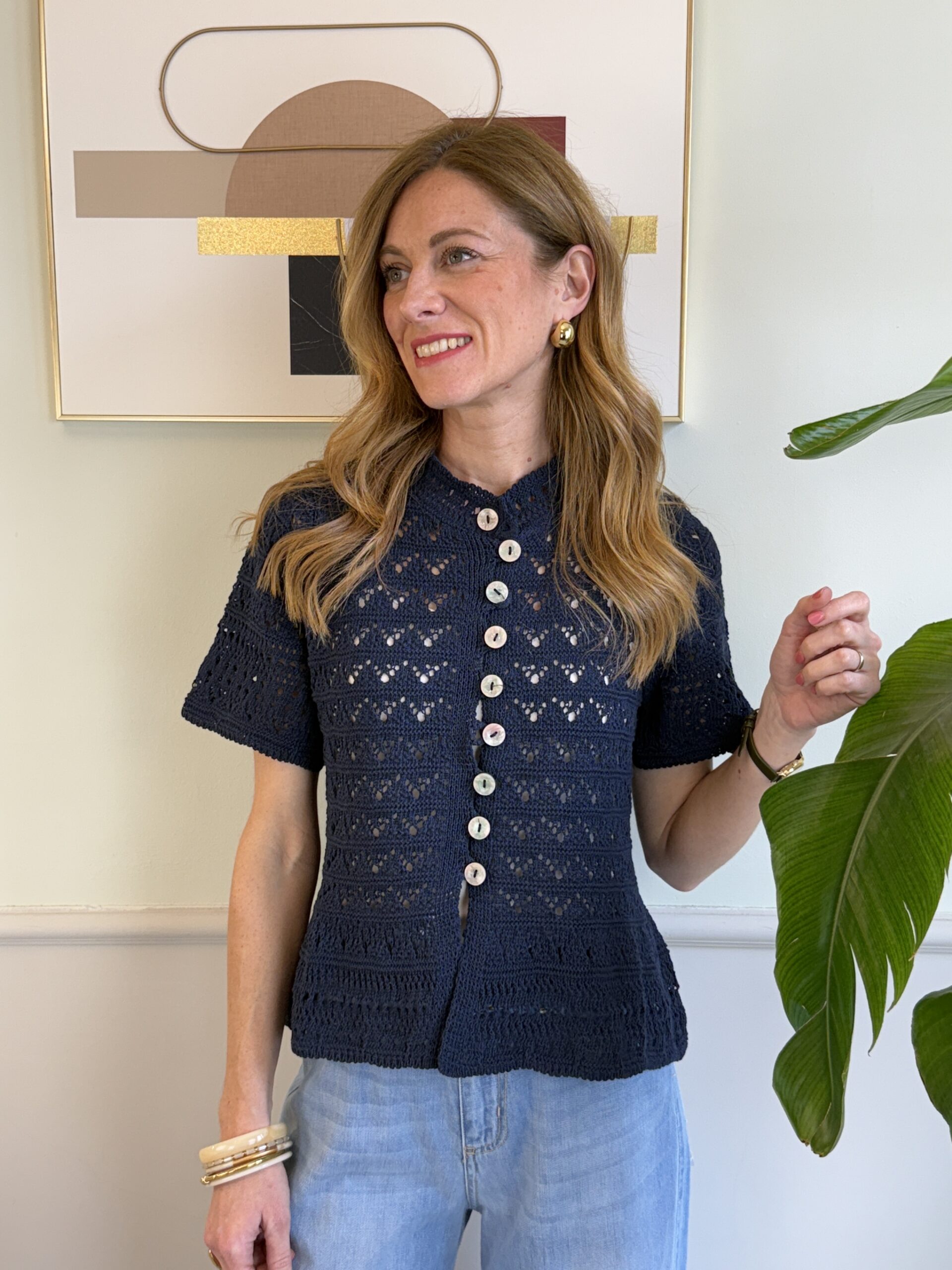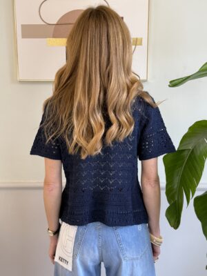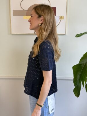 Maglia crochet a manica corta con bottoni perlati centrali e collo alla coreana.