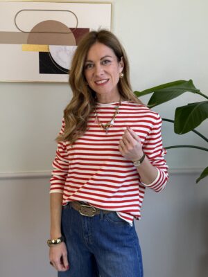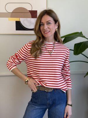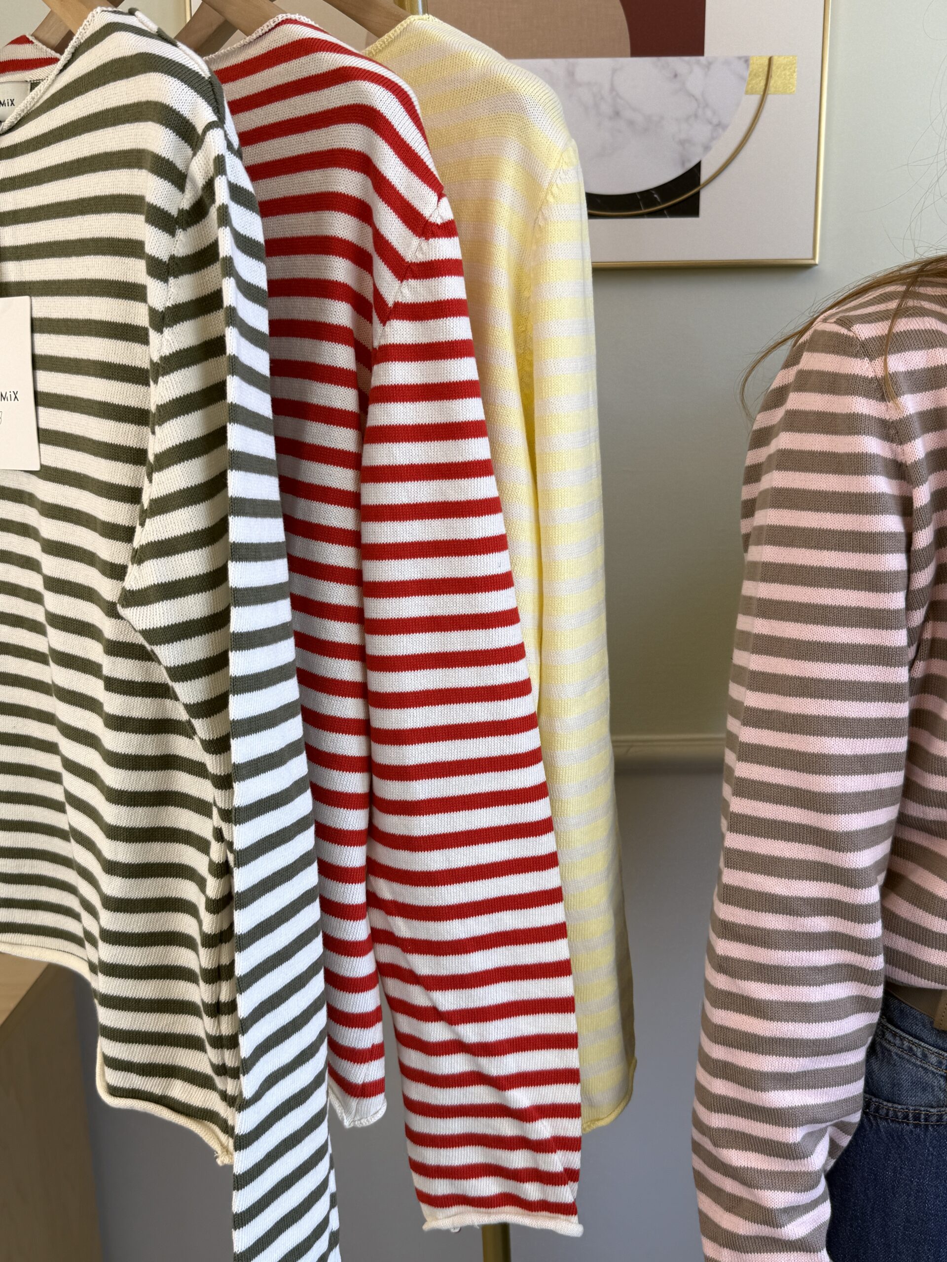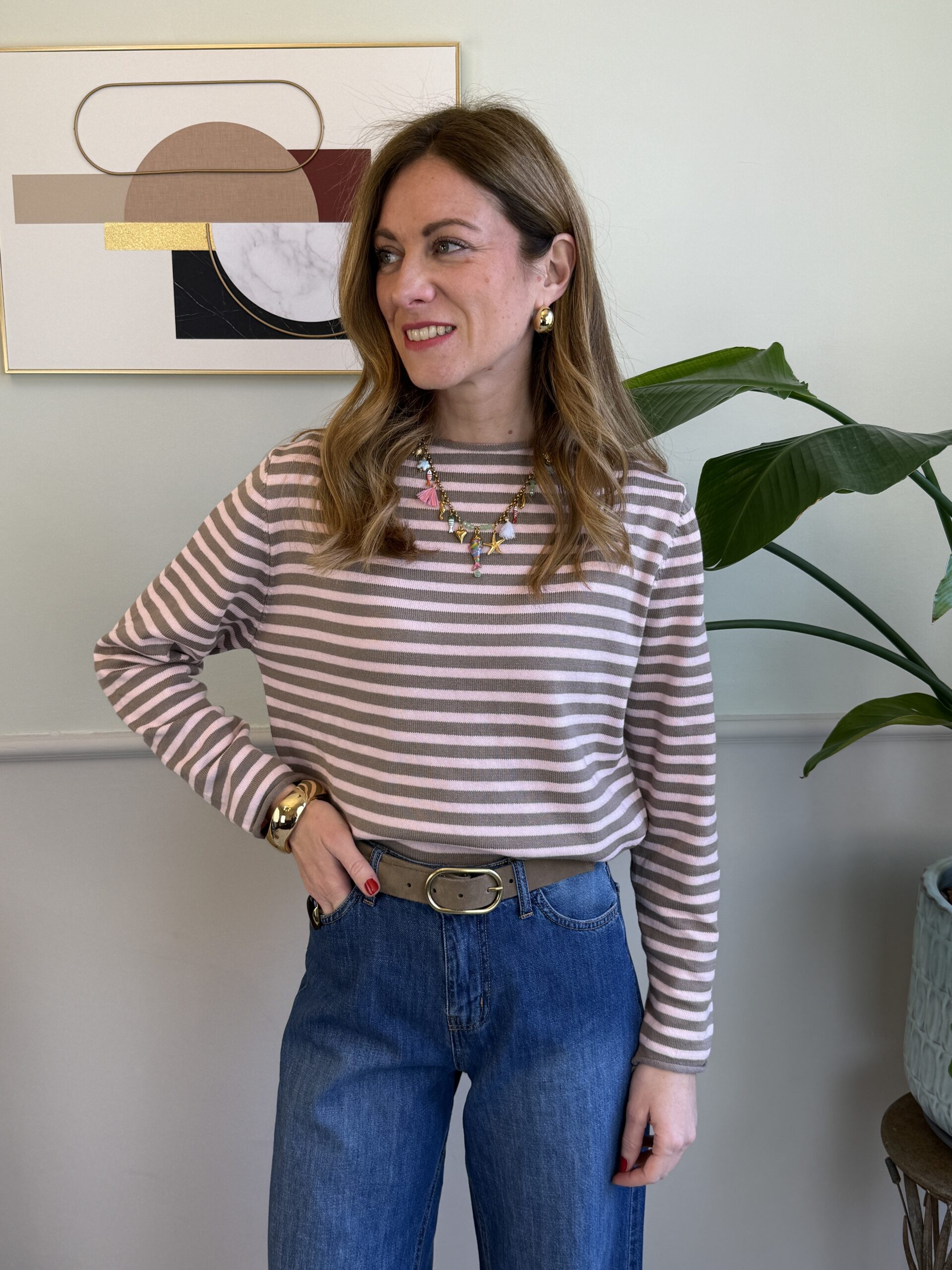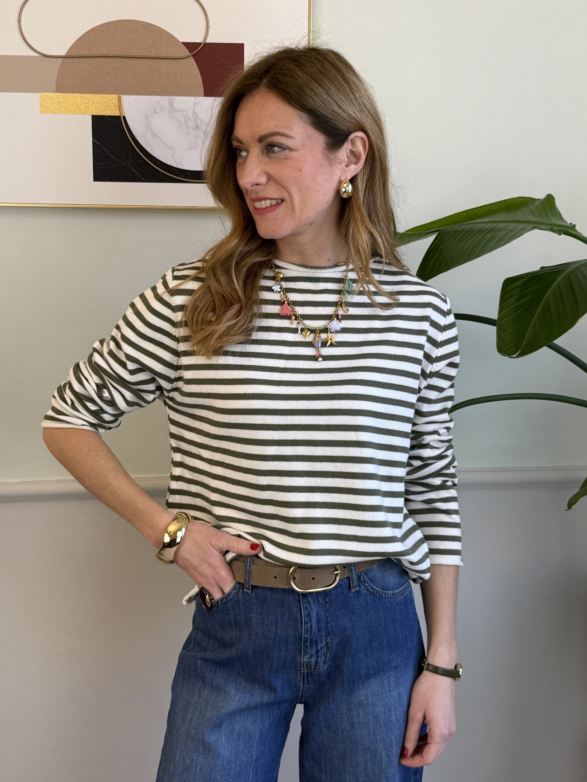 Maglia in cotone in fantasia rigata a manica lunga con collo leggermente a barchetta.