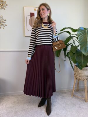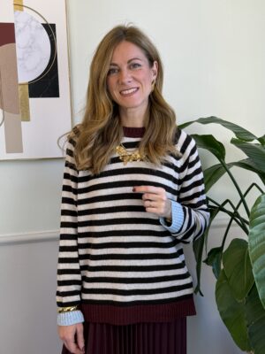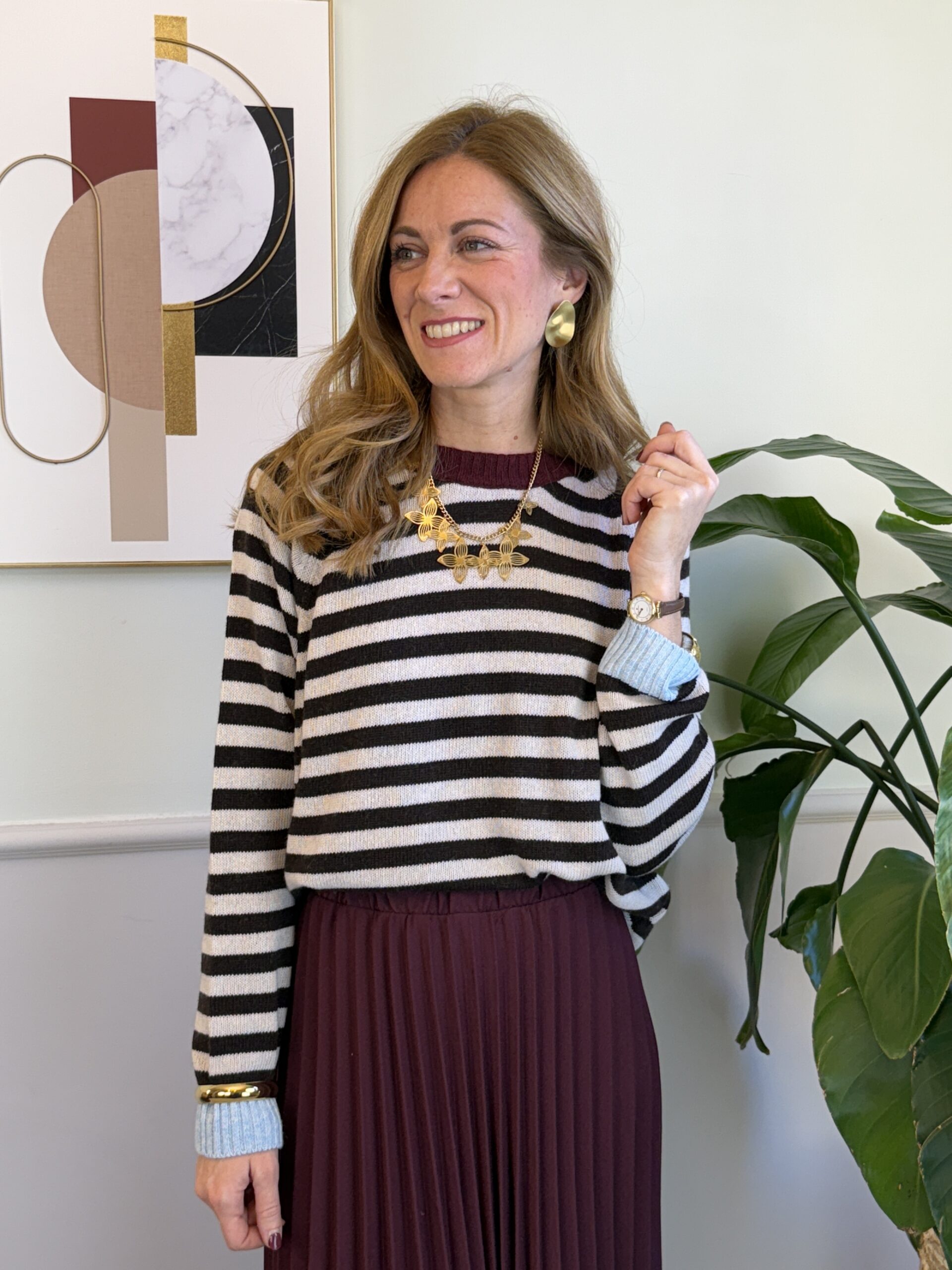 Maglia girocollo con righe moro e panna, girocollo e bordo inferiore a contrasto bordeaux e polsini celeste.