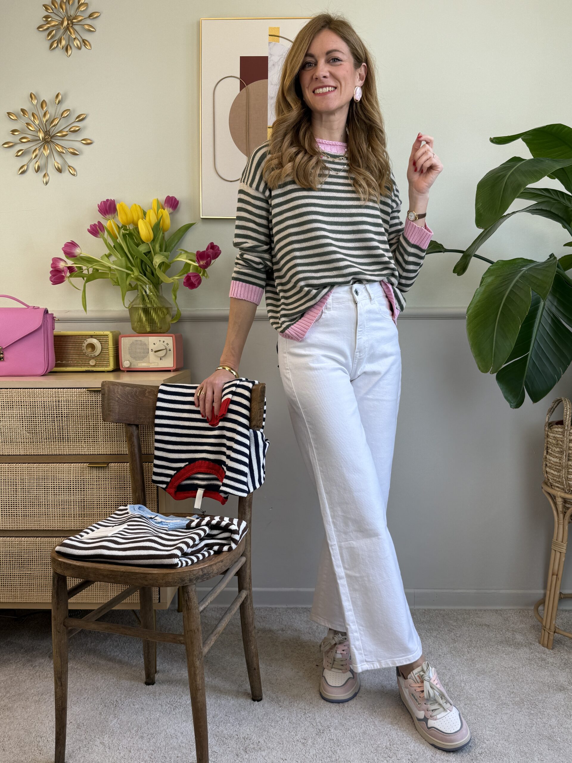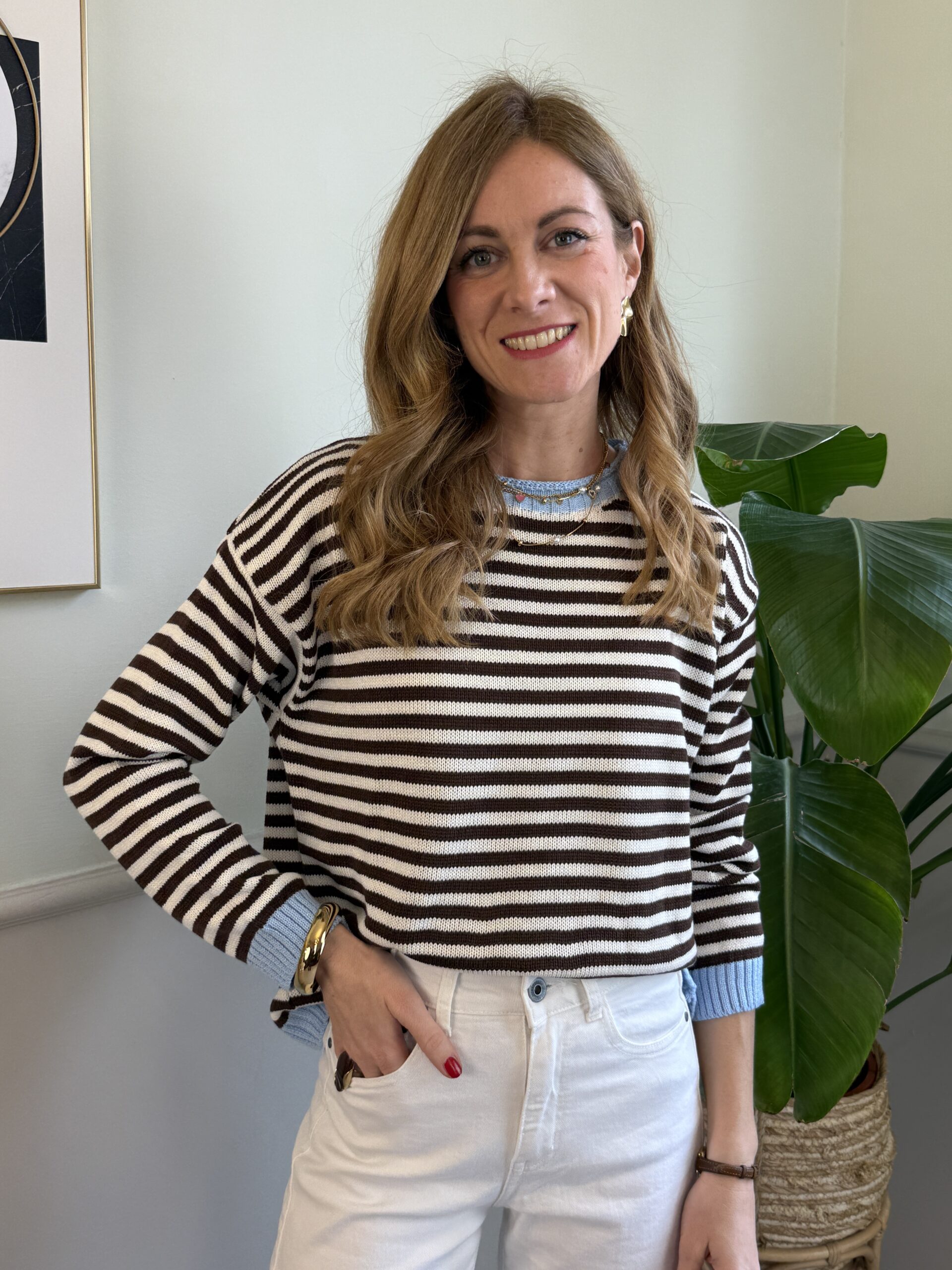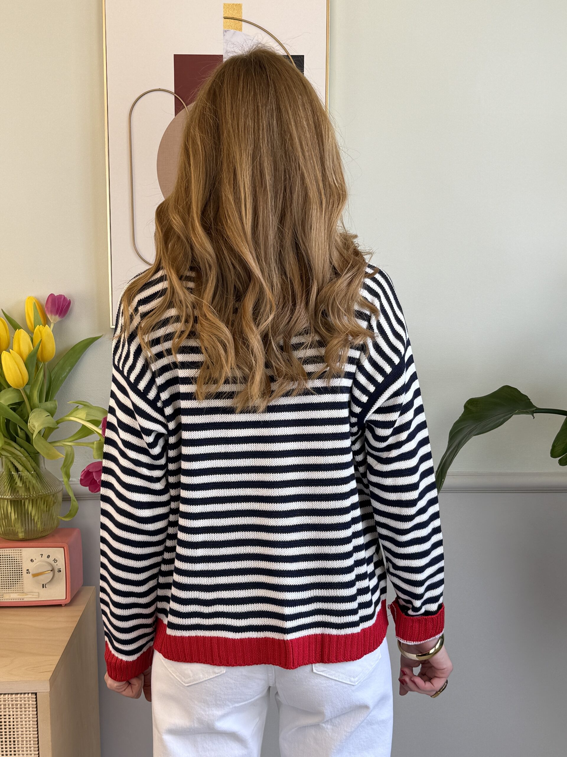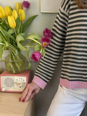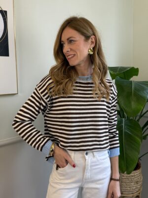 Maglia a righe con orli a cantrasto, manica lunga e spalla scesa.