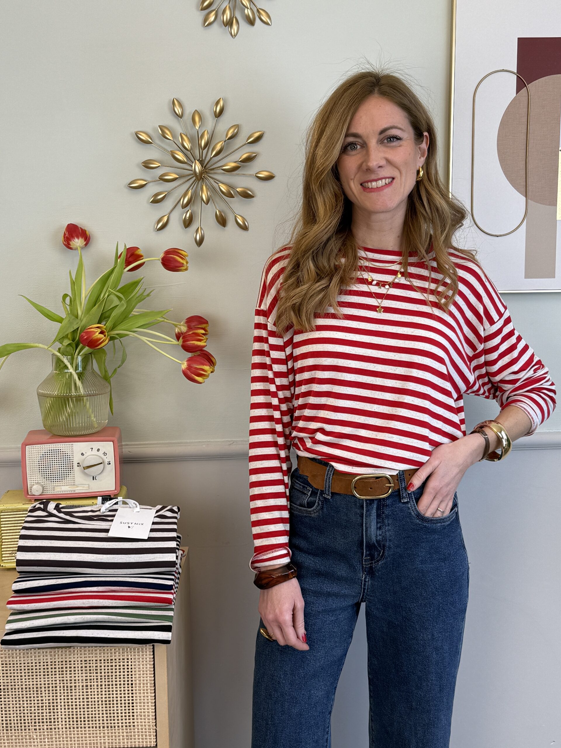 Maglia girocollo modello scatolina in fantasia rigata, manica lunga e spalla scesa.