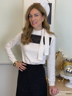 Grazioso maglioncino dotato di cravattino ( o fiocchetto), con inserto in pizzo nero trasparente.