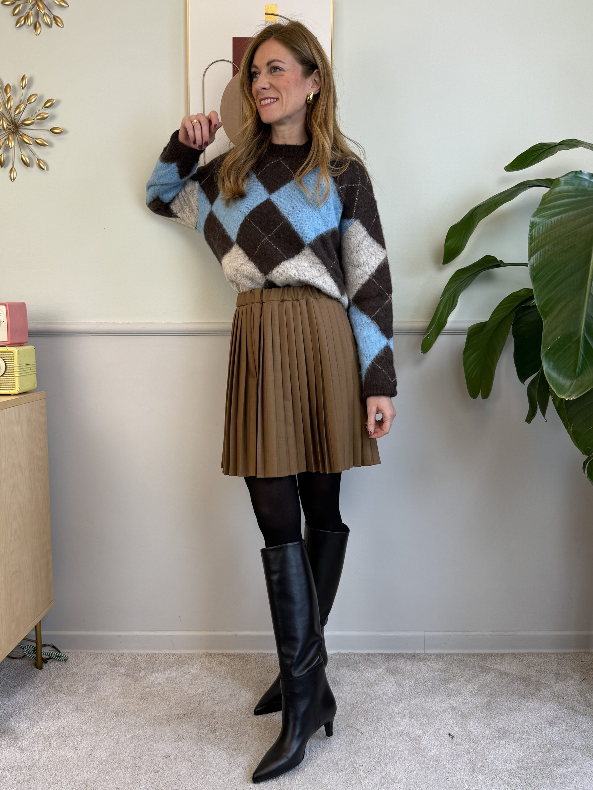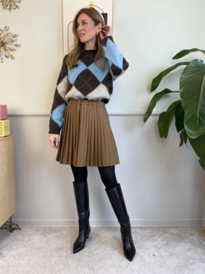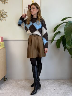 Maglione con fantasia a rombi sui toni del moro, azzurro, beige. Presenta filo in lurex,