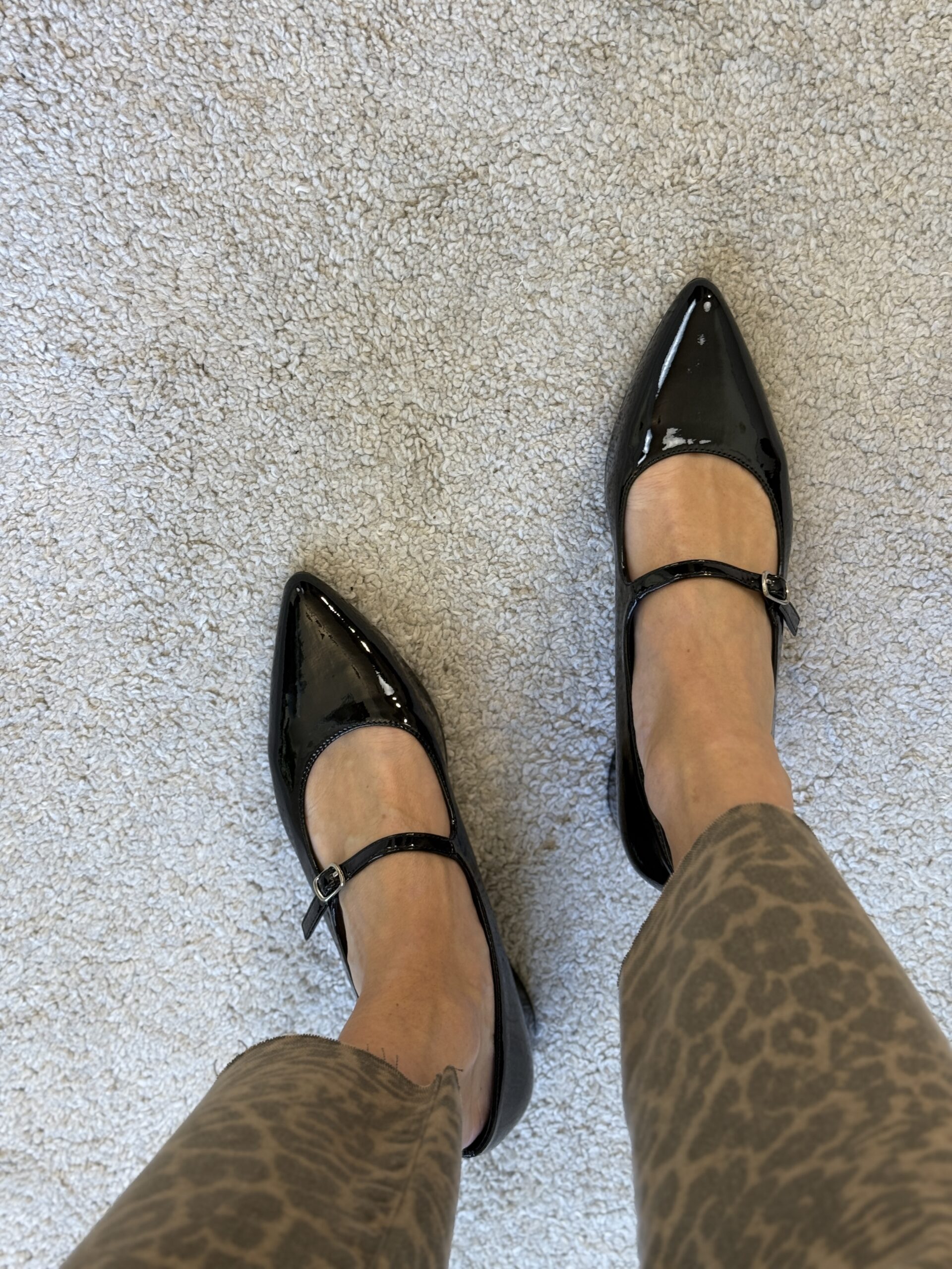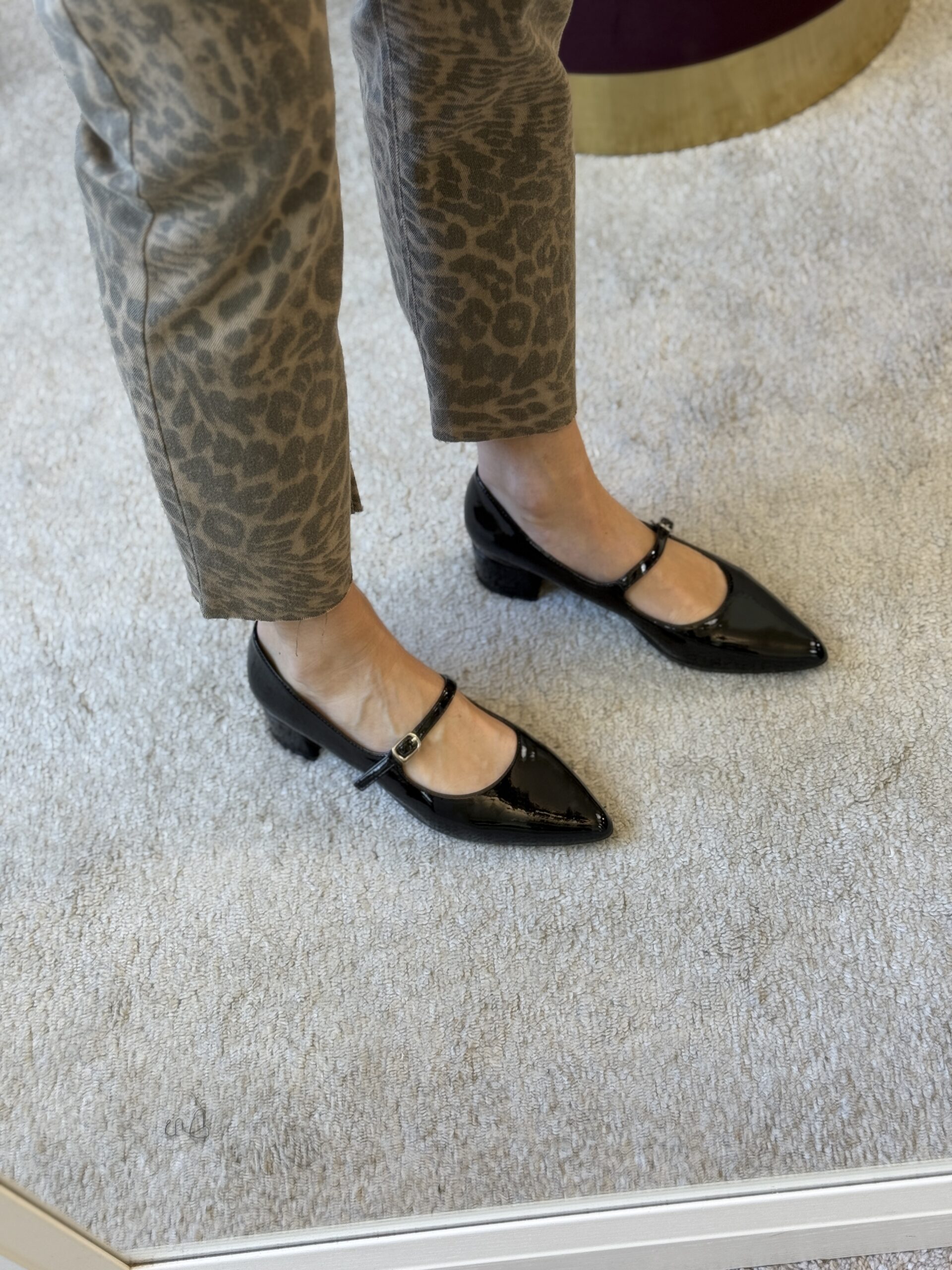 Deliziose décolleté modello Mary Jane a punta, in vernice con fibbia argentata.