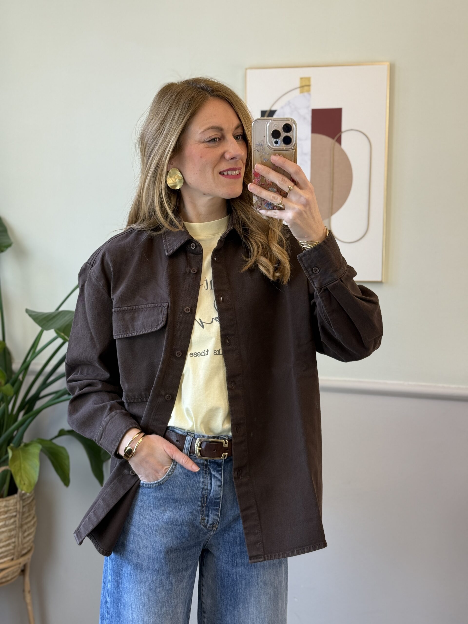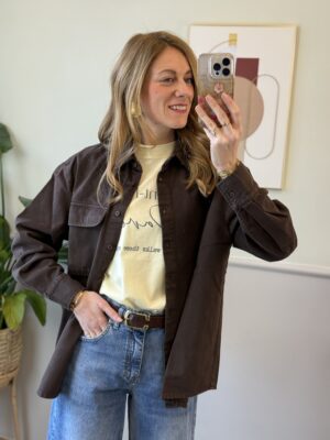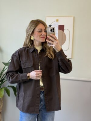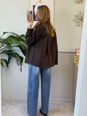 Maxi camicia di jeans con spalla scesa, manica lunga, sfondo posteriore e tasca applicata sul davanti.