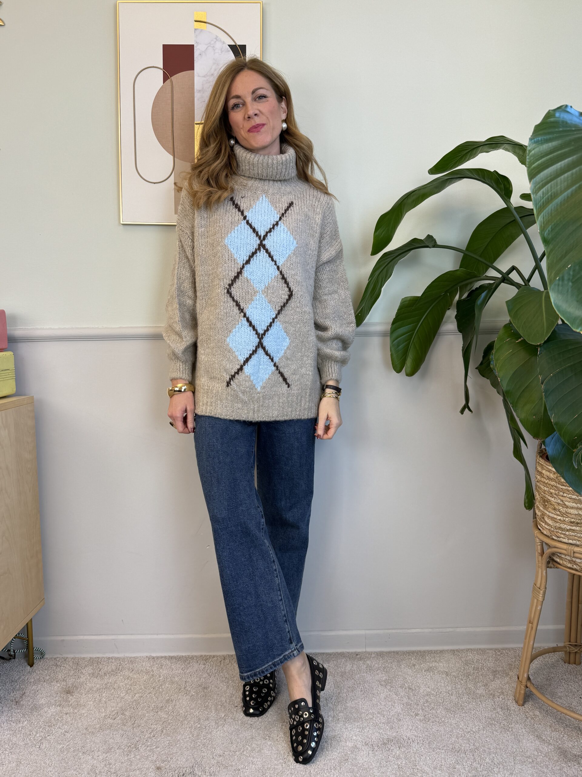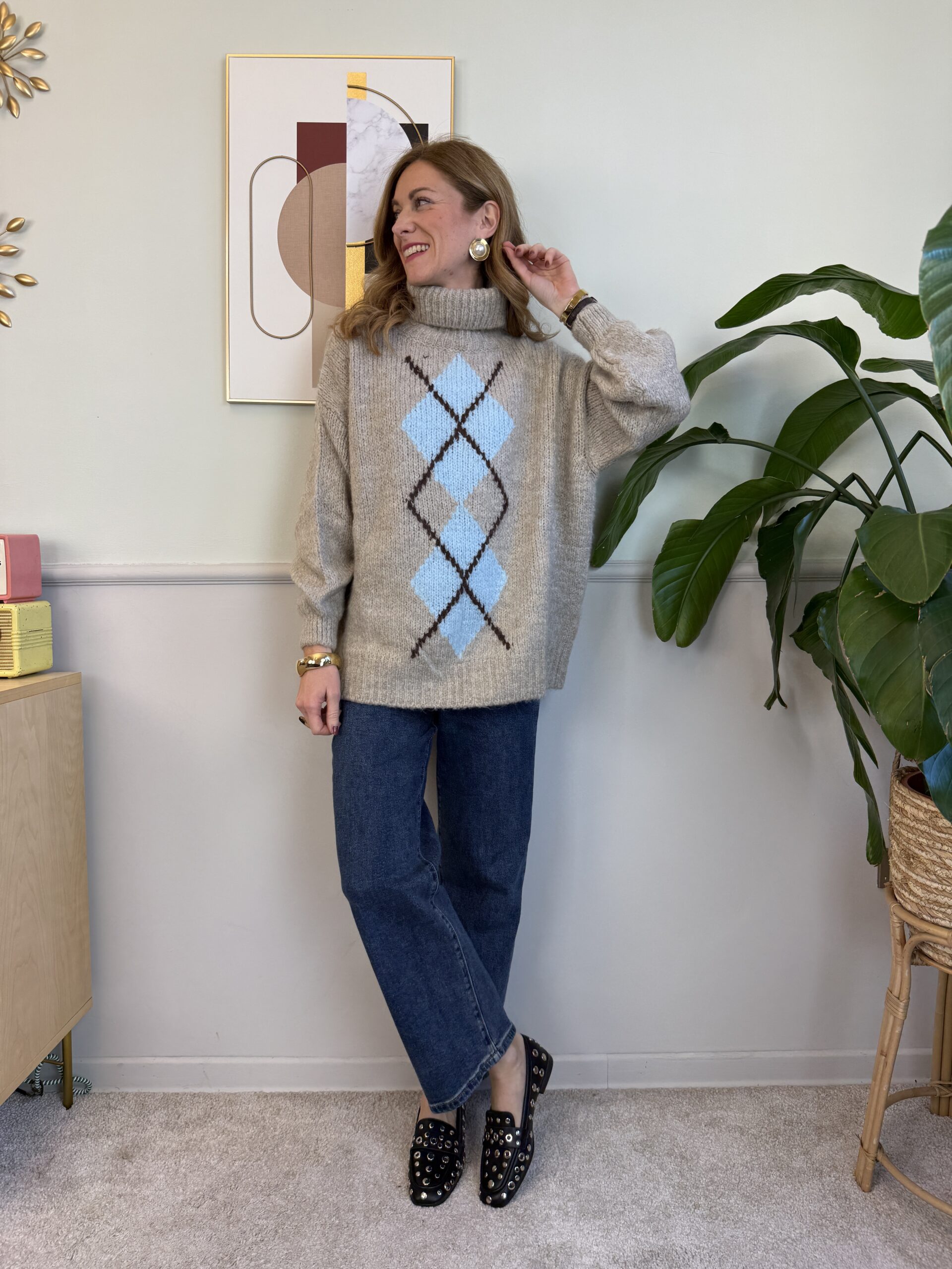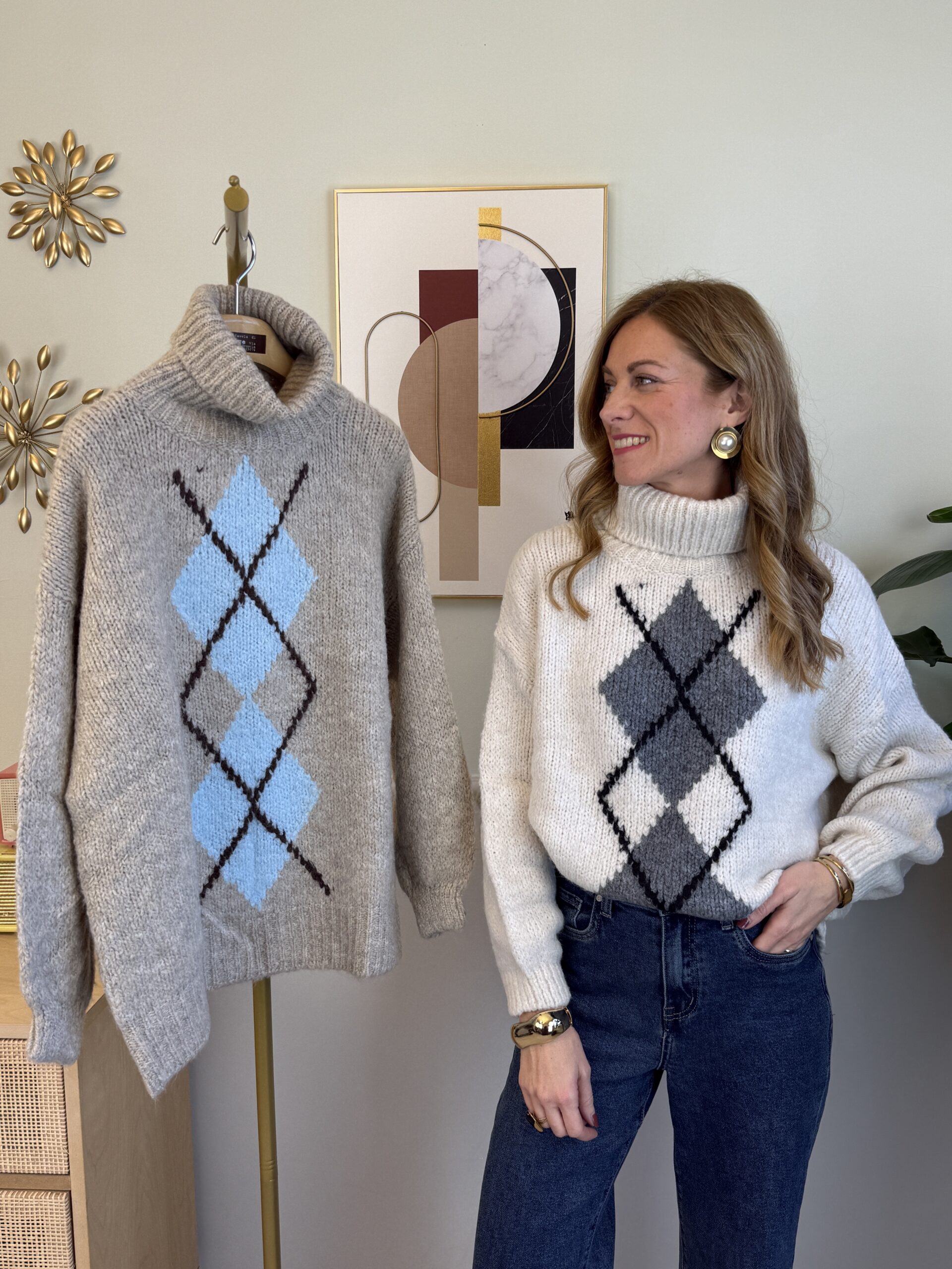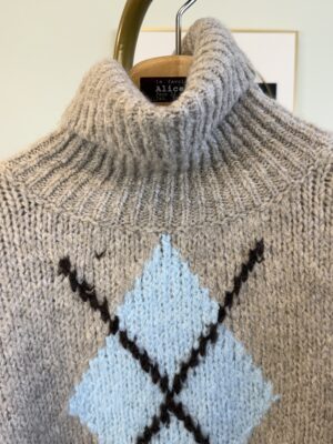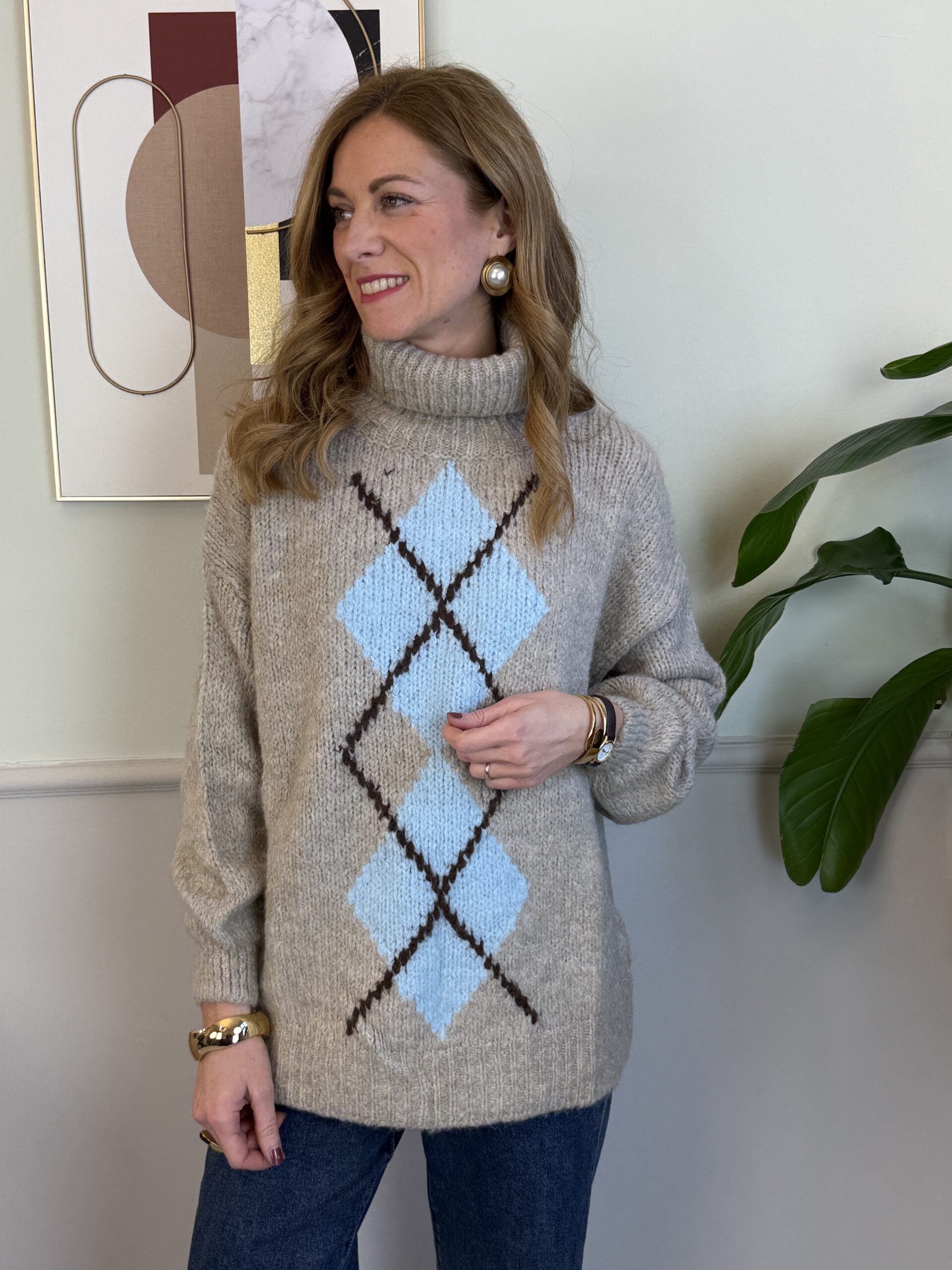Maxi pull con rombi centrali, collo ciambella e manica palloncino.