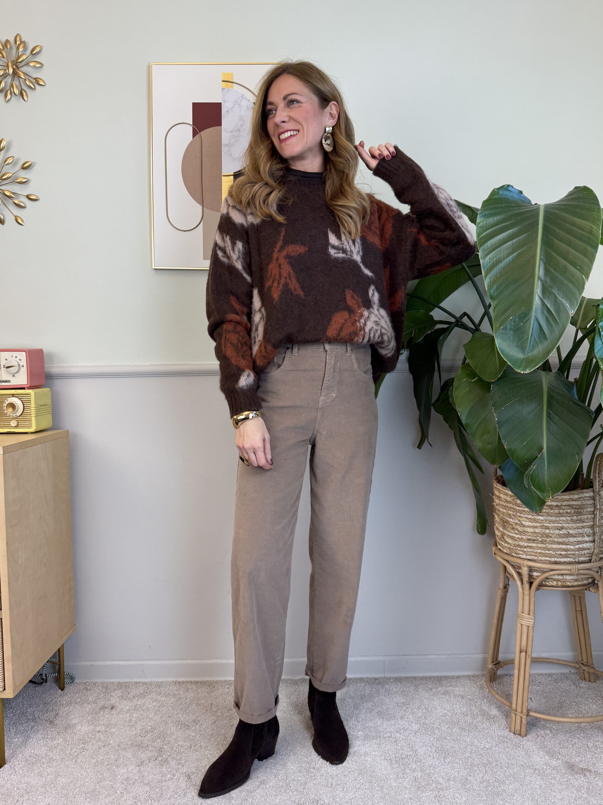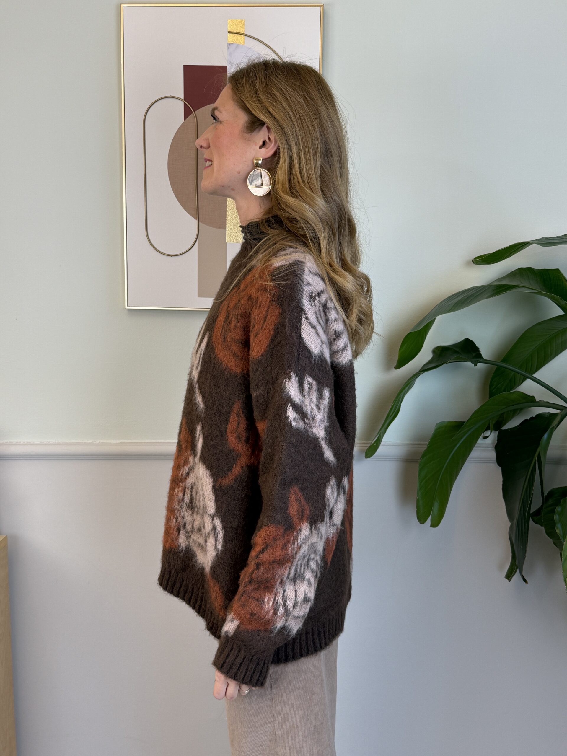 Maxi pull girocollo con maxi rose, manica lunga e spalla scesa.