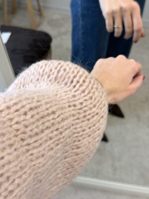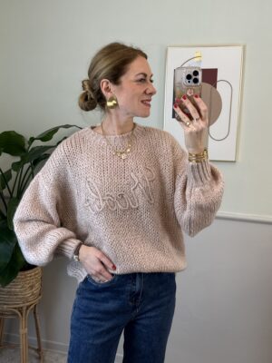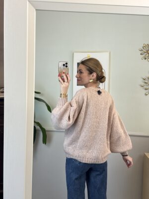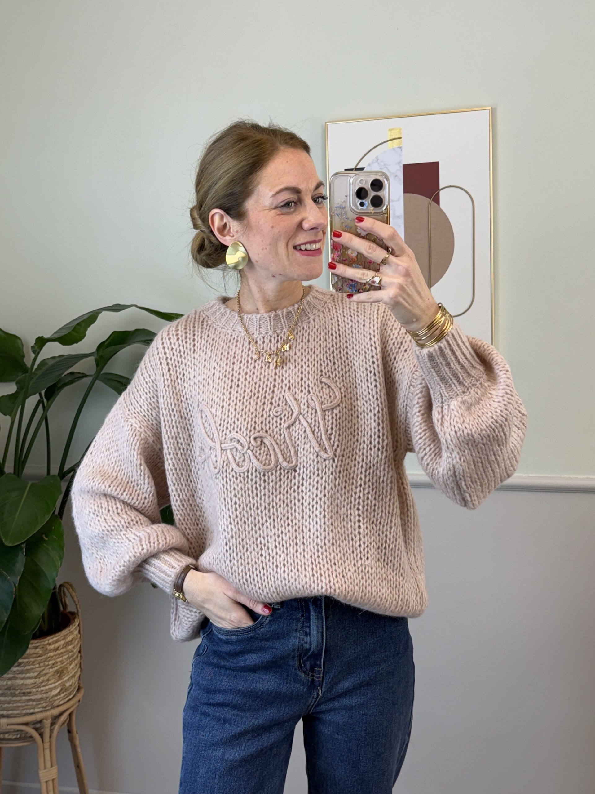 Maxi pull girocollo in lavorazione punto pannocchia con scritta Vicolo ricamata sul davanti.