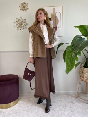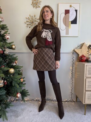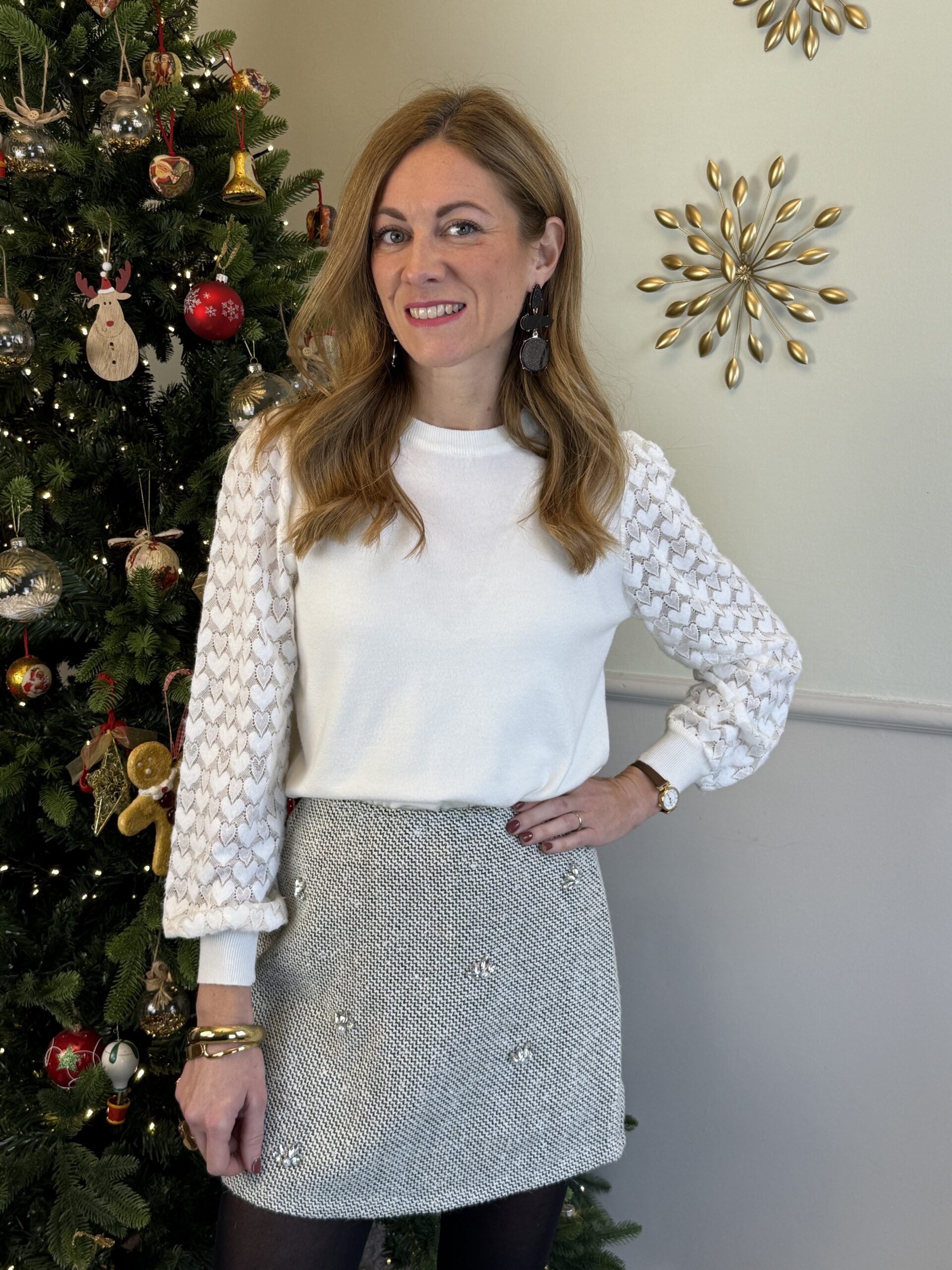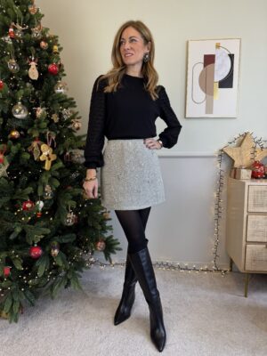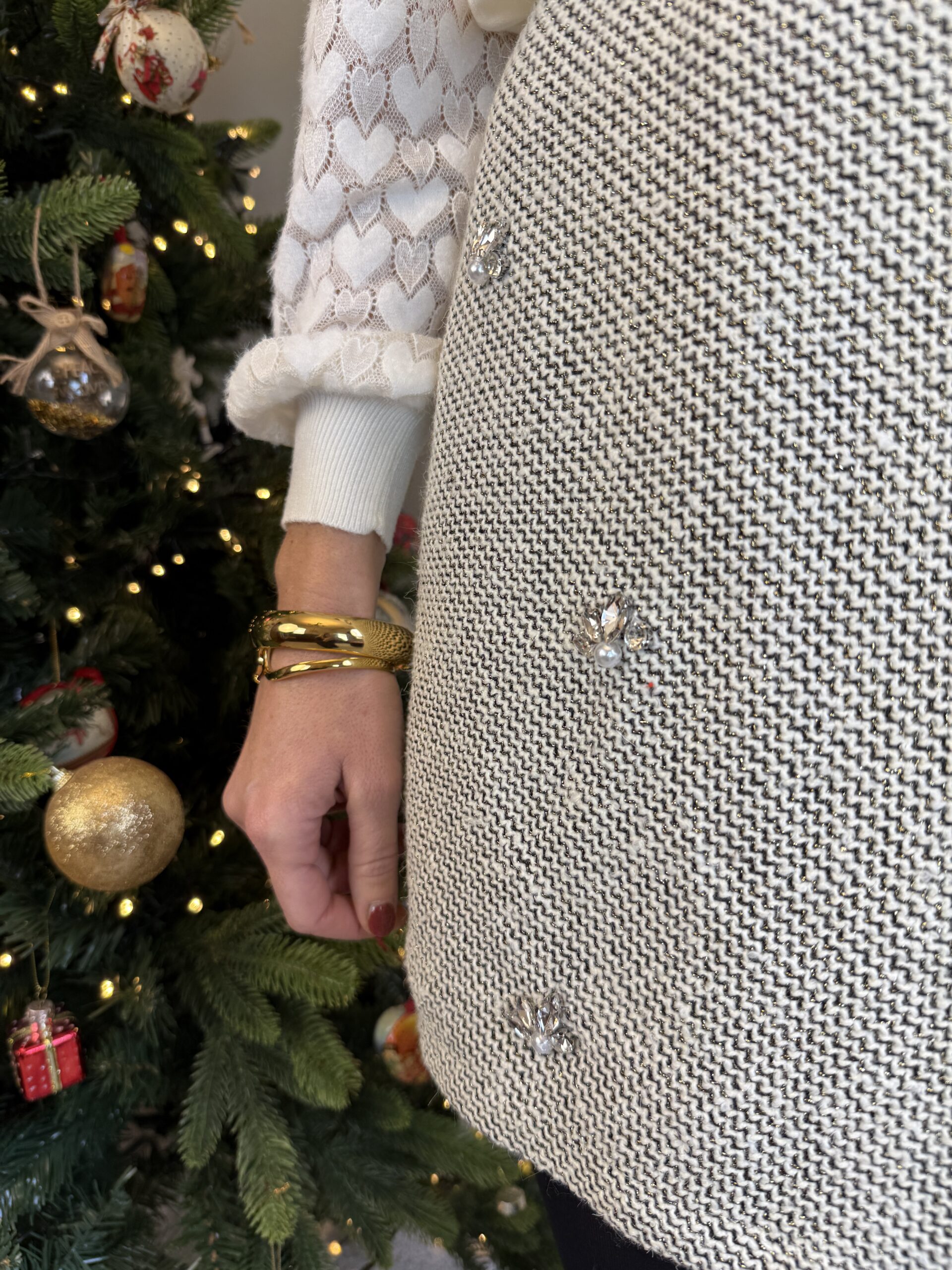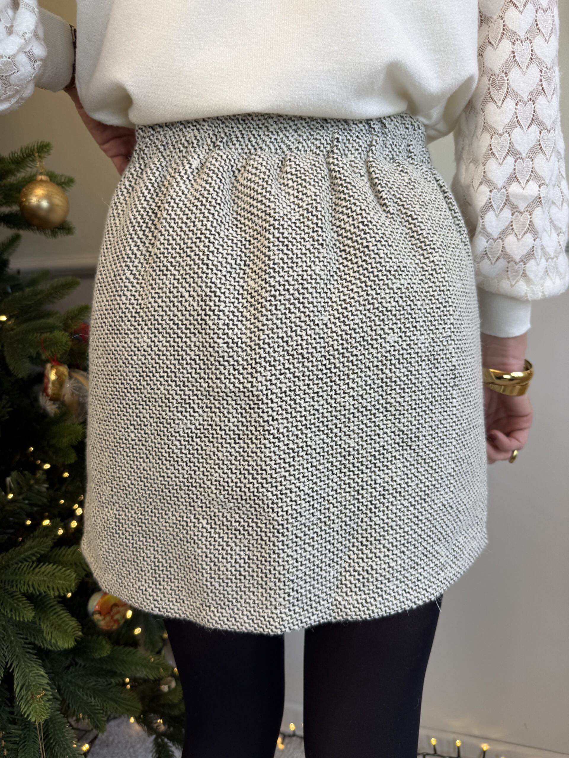 Mini gonna con lurex dorato cabochon e perline, foderato con elastico in vita posteriore.